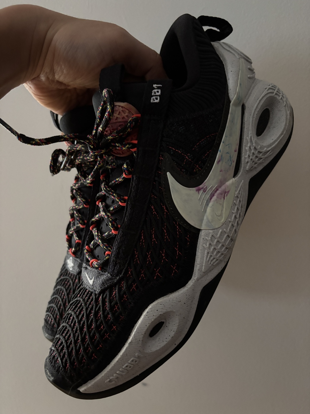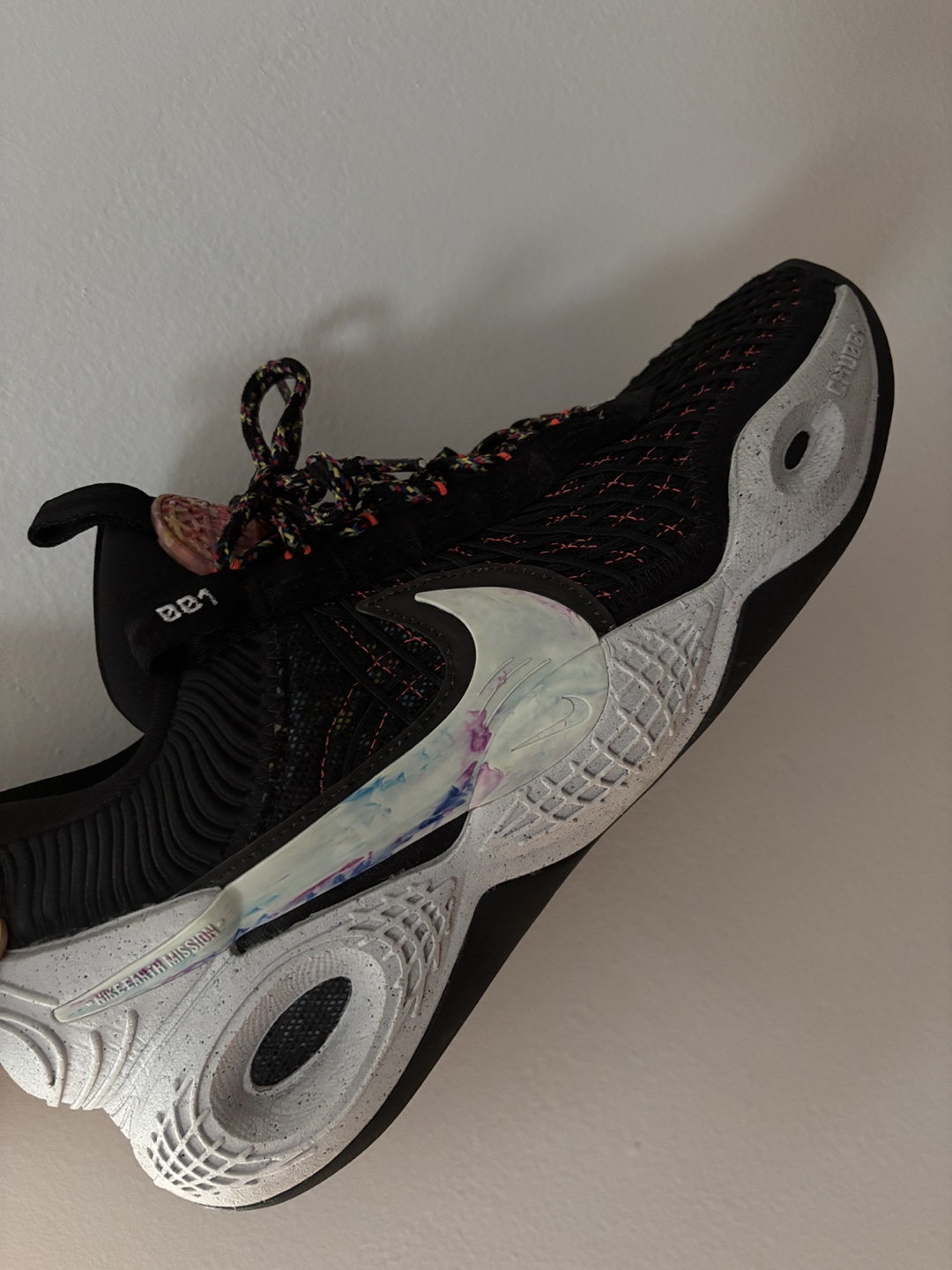 Men's Nike BB7 basketball shoes. Black and white colorway. Unique design details. Multicolored laces.