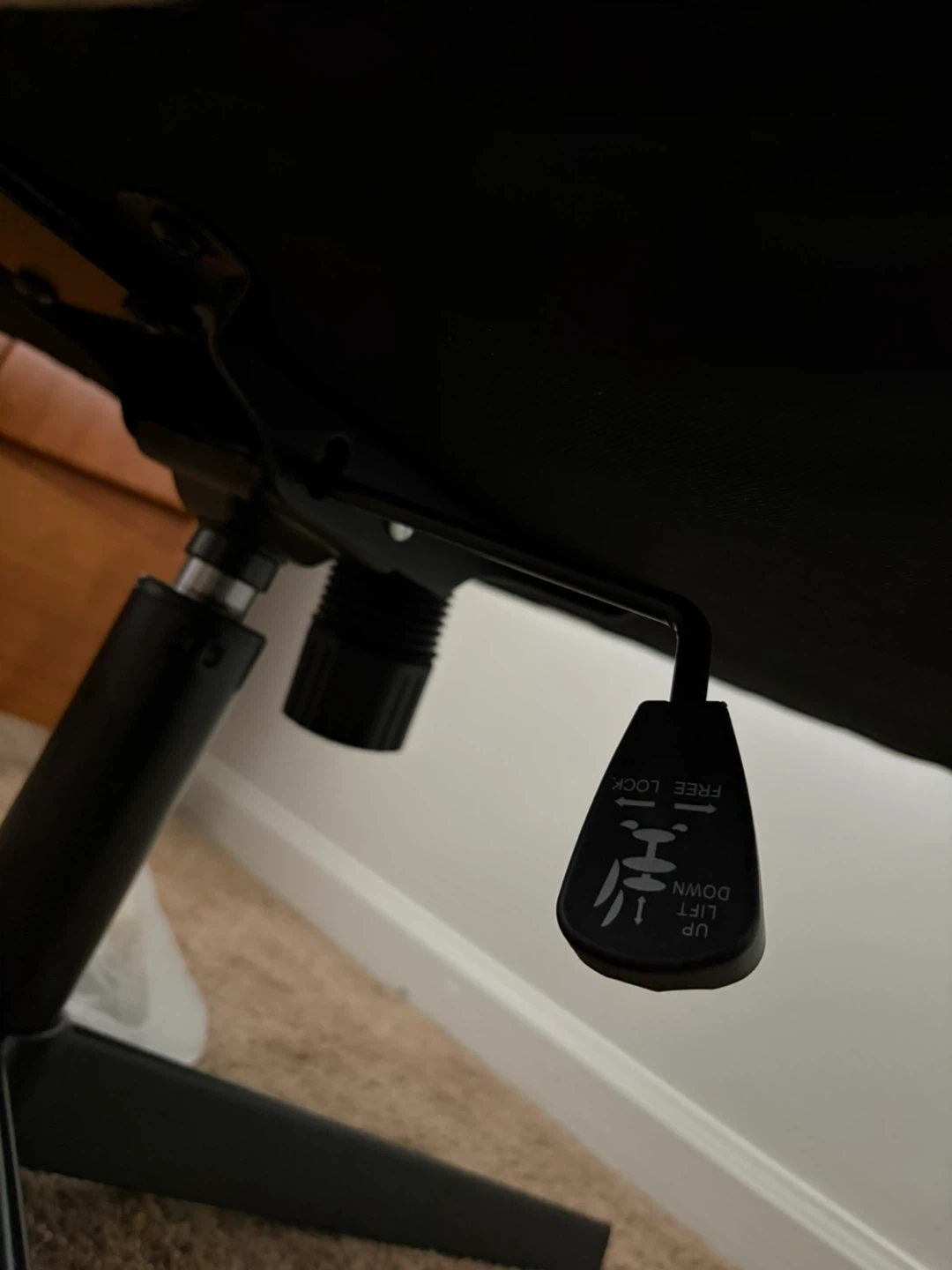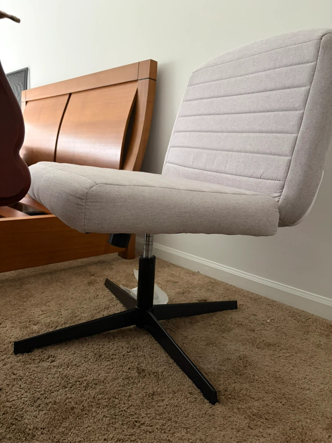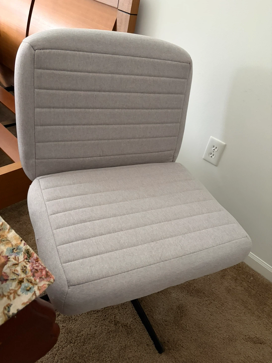 This is a light gray office chair. It features a cushioned seat and back with horizontal stitching. The chair has a five-star base with casters for easy mobility. Its height is adjustable.