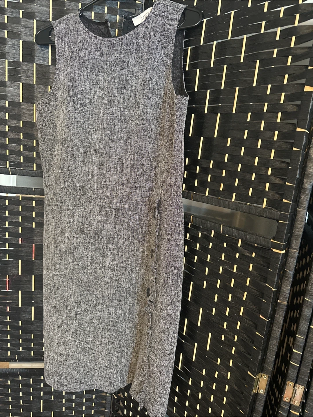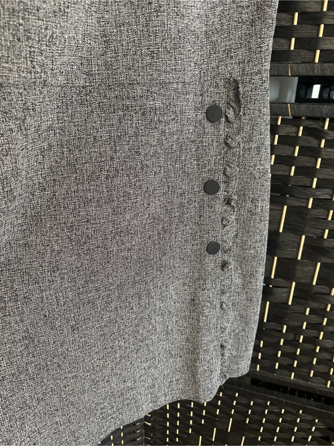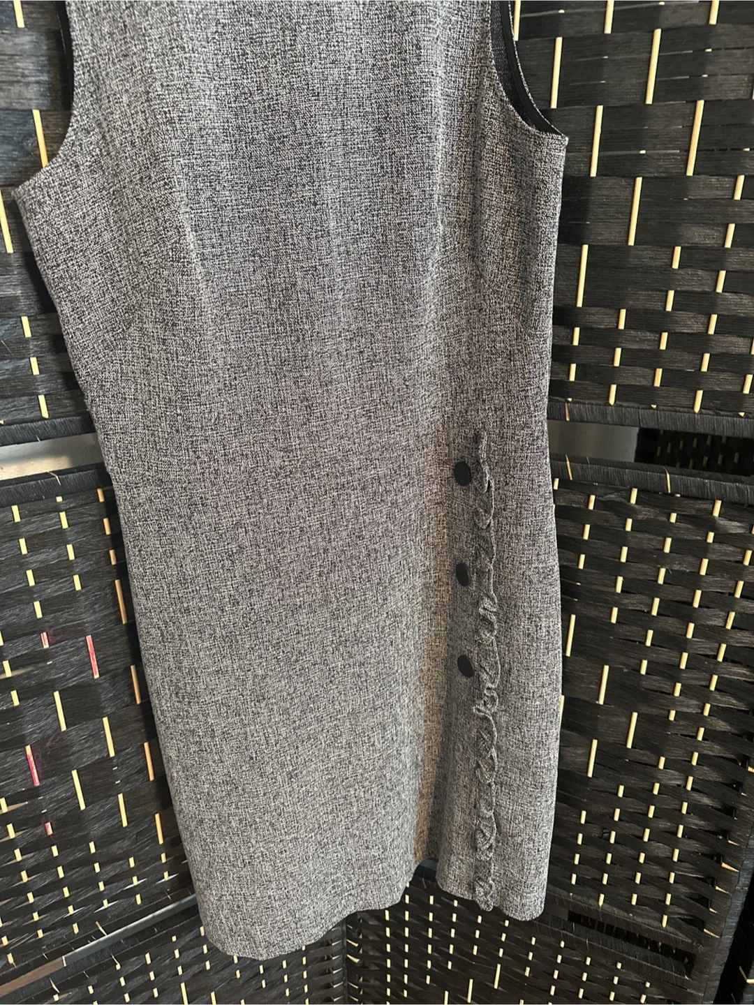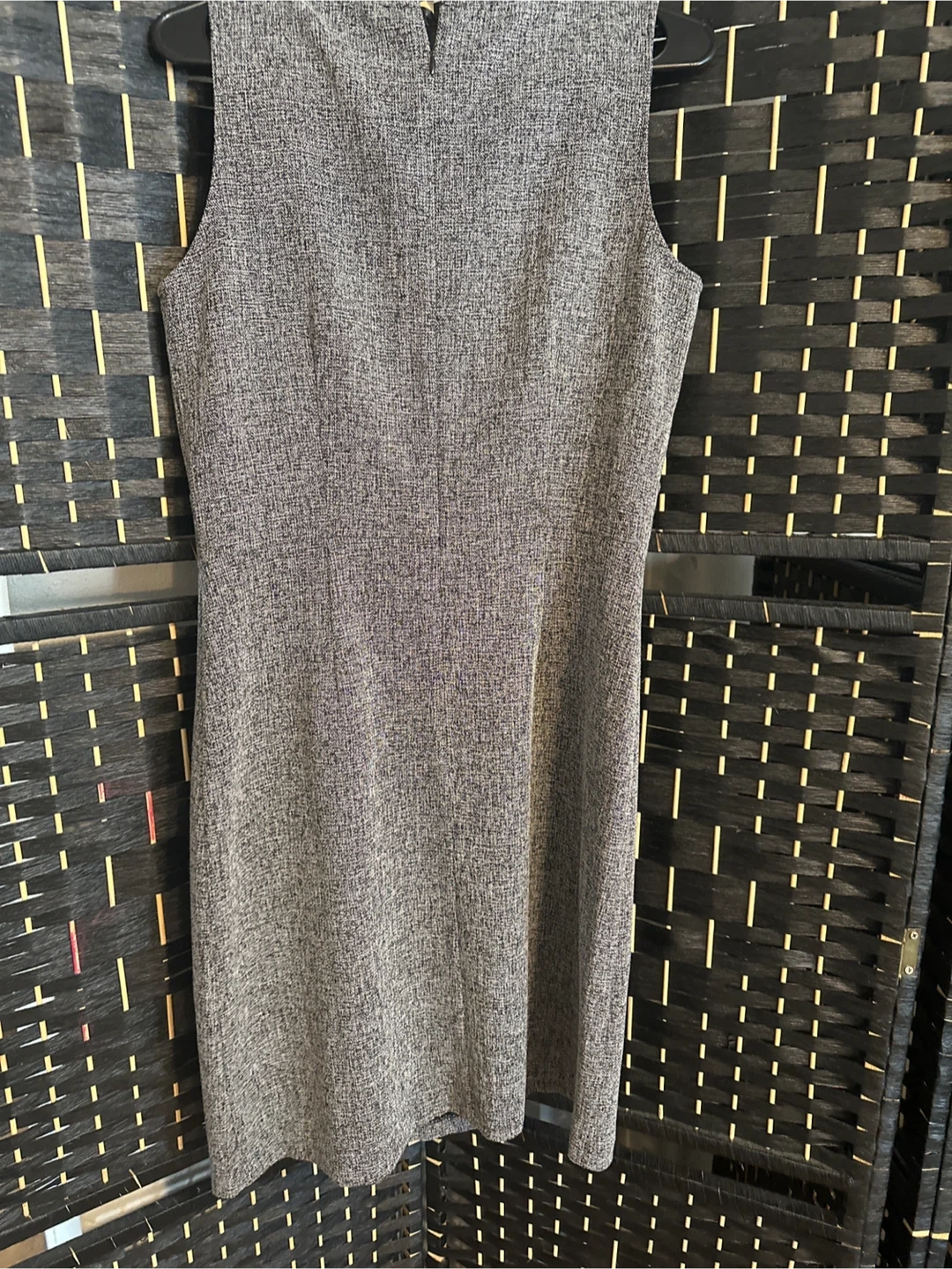 This LOFT dress comes in a grey, textured fabric. It's sleeveless and features decorative buttons down one side. Perfect for casual or business wear!