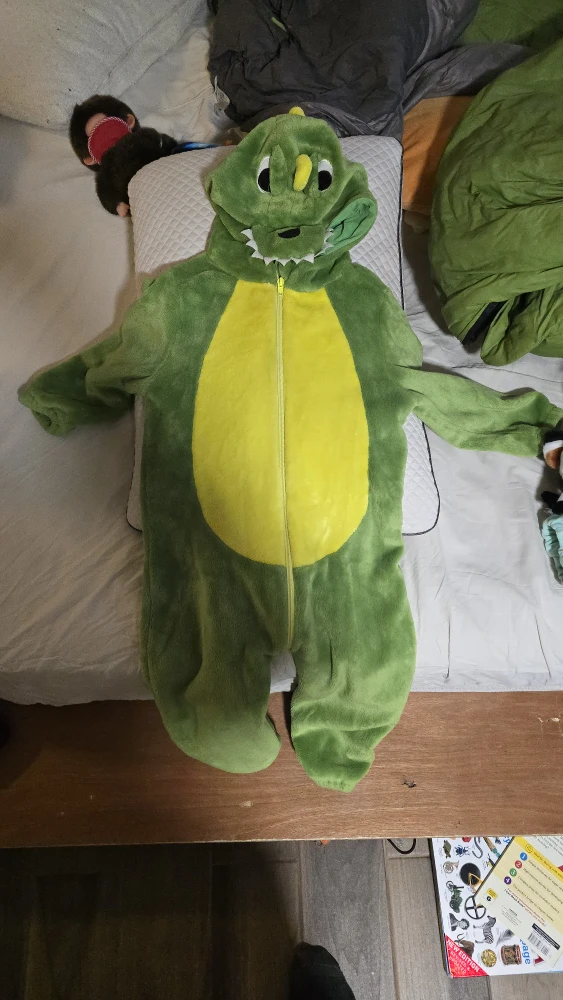 Here's a fun and cozy dinosaur onesie! It's green with a yellow belly and has a cute dinosaur hood. Perfect for dress-up or just lounging around