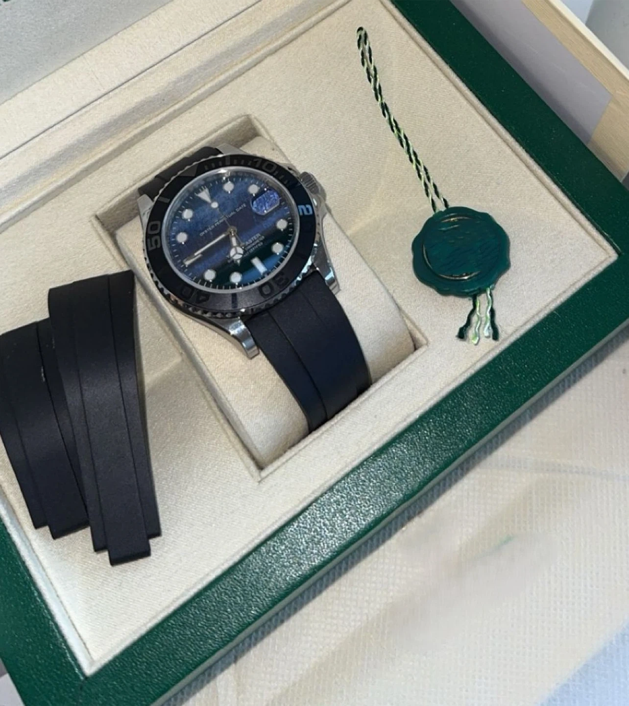 60YachtMaster with a beautiful blue dial and a comfortable black rubber strap. It comes with the box and is in great condition. This watch is a stylish and reliable timepiece! Swiss movement