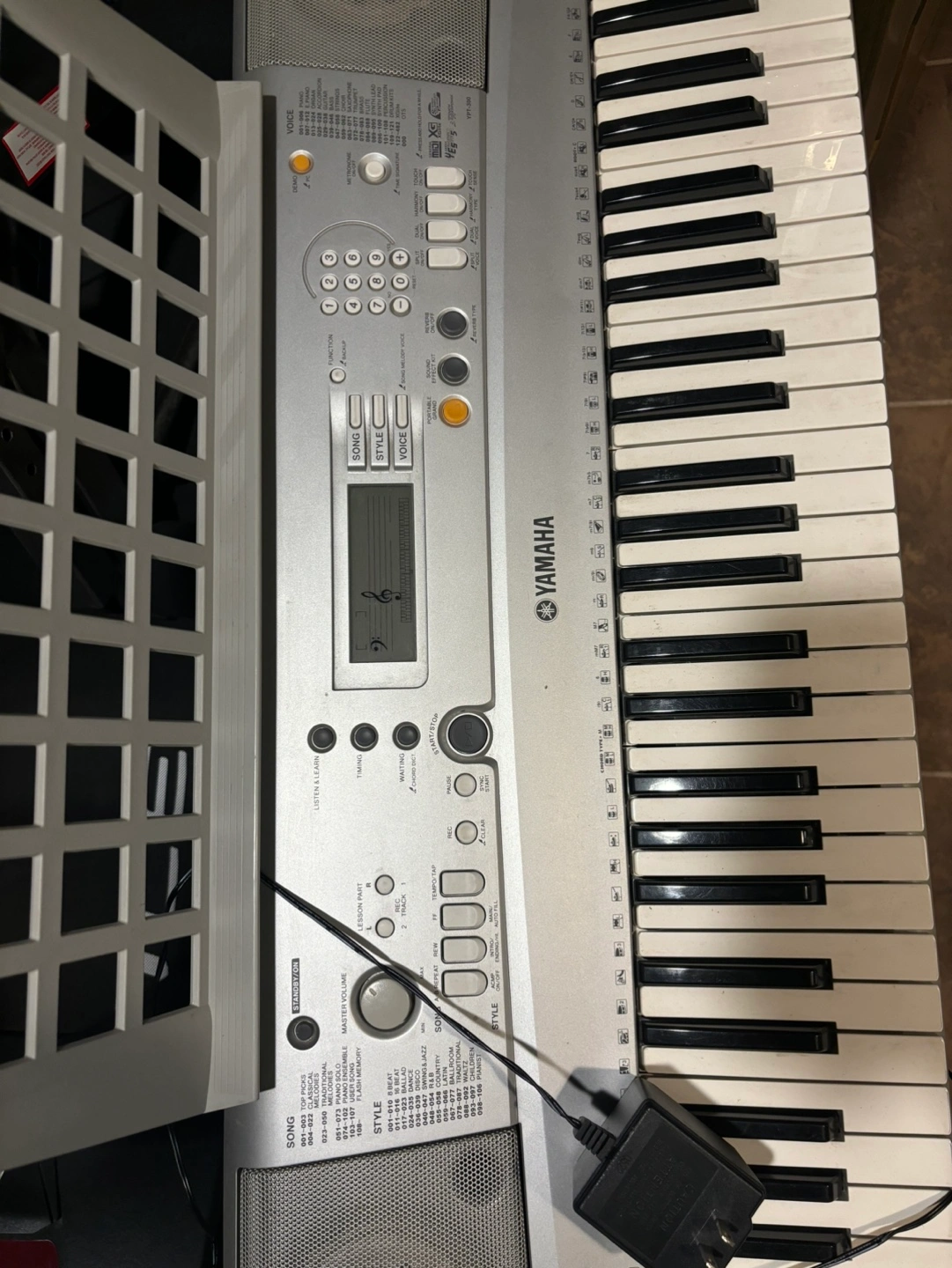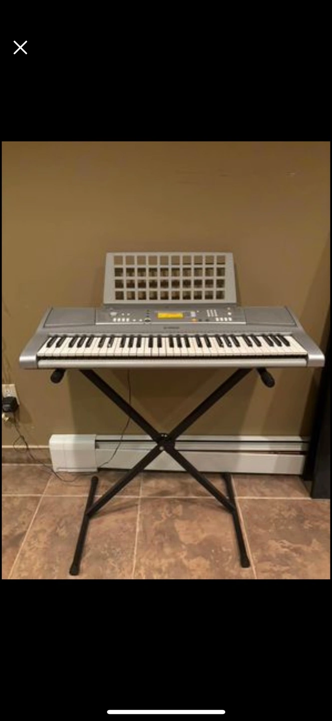 Slim and stays secure on top of the stand (comes with the stand). The keyboard has 36 keys. Easy plug in and start-up button. Works like brand new… and includes music books and CDs to learn!!!