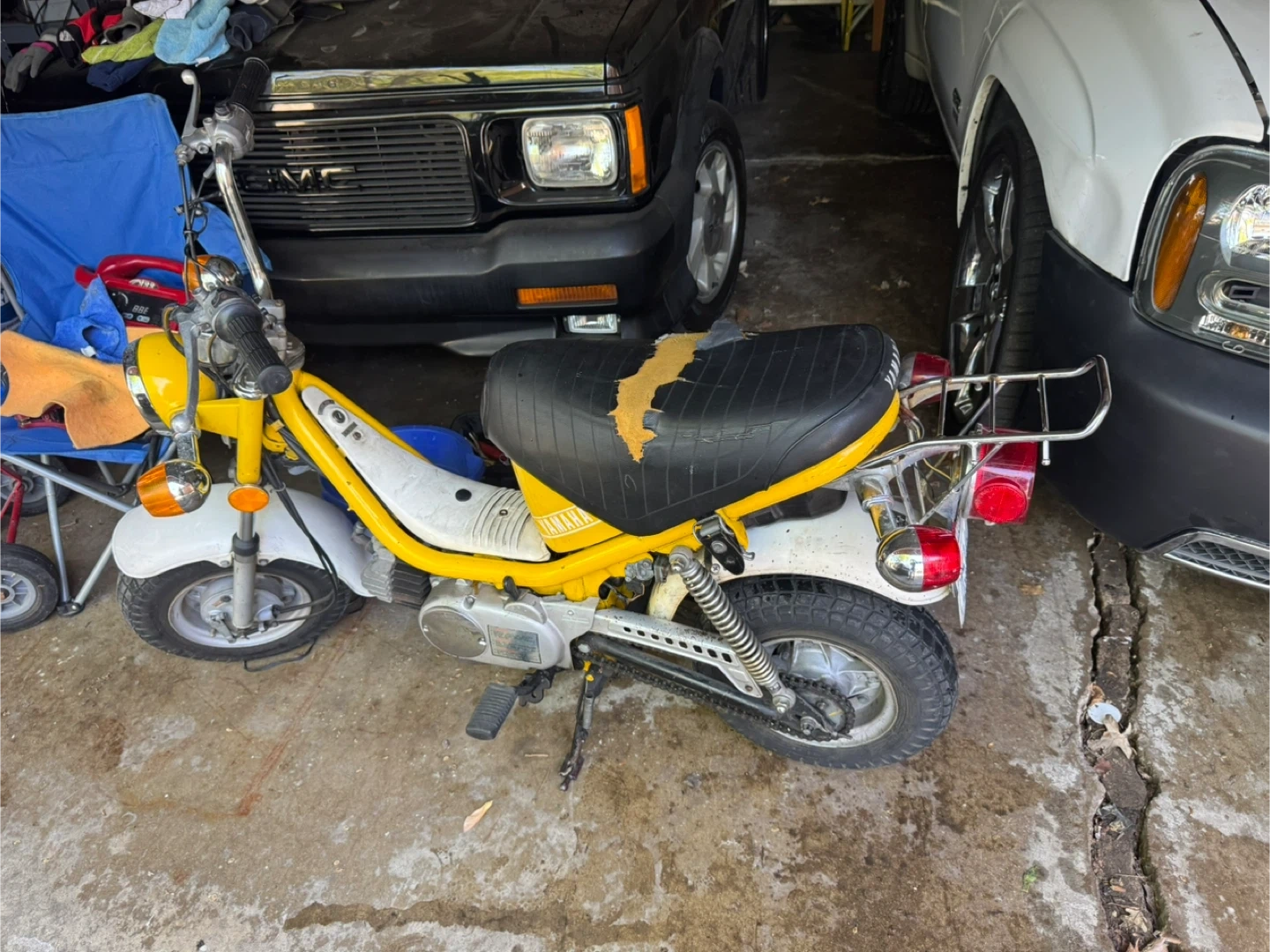 Selling a yellow and white Yamaha moped. It's a project bike, perfect for someone who enjoys tinkering and restoring vintage rides. The seat has some wear and tear, but with a little TLC, this moped could be back on the road in no time!