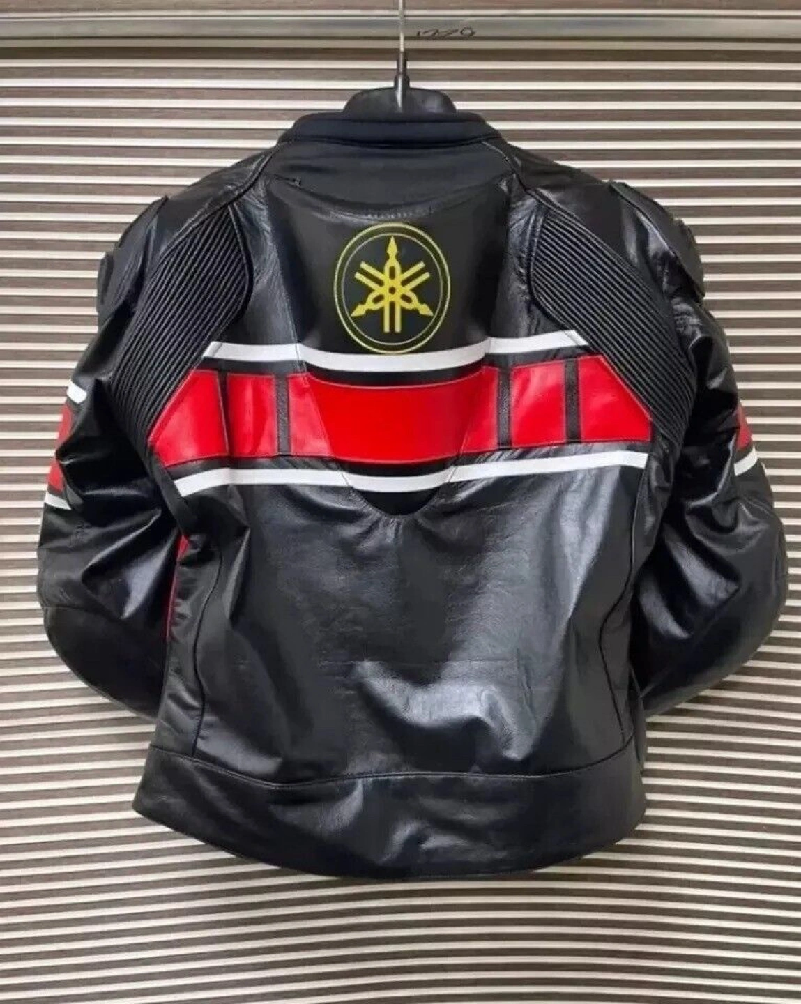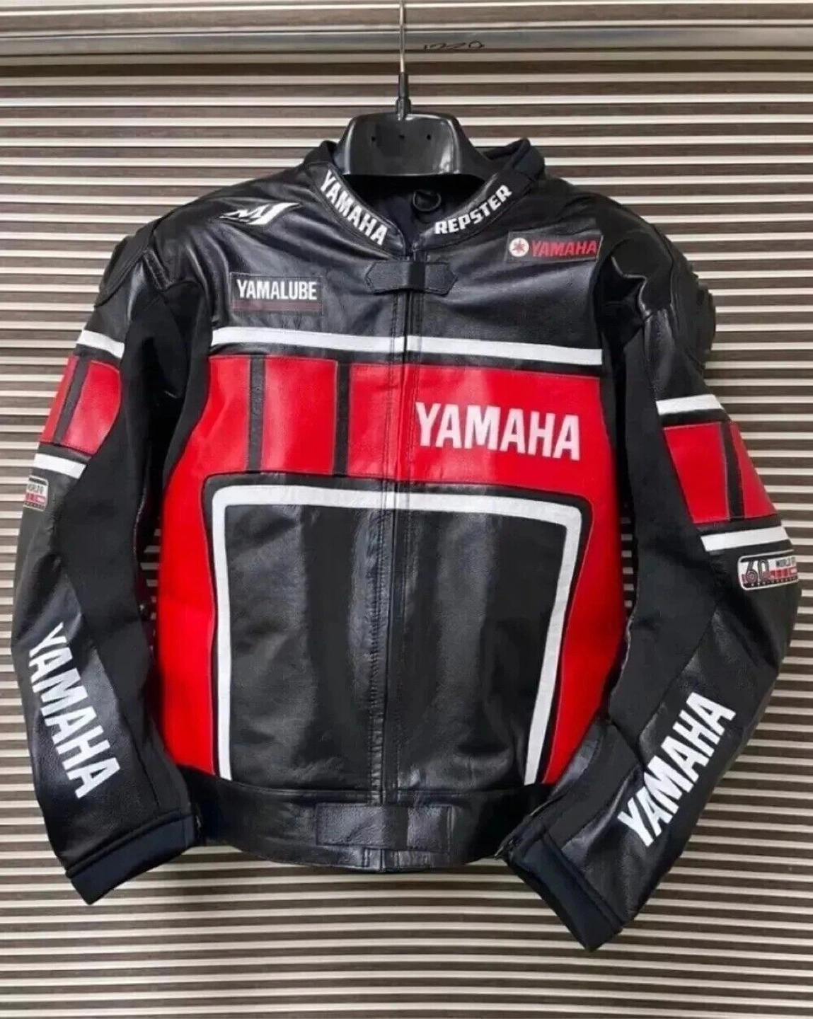 Selling a Yamaha Repster motorcycle leather jacket. It features a black, red, and white color scheme with Yamaha logos and branding throughout. Great for motorcycle enthusiasts!