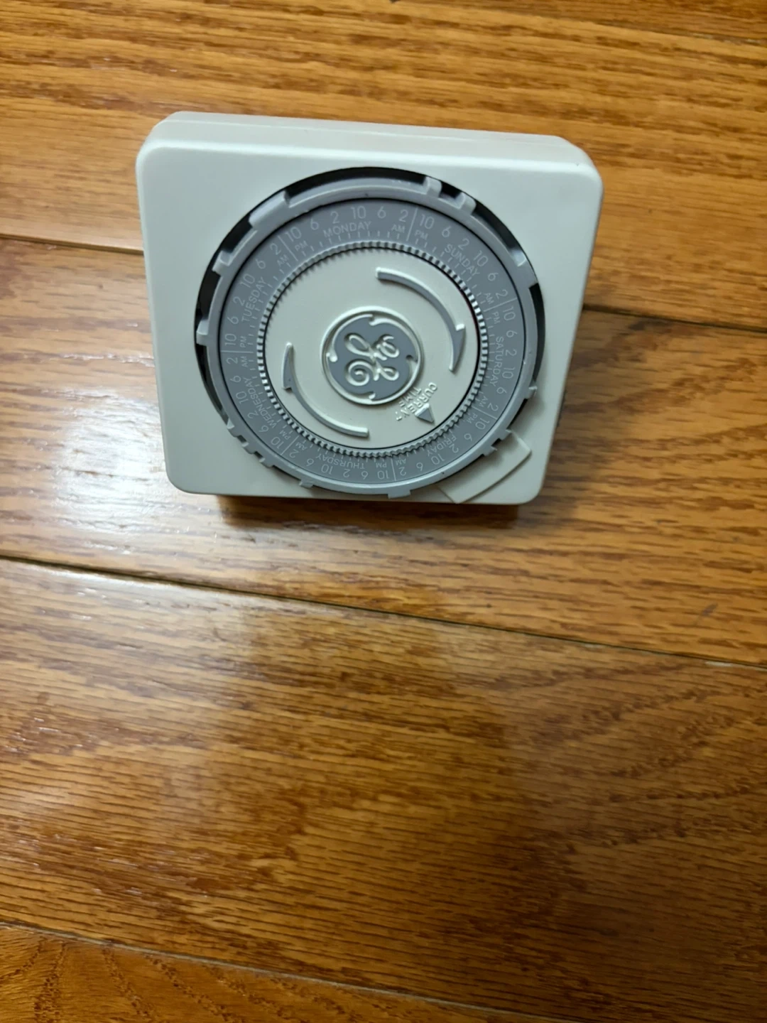 GE mechanical timer for scheduling lights or appliances. This timer allows for daily programming. It's suitable for managing household electrical devices.