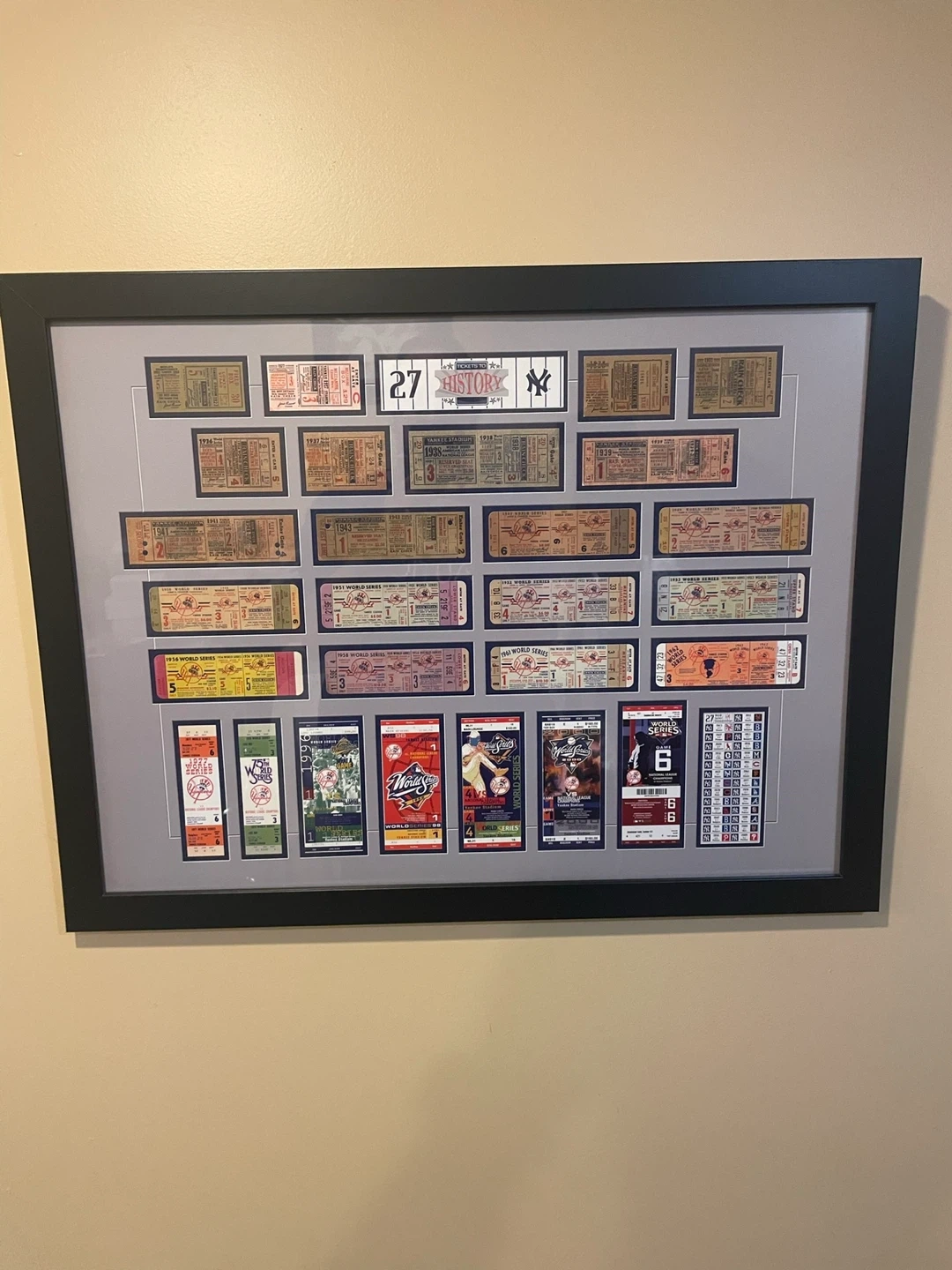 Selling a framed collection of MLB baseball tickets. It's a unique piece for any baseball fan to display their love of the sport and its history. The frame is in great condition and ready to hang!