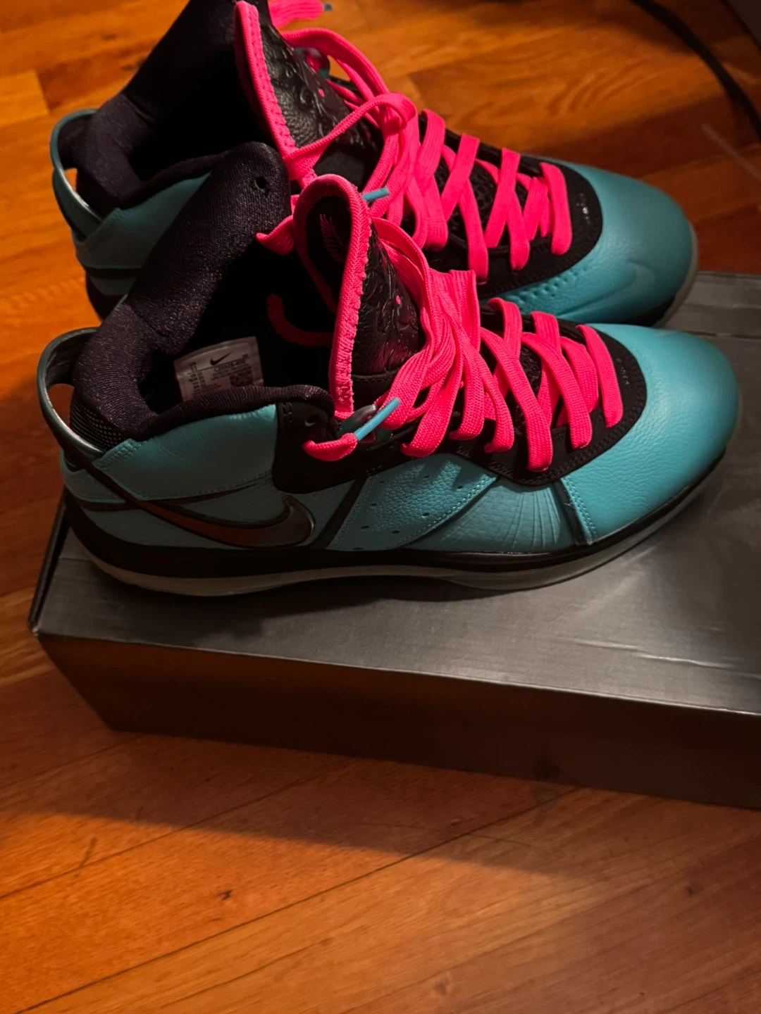 Selling a pair of Nike LeBron 8 South Beach shoes. They come with the original box. The shoes are in good condition and ready for a new owner!