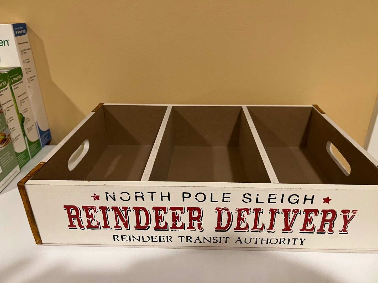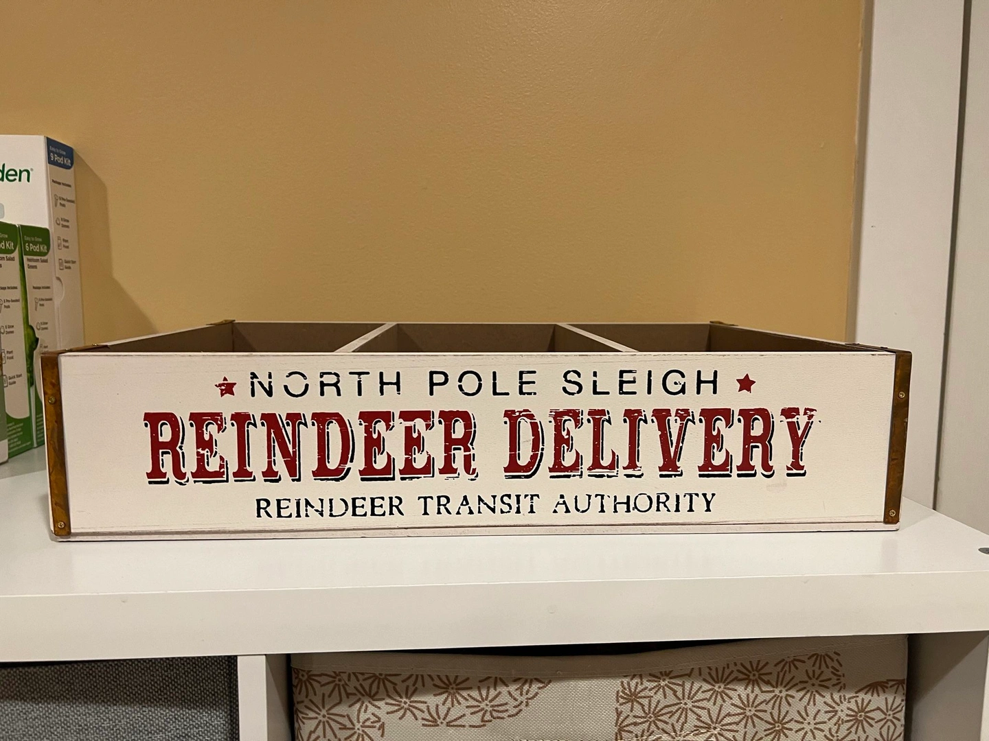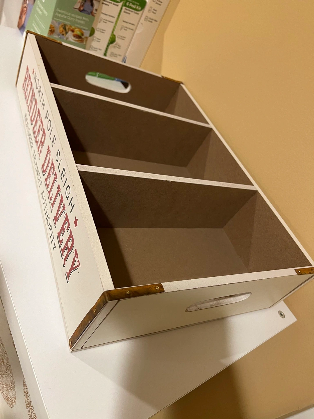New, purchased at Michael’s and never got the chance to use it. 17.5 inches long. 12 inches wide. 4 inches deep. Used as holiday decor or useful kitchen storage