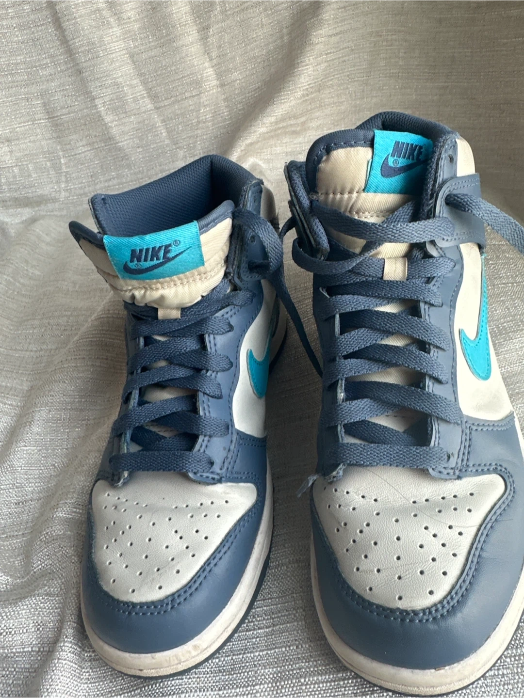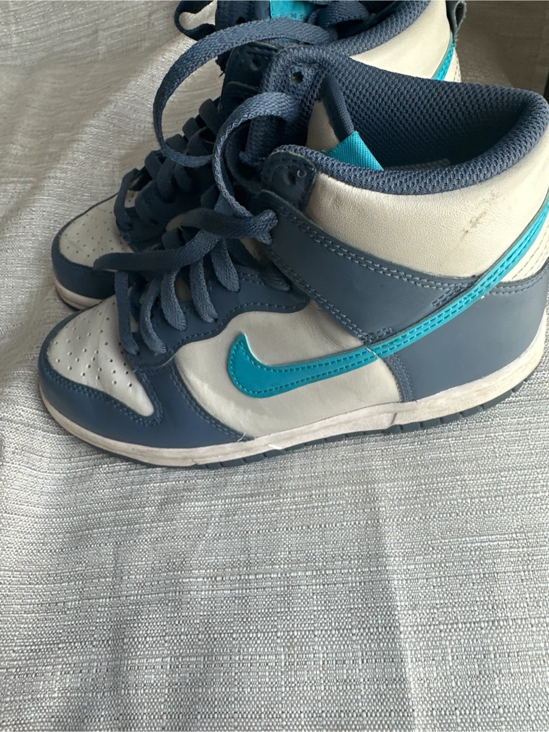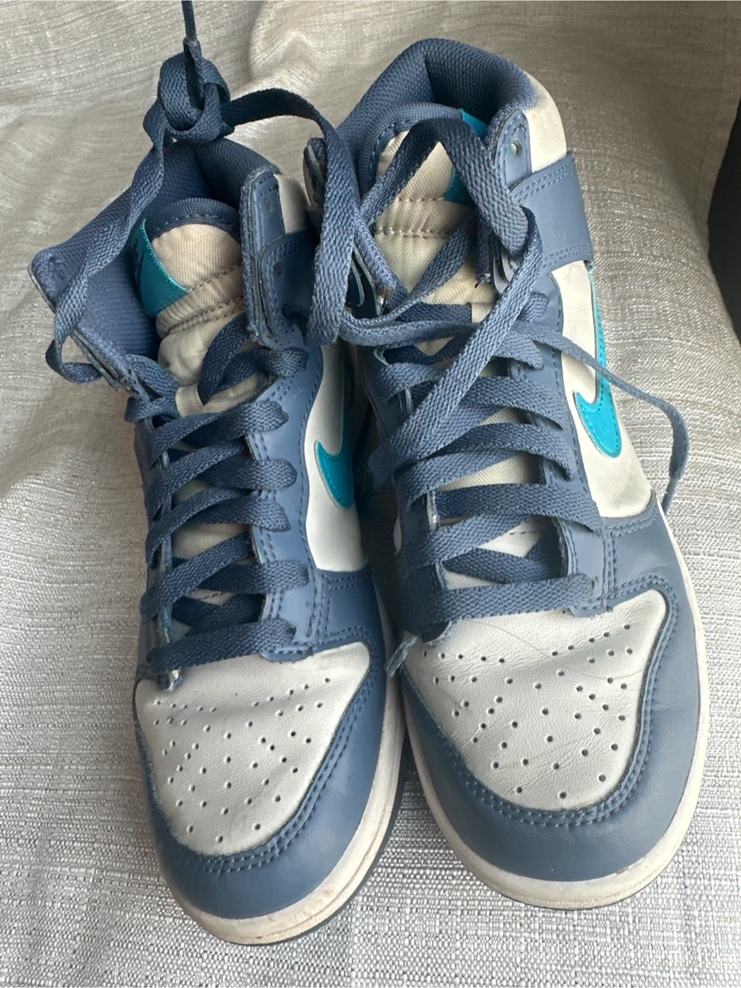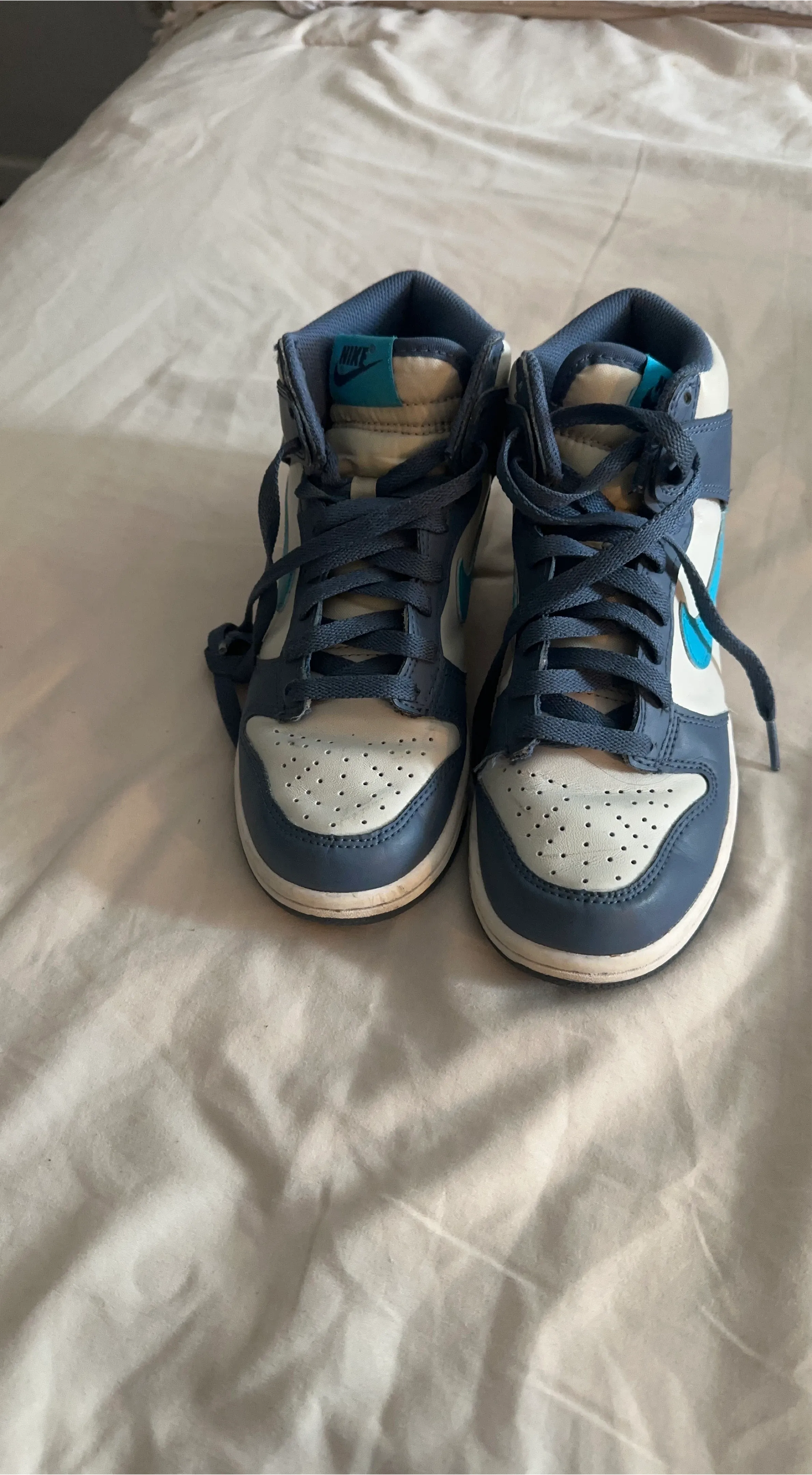 These are Nike Dunk High Top sneakers in a blue and white colorway. They're made of leather and have a rubber sole. This style is great for everyday wear or athletic activities!