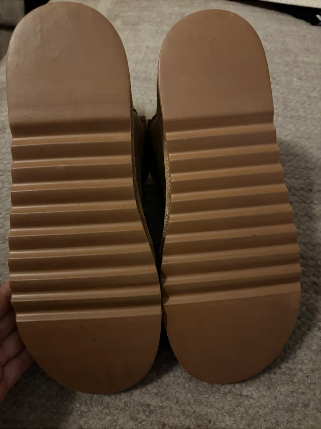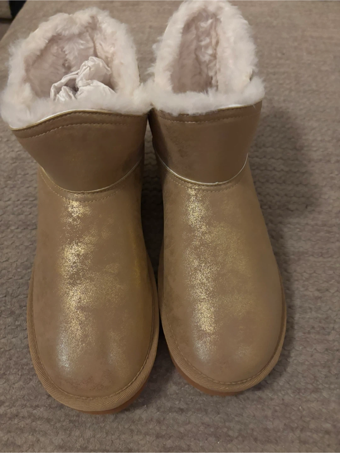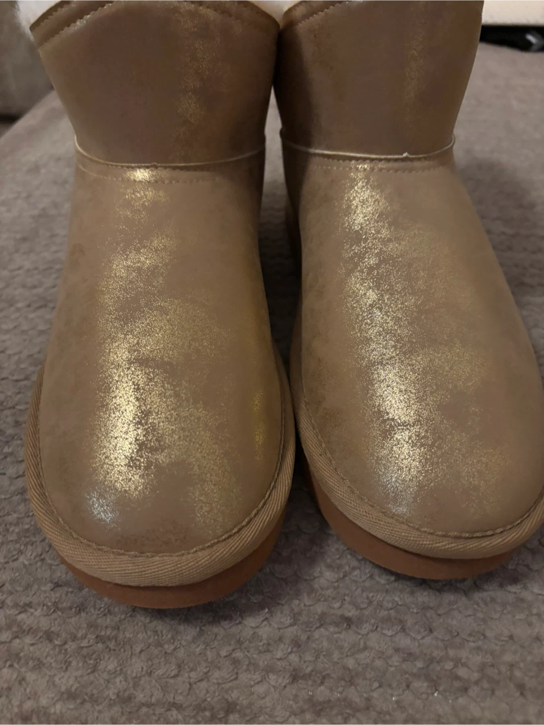 These boots are a stylish gold color with a subtle sparkle. They're lined with faux fur for extra warmth and comfort. Perfect for adding a touch of glam to your winter wardrobe!