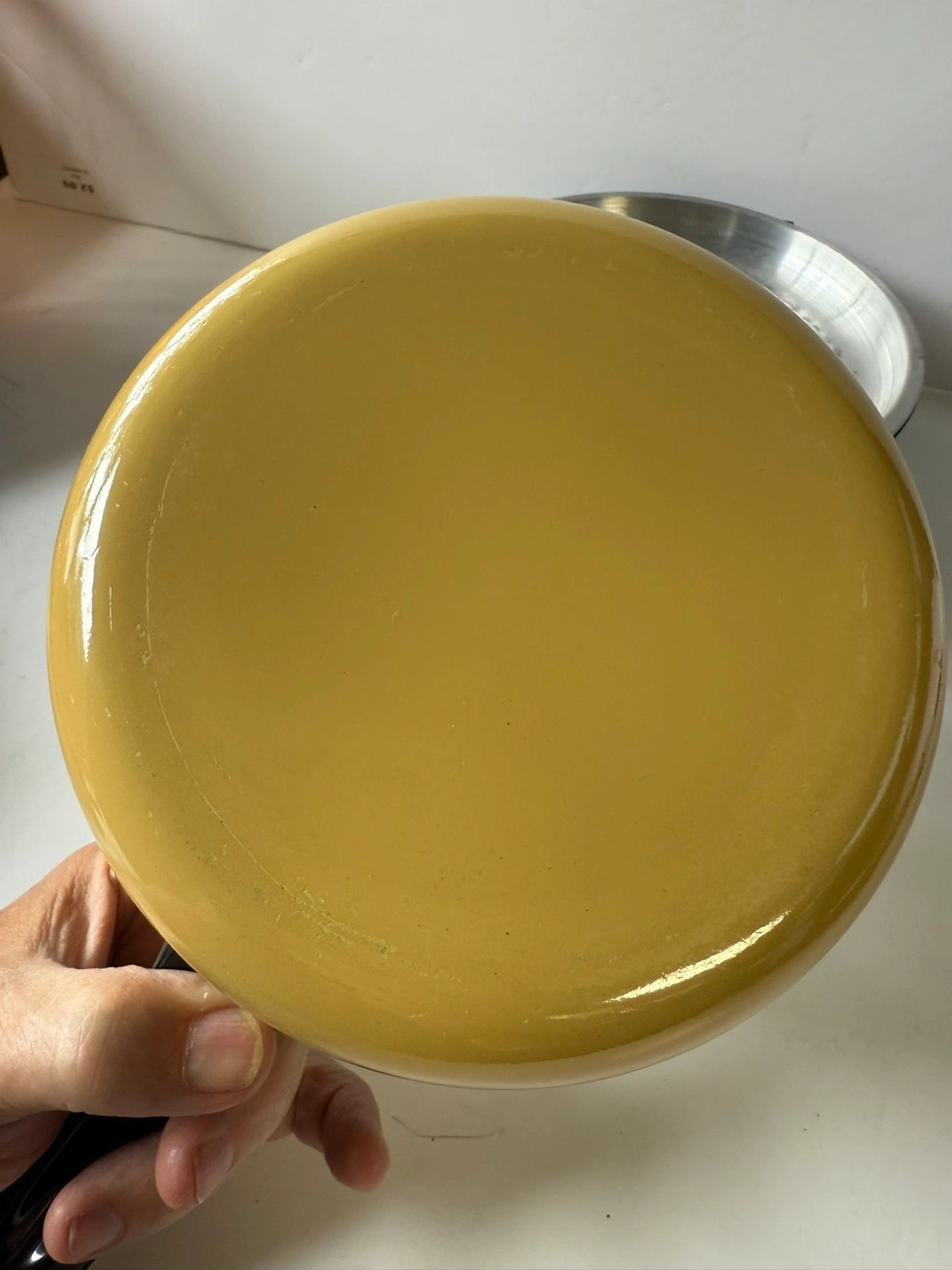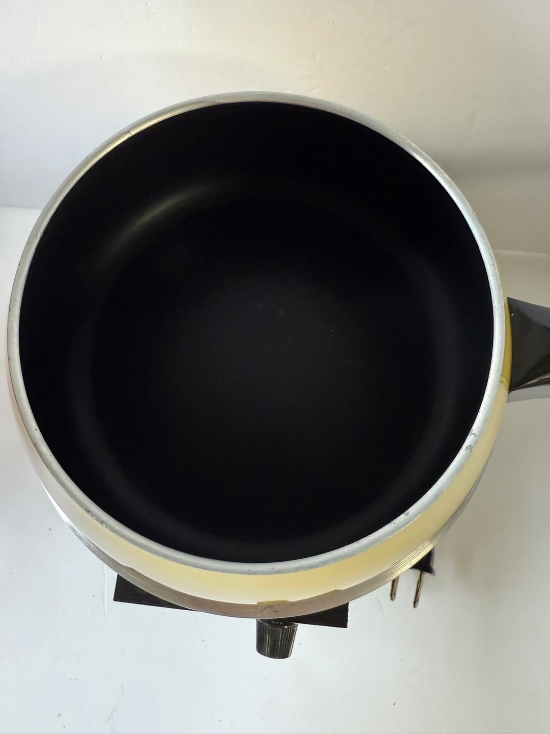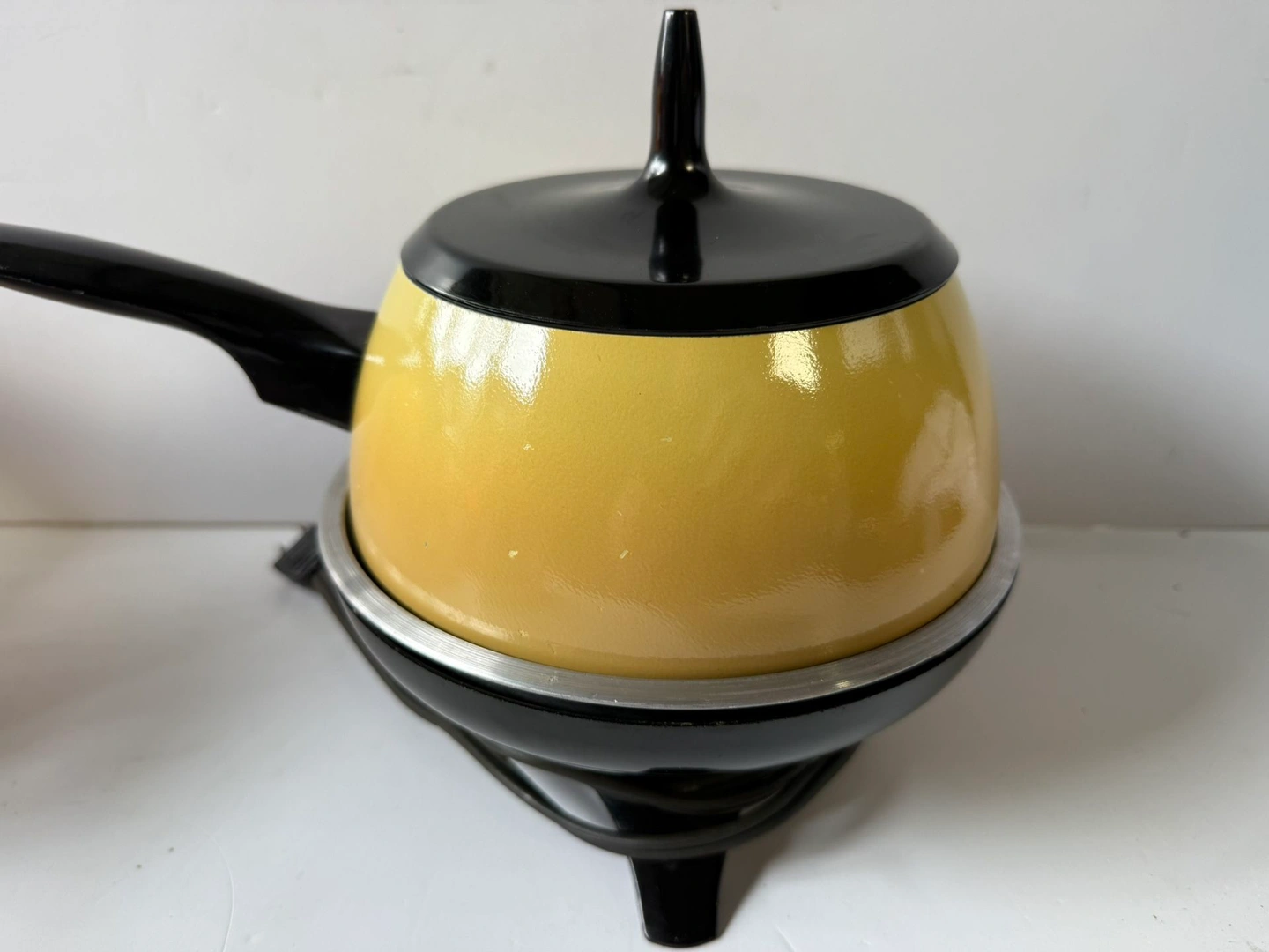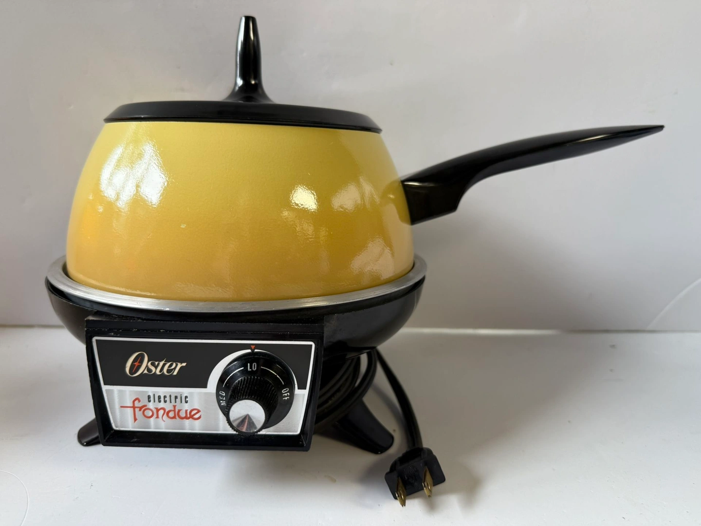 The Vintage Oster Electric Fondue Set Model 701-01A in Harvest Gold has a timeless Mid Century style that adds a touch of retro charm to any kitchen. This electric fondue set includes a stand, pot, lid, and burner, making it a versatile and practical addition to your dining experience. Infused with nostalgia and functionality, this set is a unique piece that is sure to be the centerpiece of your fondue parties and gatherings.