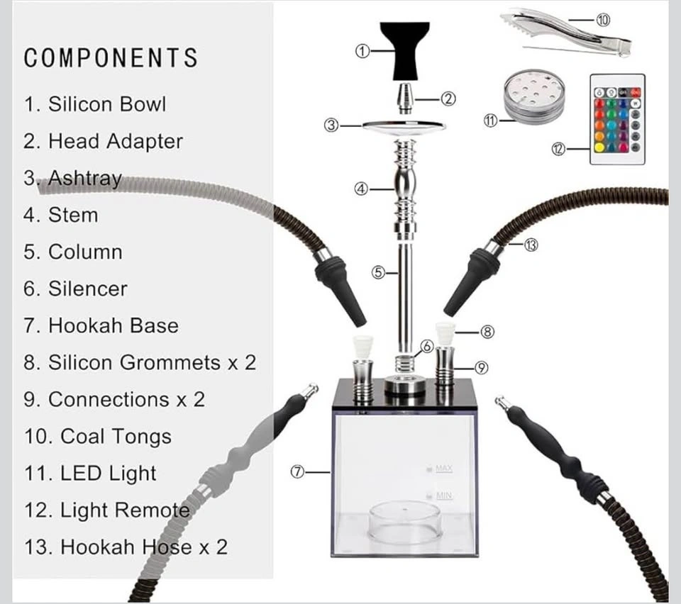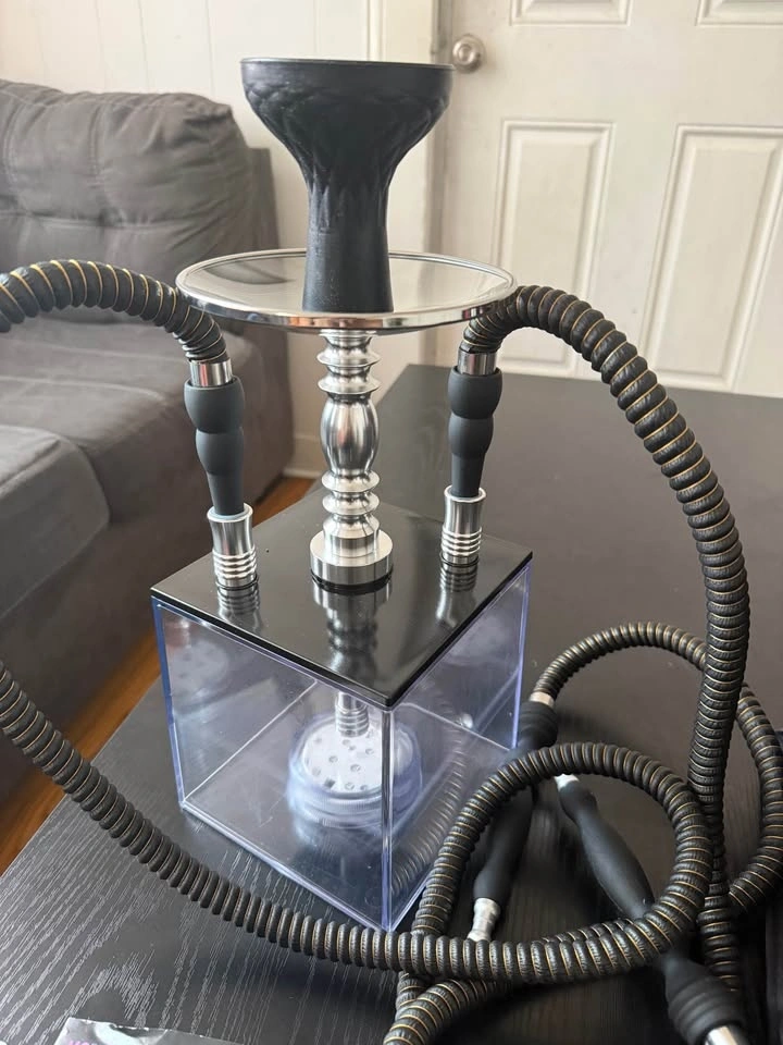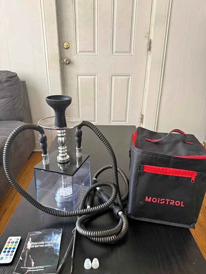 Like new Micro Cube Acrylic Hookah with Silicone Bowl, Coal Tongs, and Magical Remote LED Light for better shisha narguile smoking.