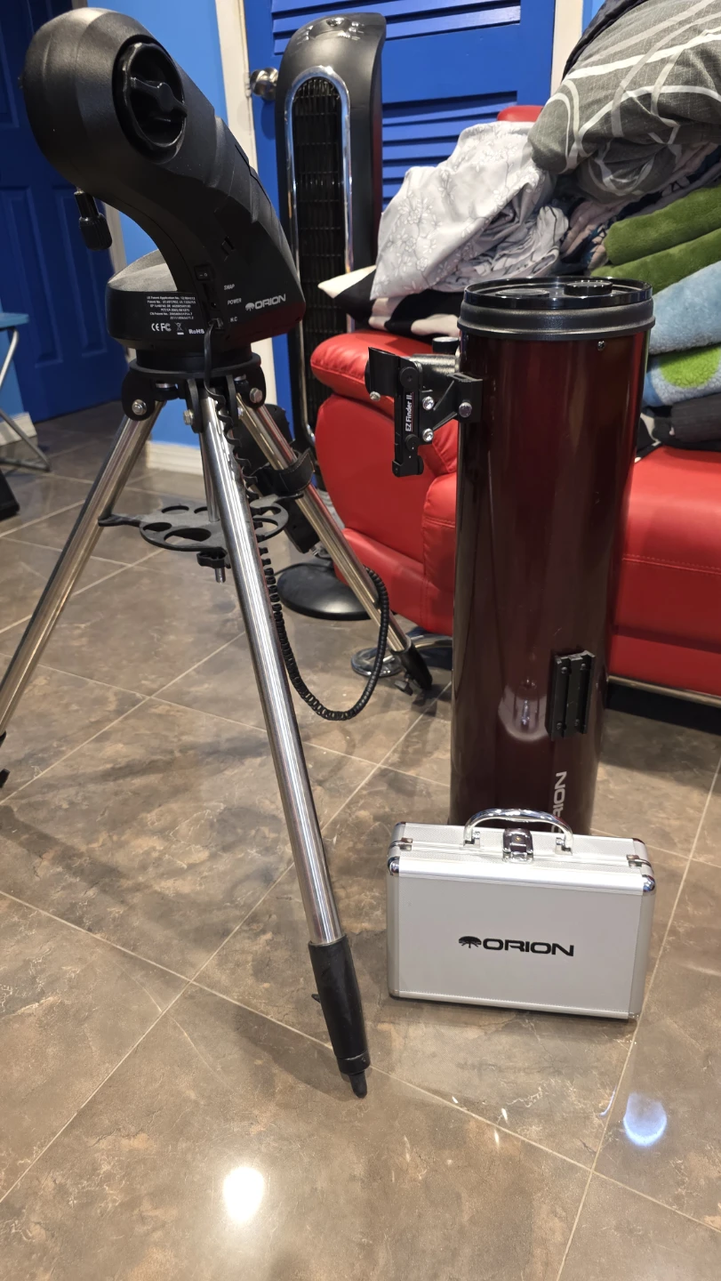 Orion StarSeeker IV telescope with 150mm aperture and GoTo refractor. It includes the telescope tube, tripod, and a carrying case. This telescope is ready for exploring the night sky!