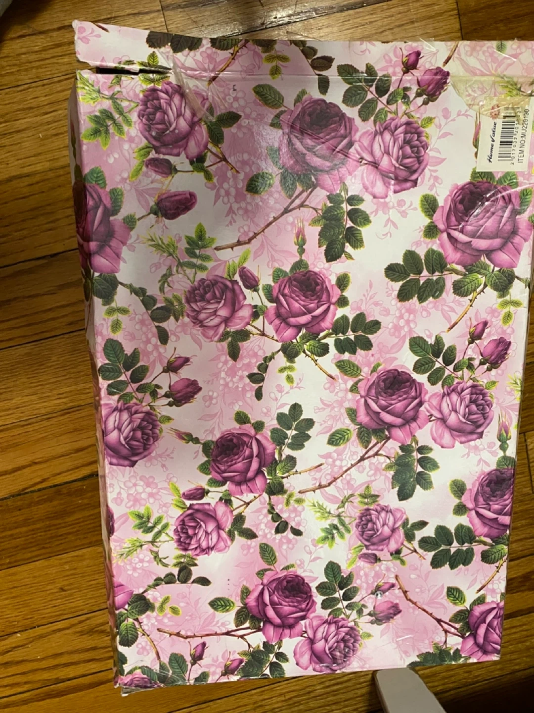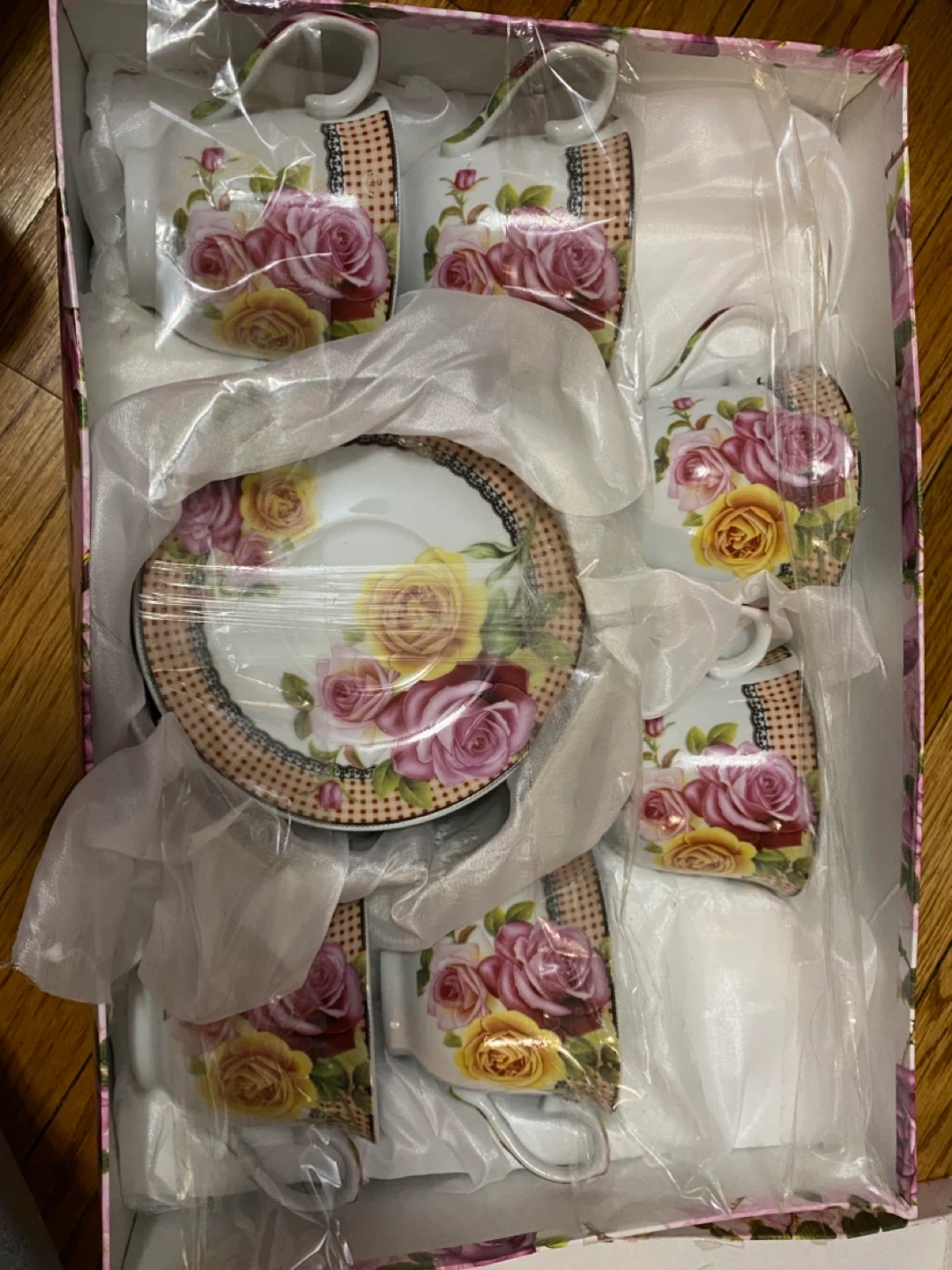 This tea set includes four cups and four saucers, all featuring a delicate rose pattern. The porcelain cups and saucers have a floral design with pink and yellow roses. It comes in its original packaging. 12 piece total