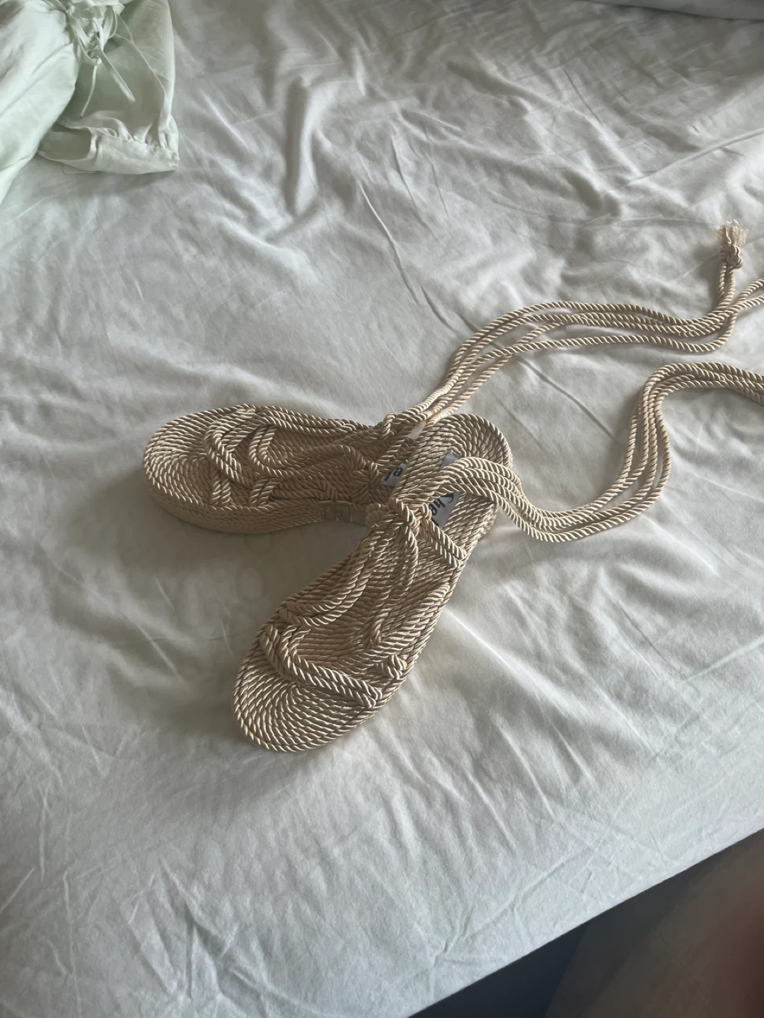 Beige rope sandals with long ties. These shoes have a unique braided design. They're perfect for a beach vacation!
