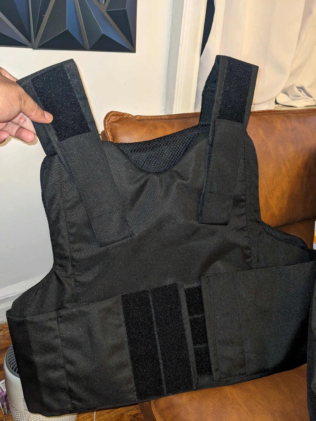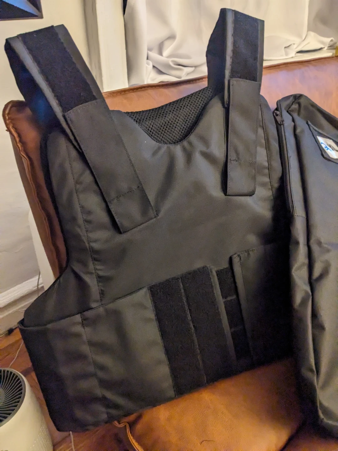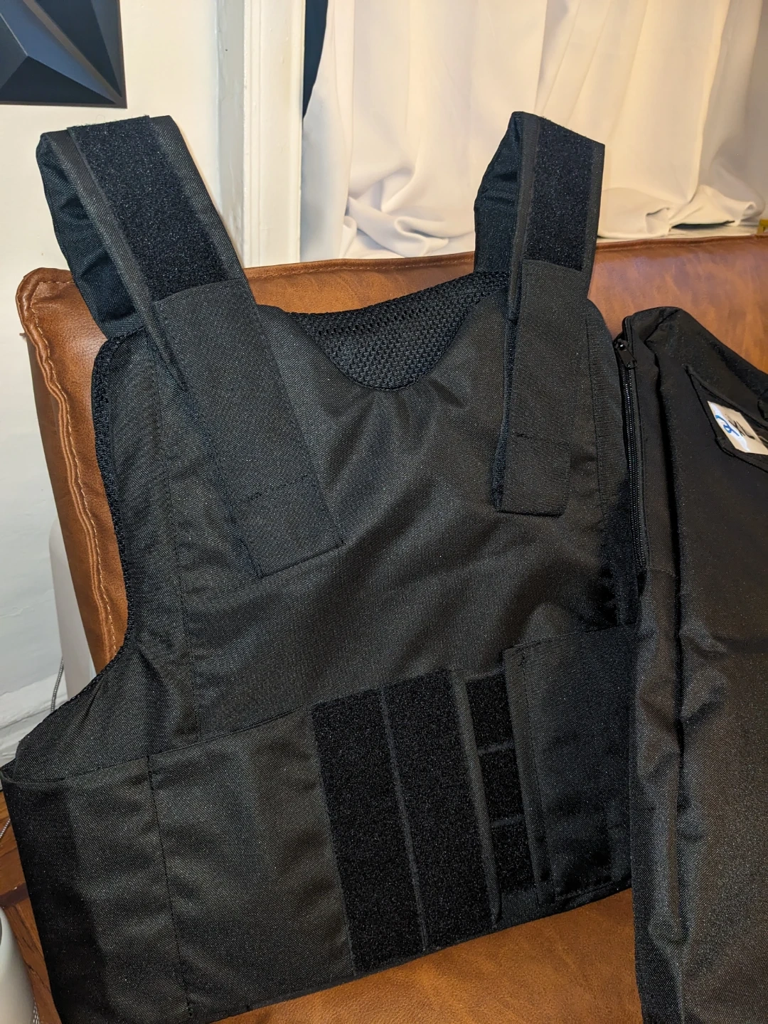 This is a black tactical vest. It's size 2XL. Includes a carrying bag. 3A level concealable ballistic vest must have security license