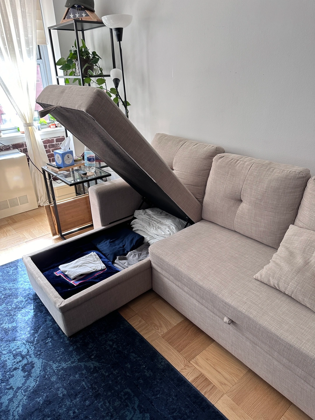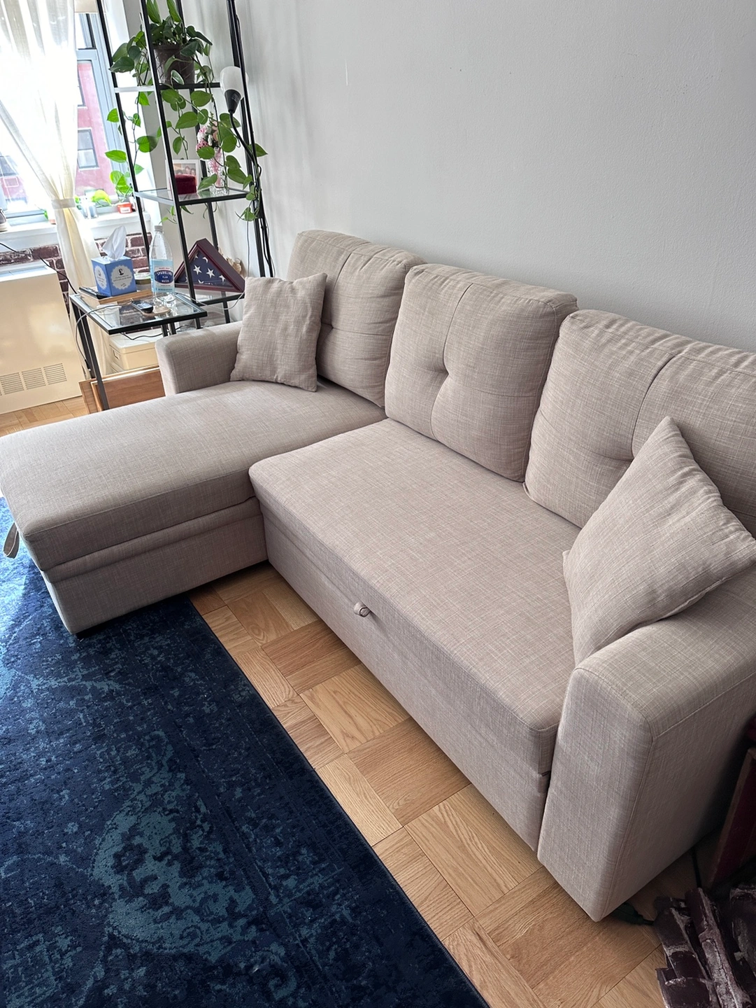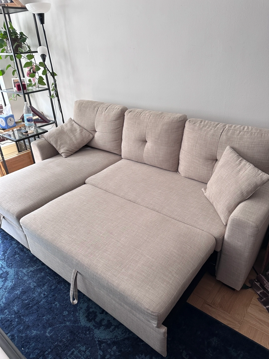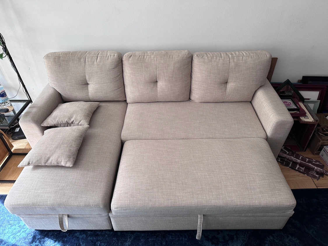 Beige sectional sofa with pull out storage. The sofa has a chaise lounge and also has a pull-out bed. The couch is in good condition. Purchased from Wayfair 10 months ago.