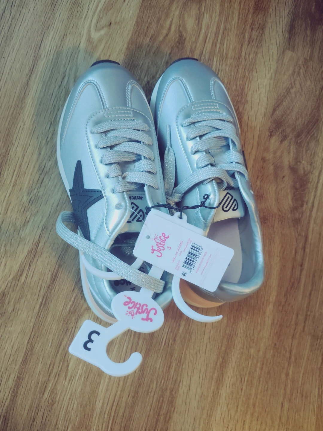 These Justice jogger sneakers are a shiny silver color. They feature a black star detail on the side. Size is 3.