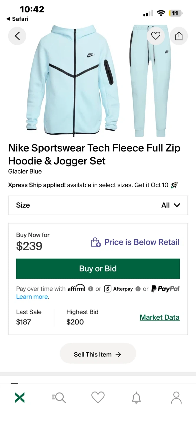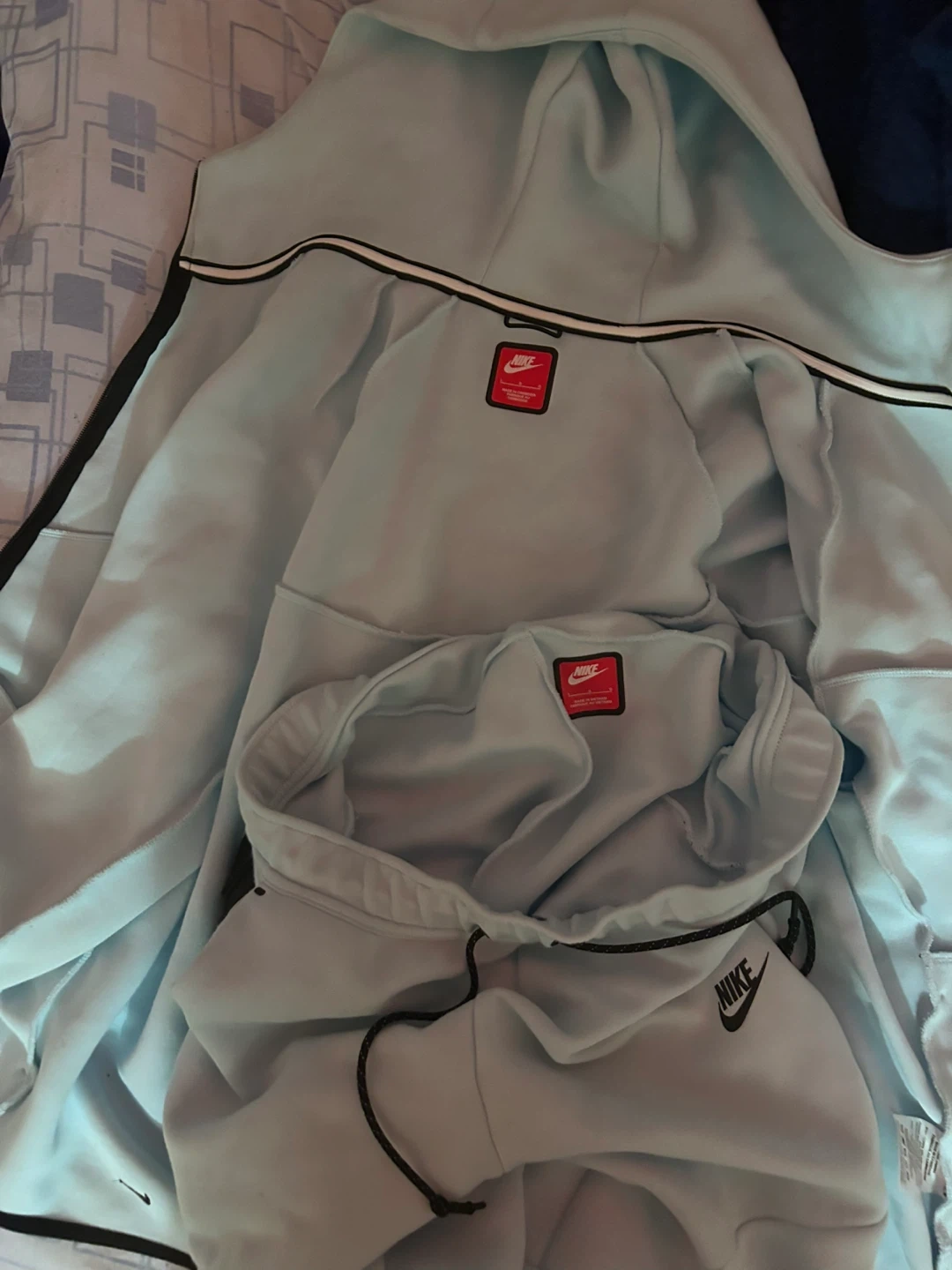 Selling a Nike Sportswear Tech Fleece full zip hoodie and jogger set in a glacier blue color! It's a stylish and comfortable set, perfect for everyday wear or workouts. The tech fleece material is lightweight and warm. Originally bought for $239