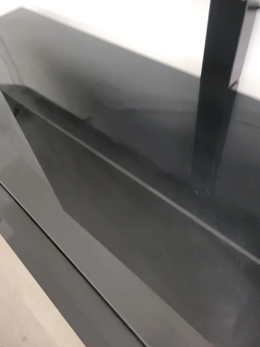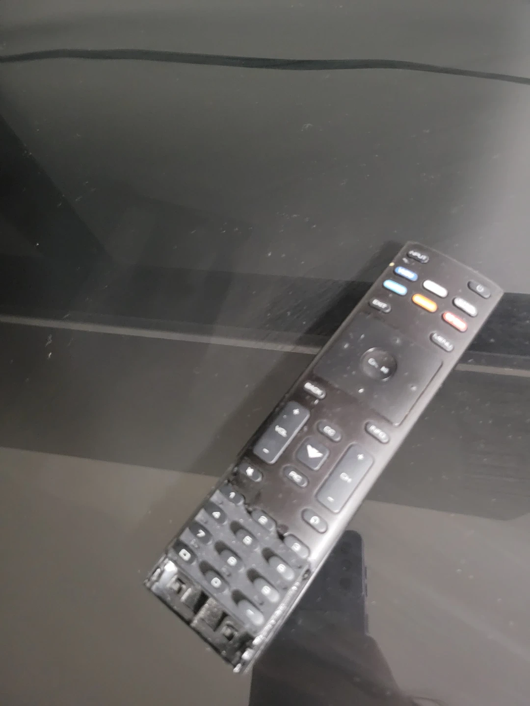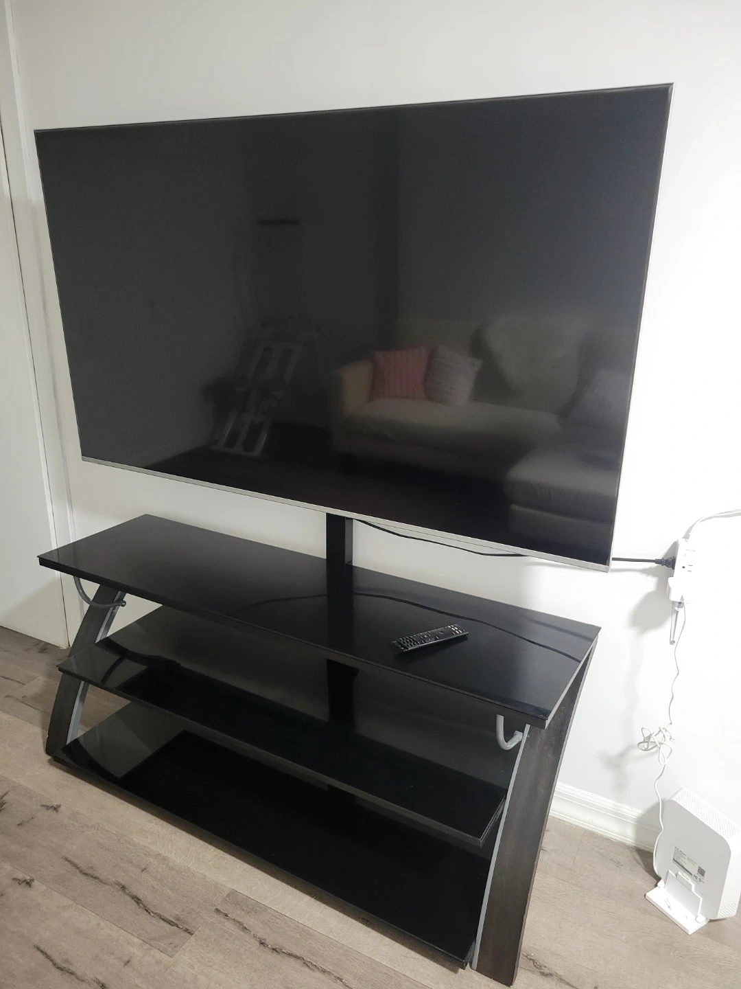 A 55-inch Vizio 4K UHD Smart TV. It comes with a remote and is mounted on a black media console. This TV's screen is approximately 55 inches diagonally. It features multiple HDMI and USB ports for connectivity. It comes with this black TV furniture included. The remote is working well.