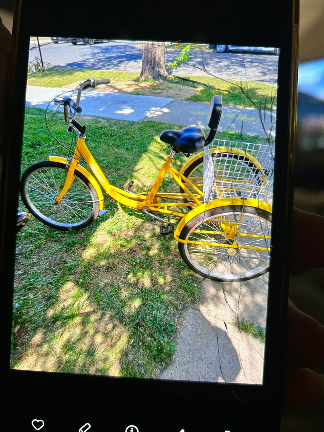 Selling a bright yellow adult tricycle! It features a basket in the back, perfect for errands or leisurely rides. It looks to be in good condition and ready for a new owner to enjoy