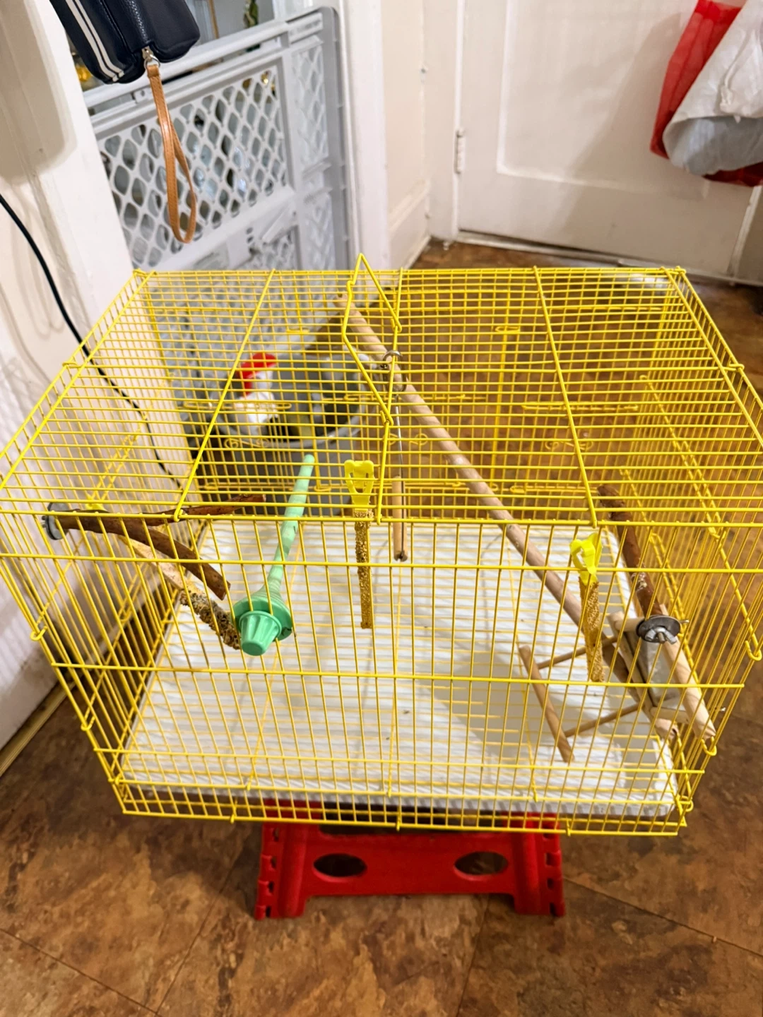 Selling a yellow bird cage. It's in good condition and ready for a new feathered friend! It comes with perches and a tray for easy cleaning