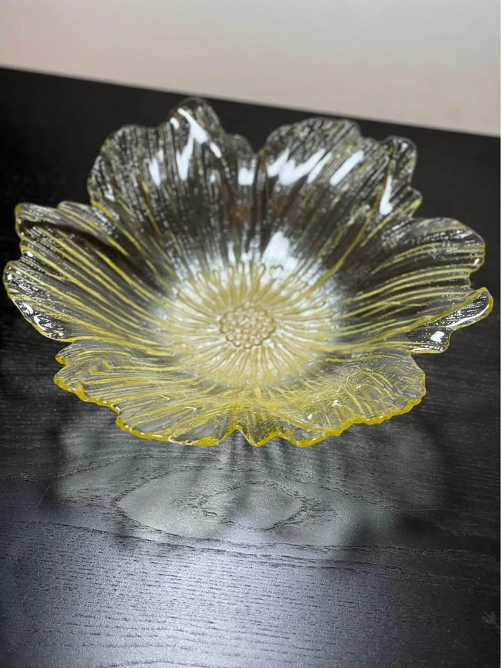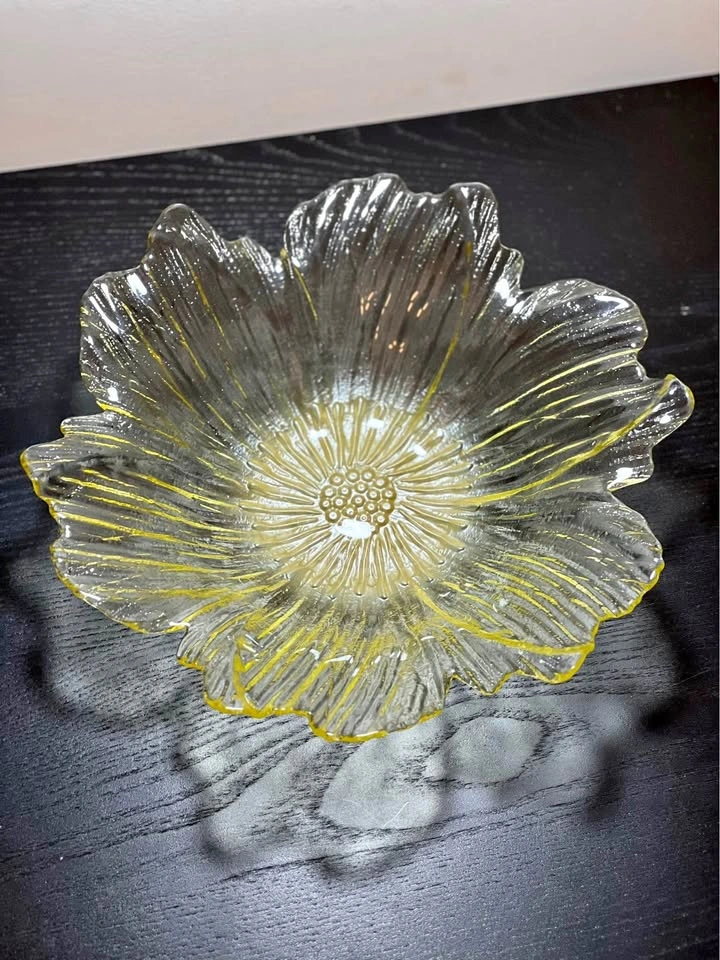 98This is a decorative glass bowl with a flower-like design. It is often used as a centerpiece or for holding fruit. The bowl is made of glass and has a ribbed, petal-like texture on the outside. The center of the bowl is frosted or textured to resemble the stamen of a flower. The edges of the bowl are scalloped, following the shape of the petals. Measures approximately 11” in diameter.
