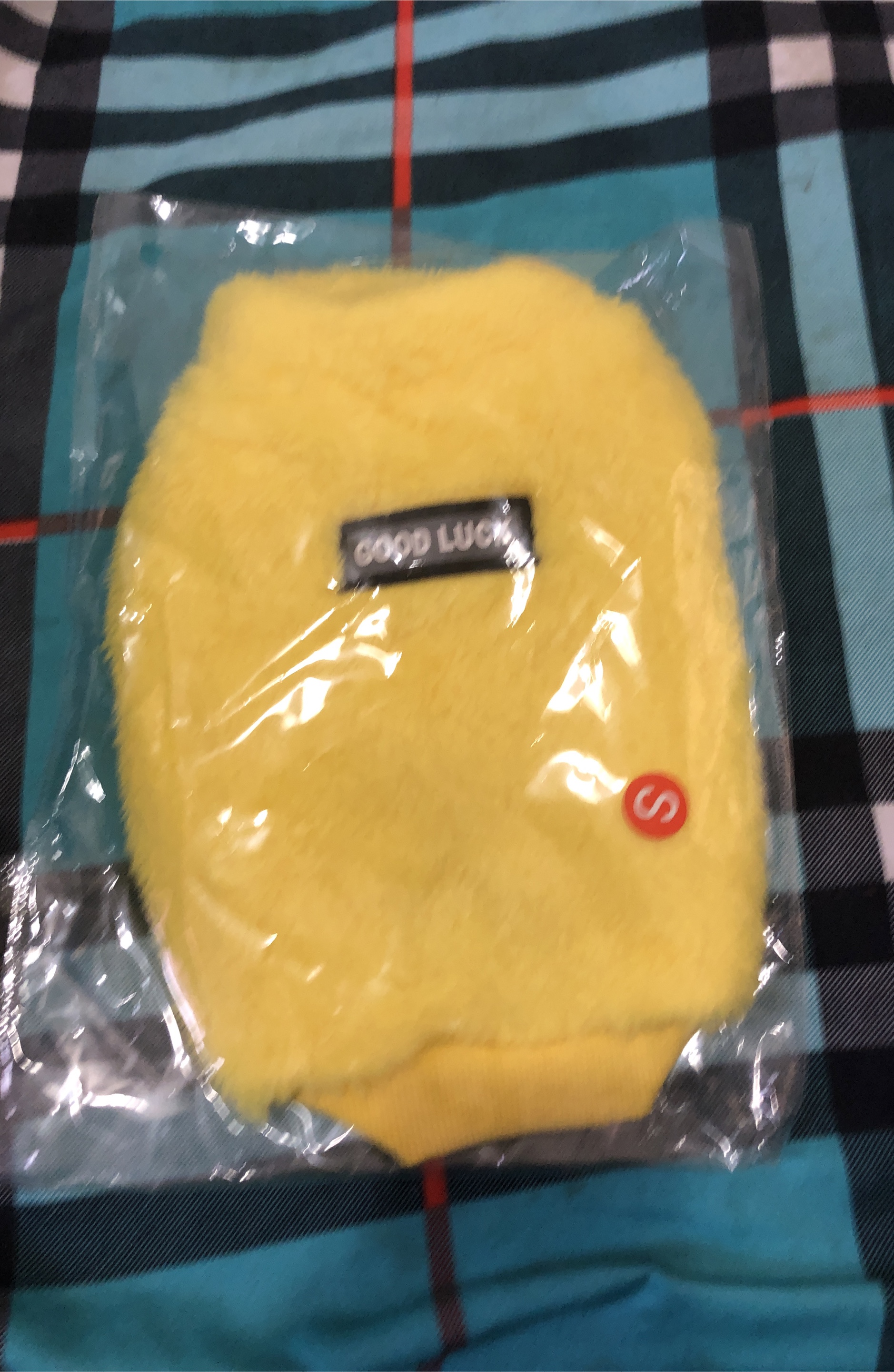 Selling a cute yellow pet sweater with a "Good Luck" label! It's still in its original packaging. Size is S.