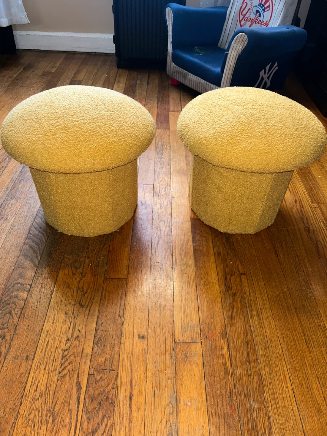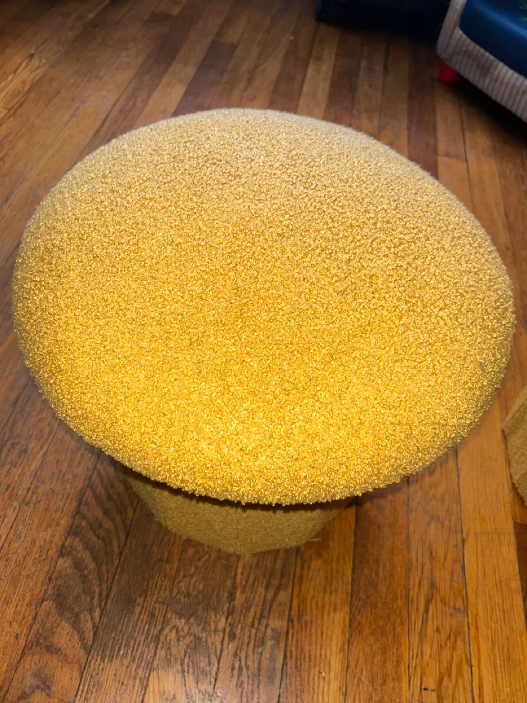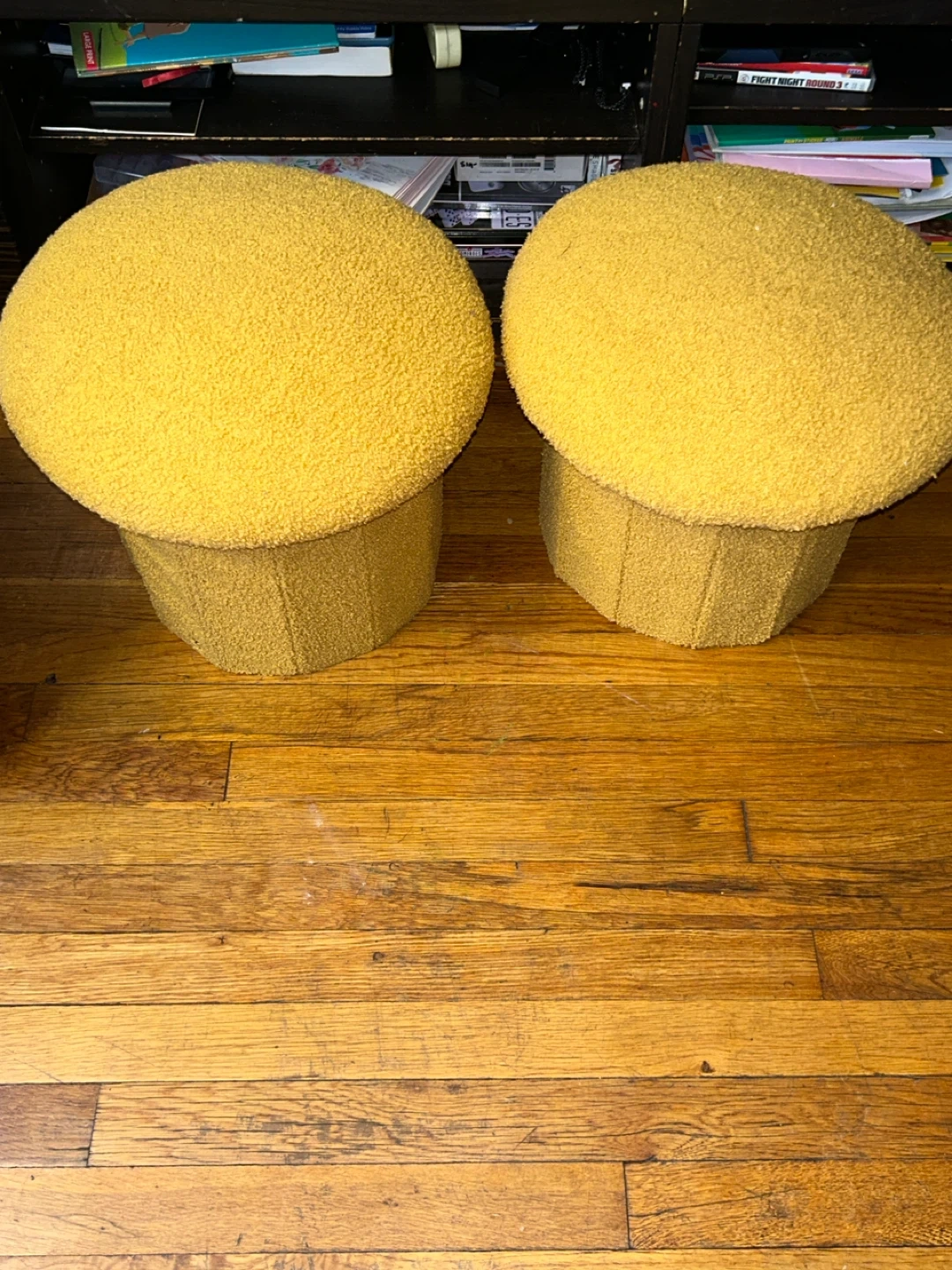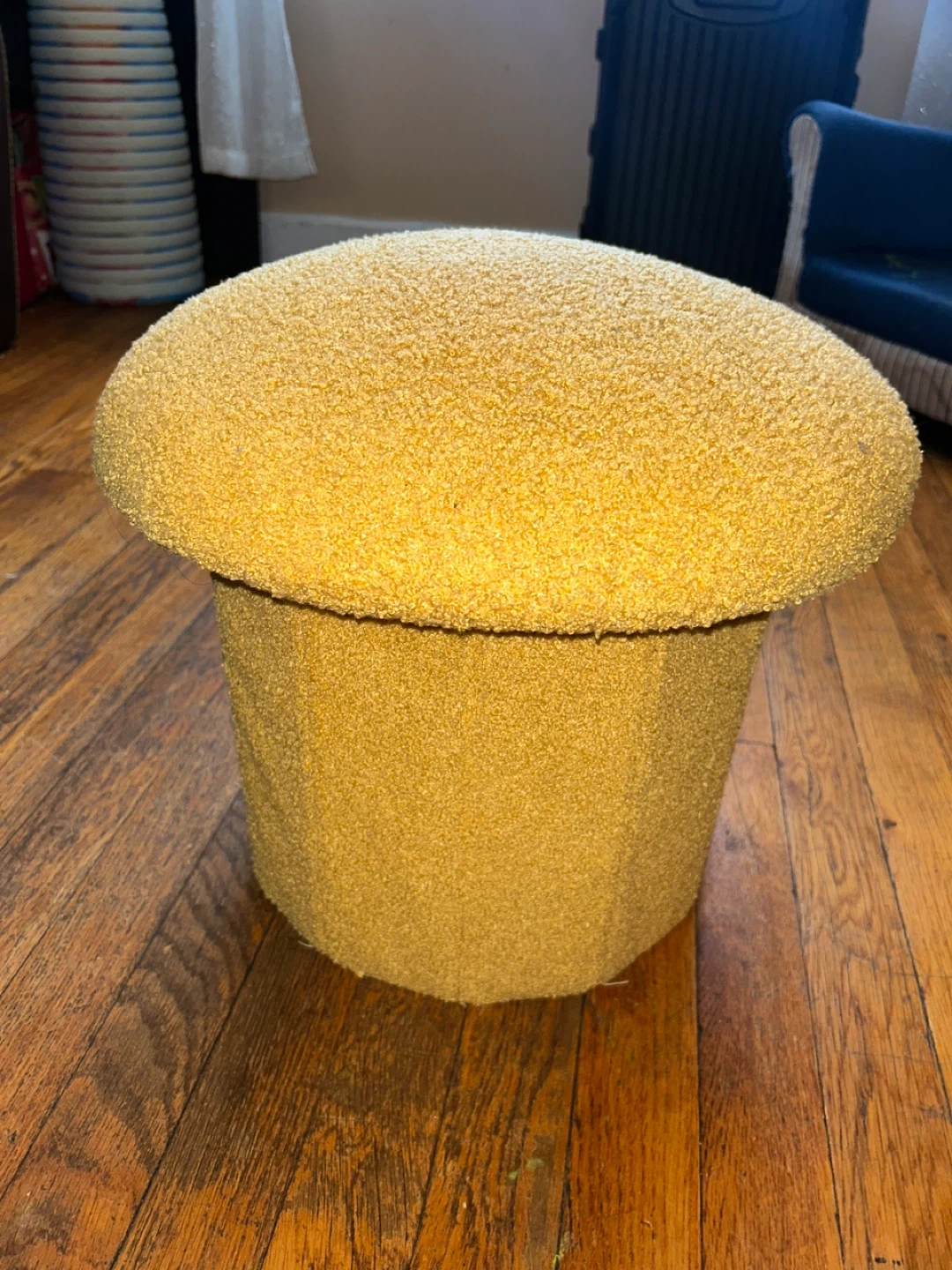 256Here's a cute mushroom-shaped ottoman stool! It's a fun and unique piece for any room. The stool is a bright yellow color with a soft, textured top. It also has a hollow storage area inside the base