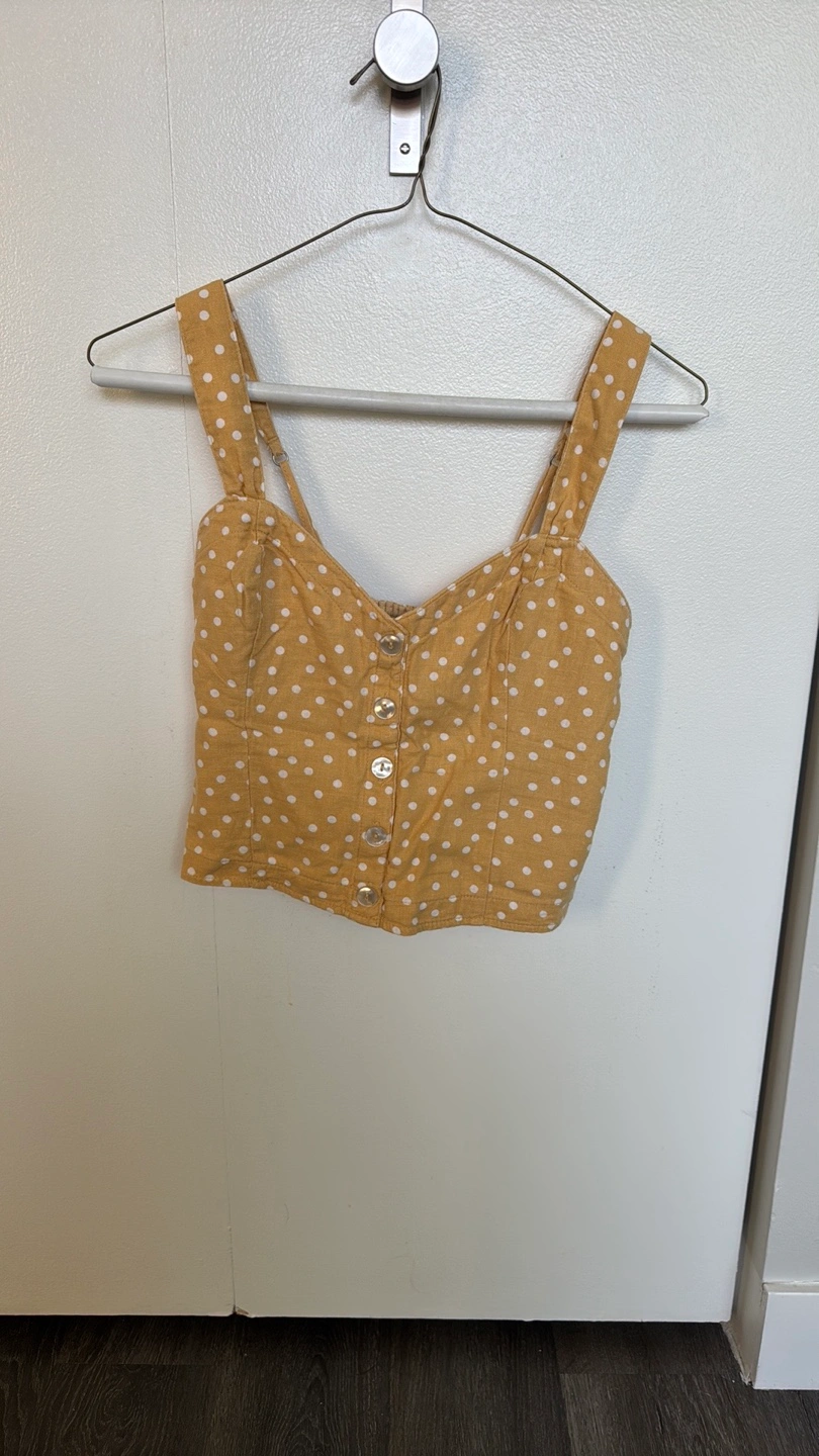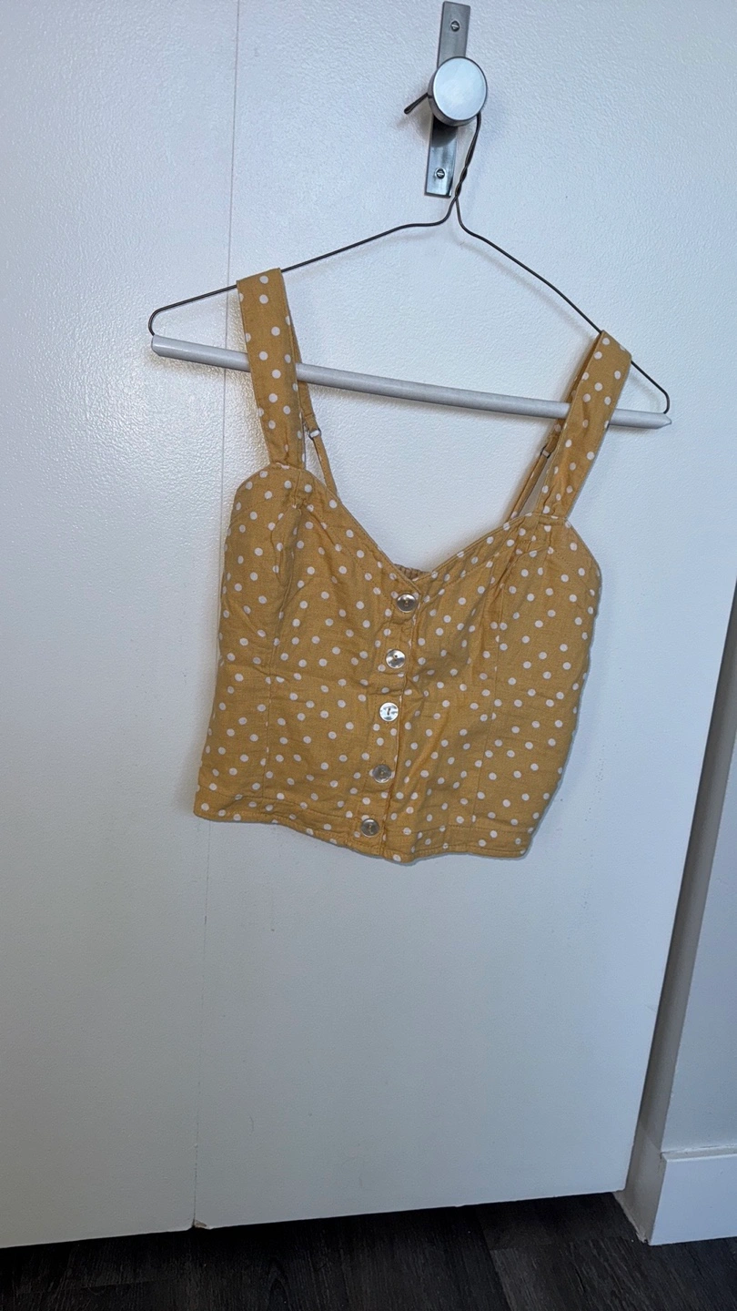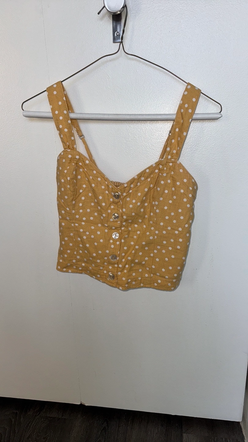 65Chic and stylish polka dot button-up top for women. Features a charming yellow color with white polka dots. Perfect for casual outings or a day at the beach.