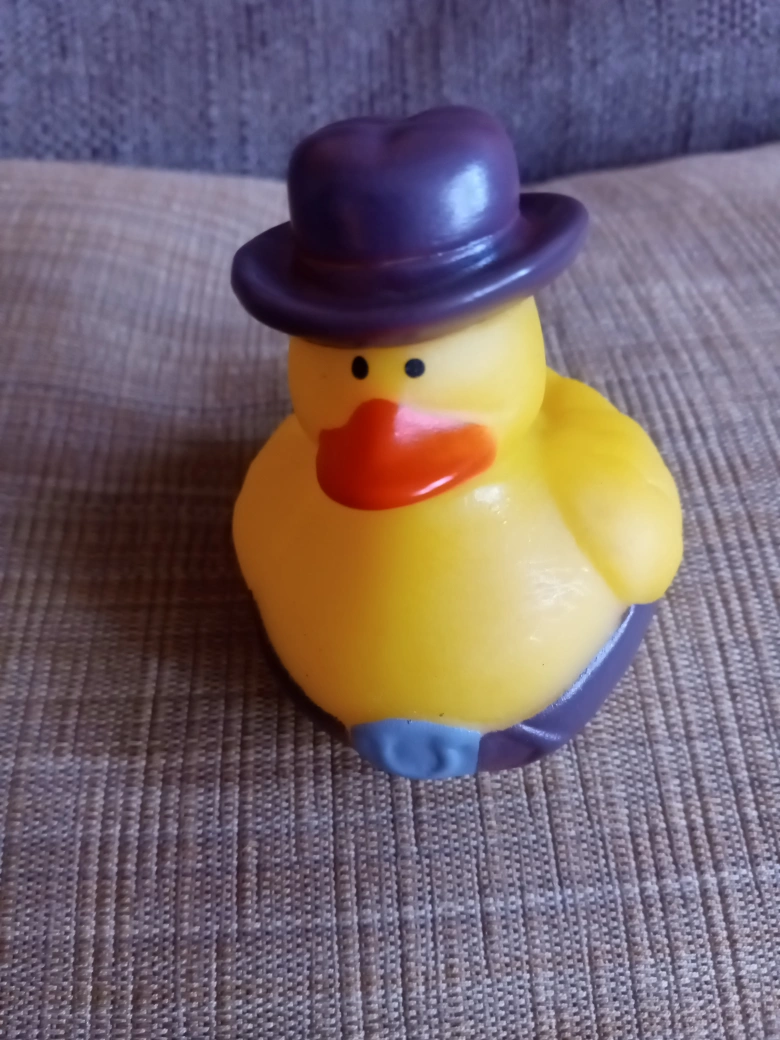 Here's a cute yellow rubber duck wearing a purple hat! It's in great condition and ready to brighten up your bath time or add a whimsical touch to your collection