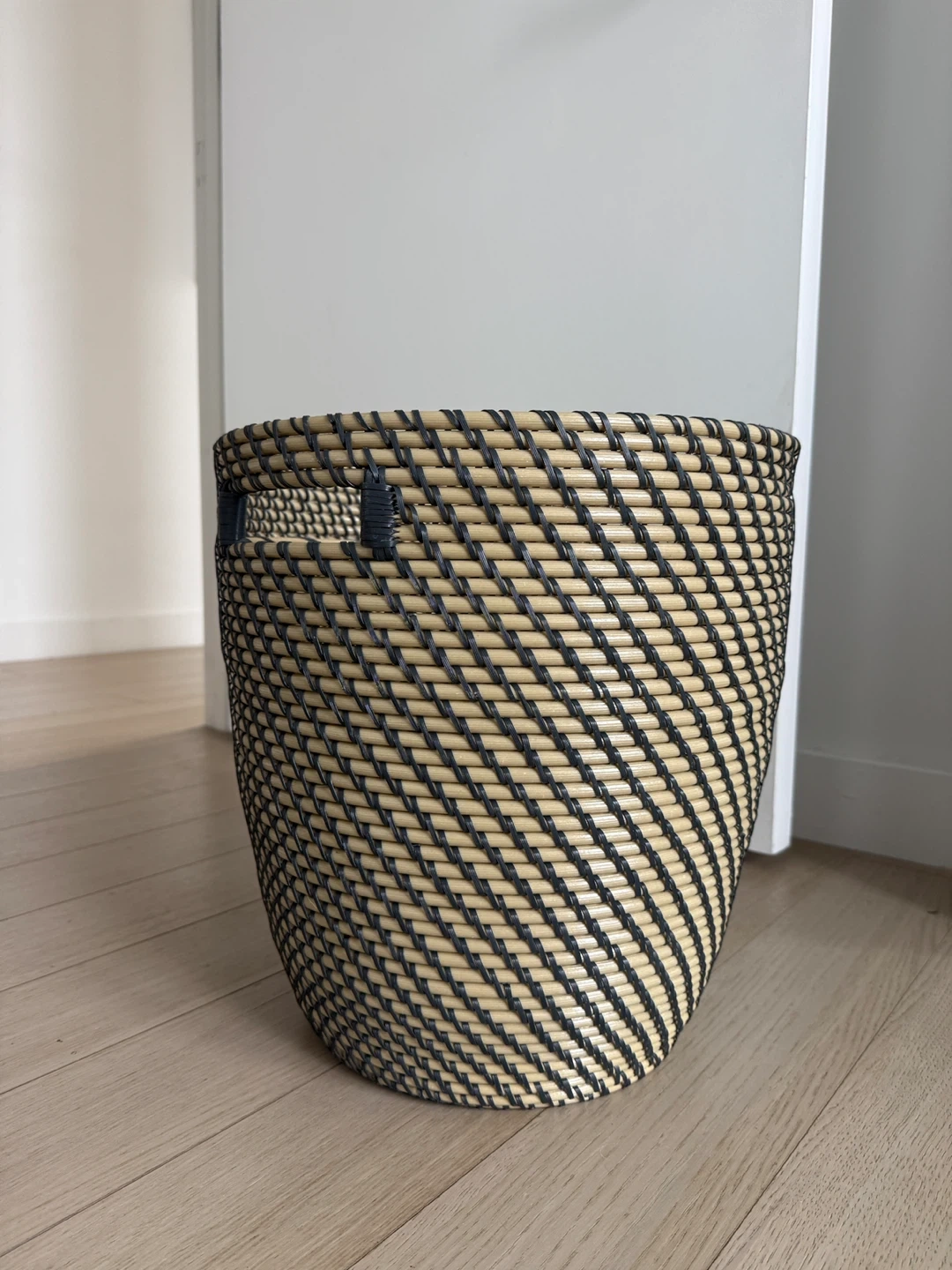Here's an open storage basket with a beige and black woven design. It's perfect for adding a touch of texture to any room. It's in good condition and ready for a new home.