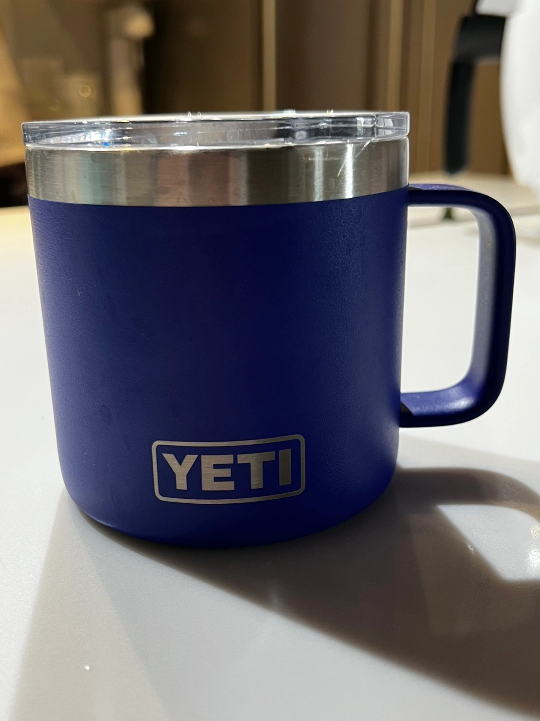 90YETI Rambler mug. Deep blue color. Durable and keeps drinks hot or cold. Includes lid. Gently used.