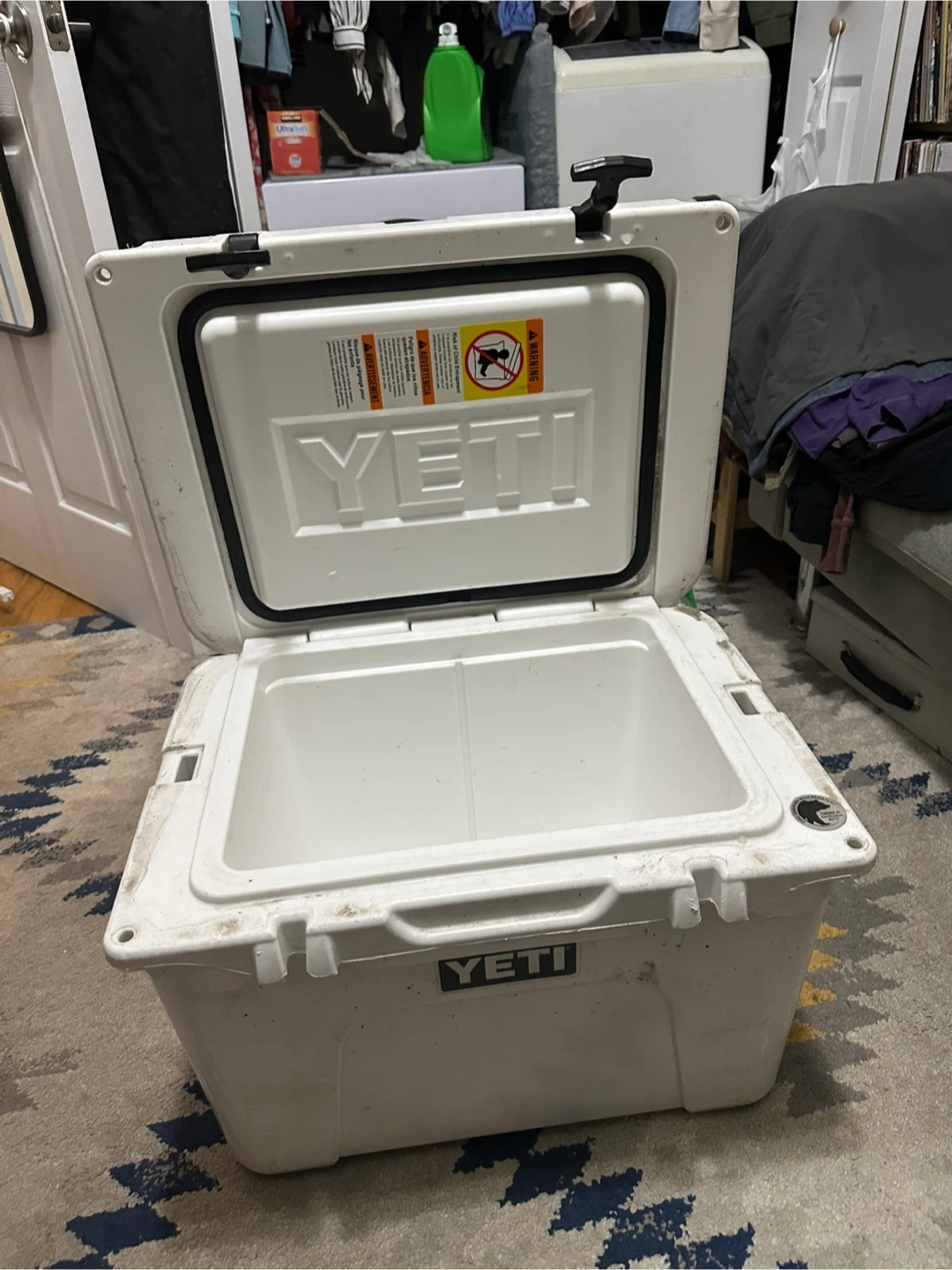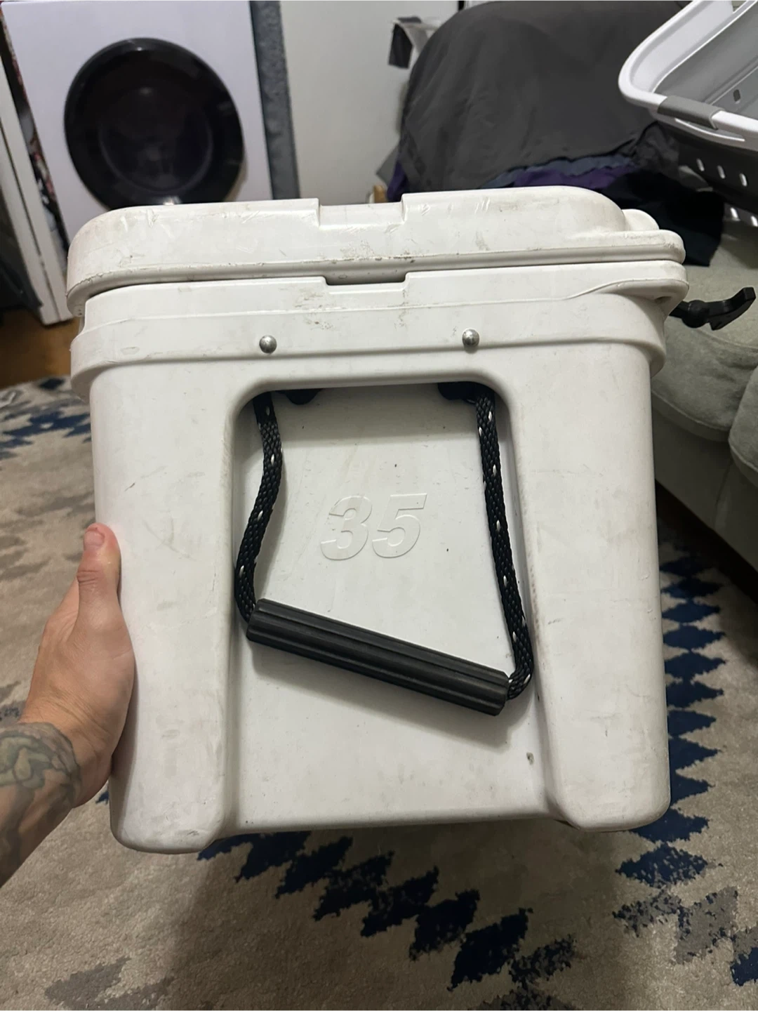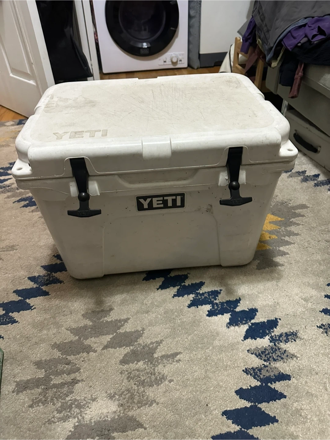 71Selling a Yeti Tundra 35 cooler in white. It's perfect for keeping your drinks and snacks cold on the go. It has some signs of wear, but is still in good working condition! Damn AI be spot on. Used but works great, used for camping and keeping cold ones cold.