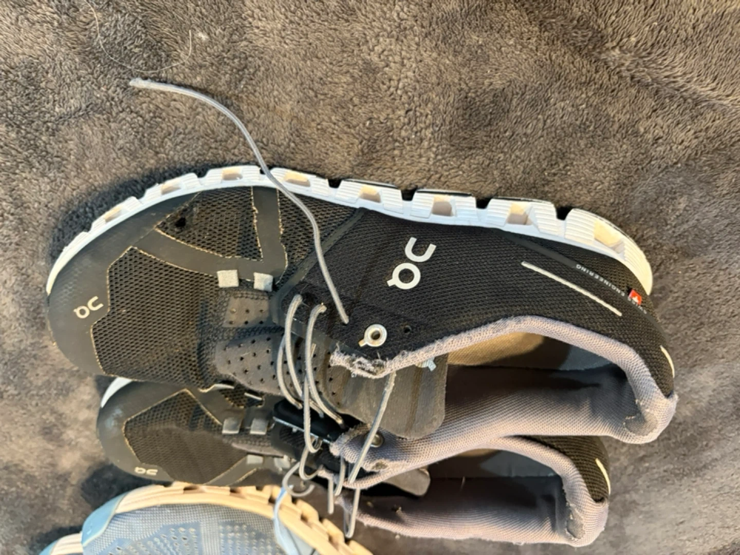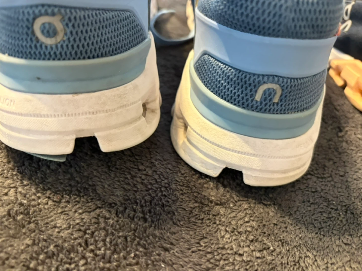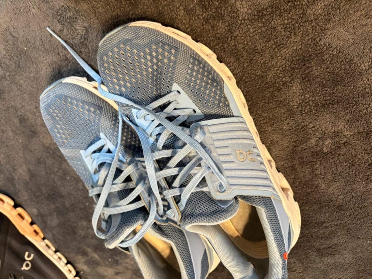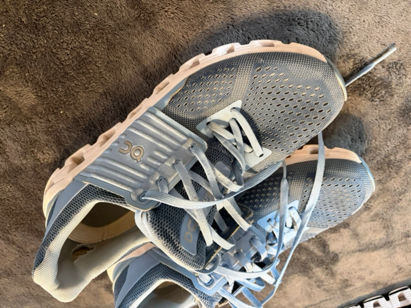 These are On Cloud running shoes. They're a blue mesh material with white soles. These shoes are great for running or everyday wear!