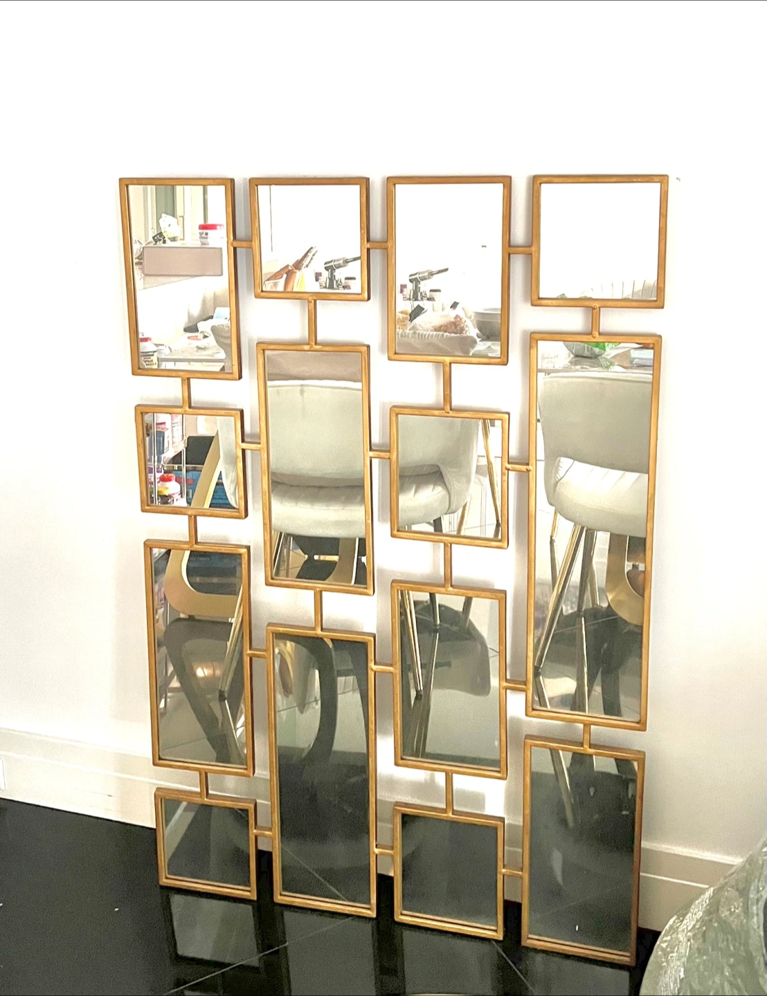 Uttermost Kennon Forged Gold Rectangles Mirror Craftily Connected Forged Iron Rectangles Finished In A Lightly Antiqued Gold Leaf. May Be Hung Horizontal Or Vertical. Dimensions: Width 32", Height 48", Depth 0.5", Weight 33Lbs It is in great condition!