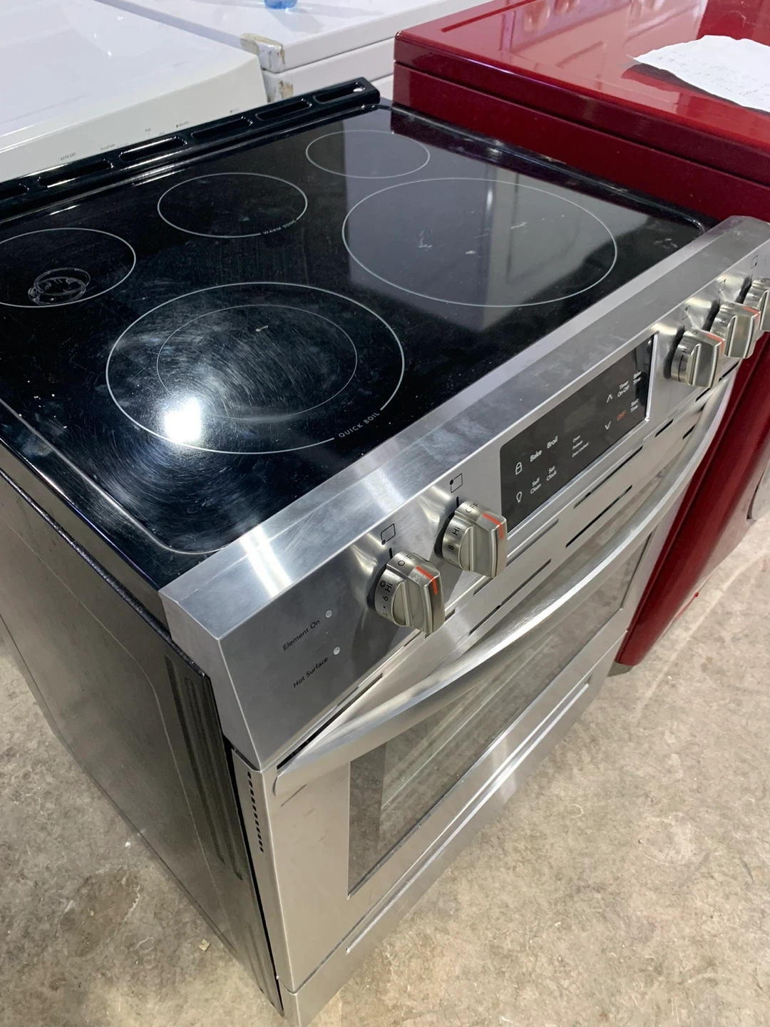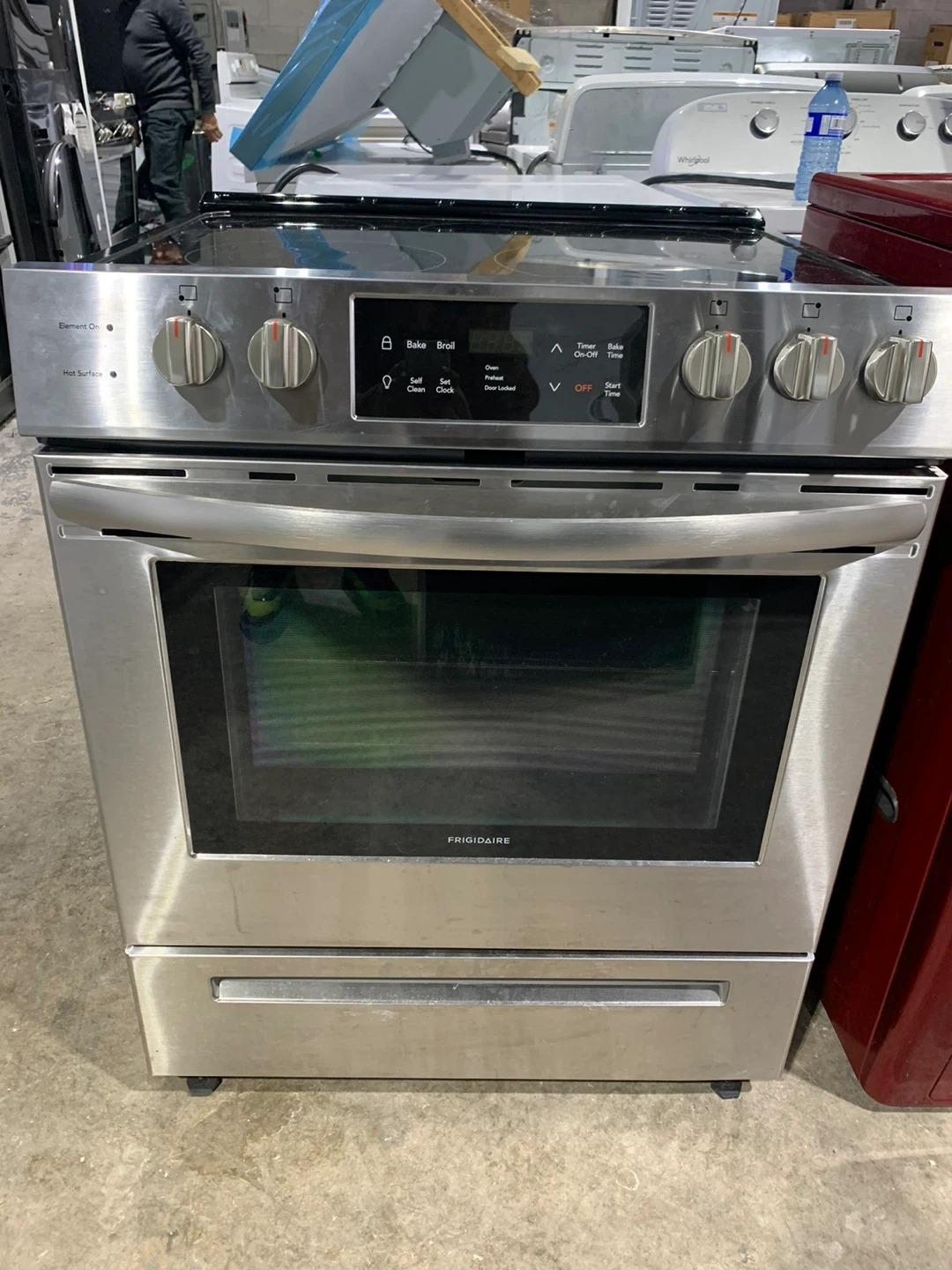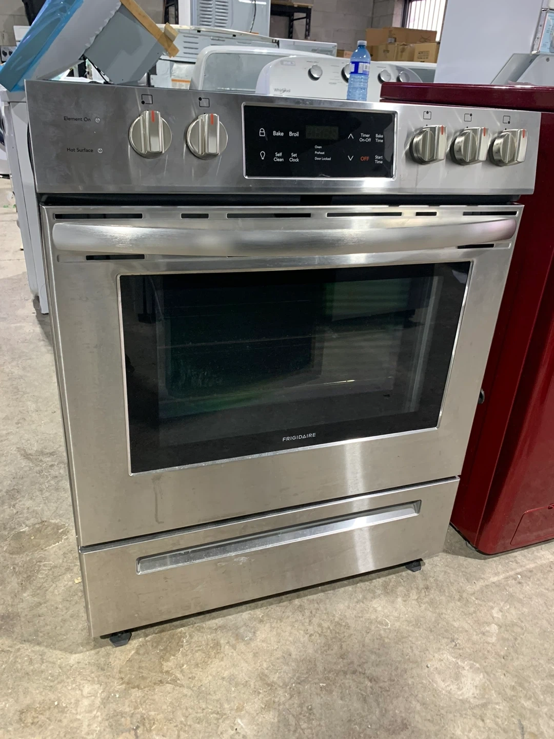 Selling a Frigidaire electric range in stainless steel. It has a glass top and digital controls. It's in good condition and ready for a new kitchen!