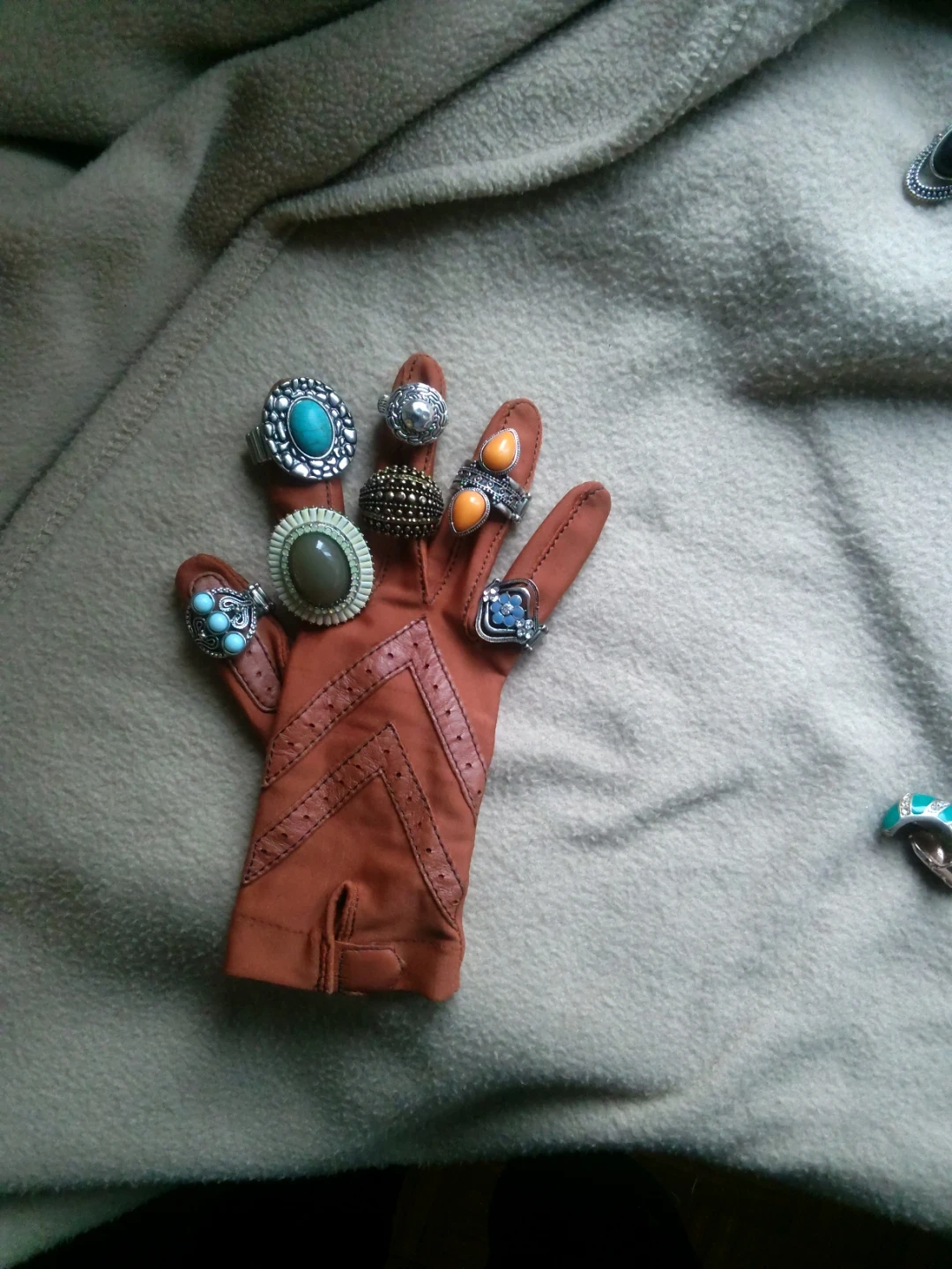 Bundle of assorted rings in silver-tone metal. Includes various designs with stones like turquoise and orange. Some feature beaded details and decorative bands.