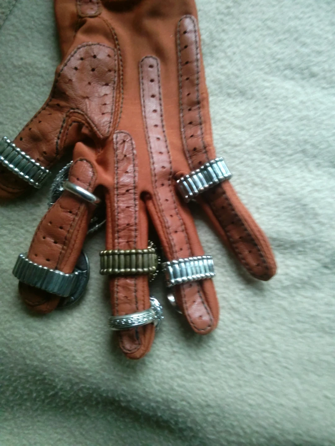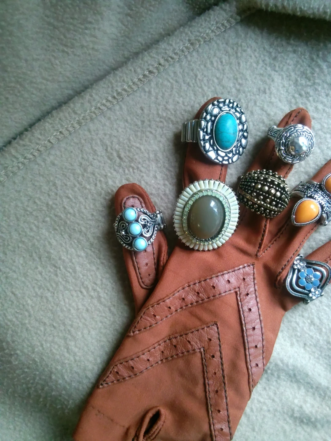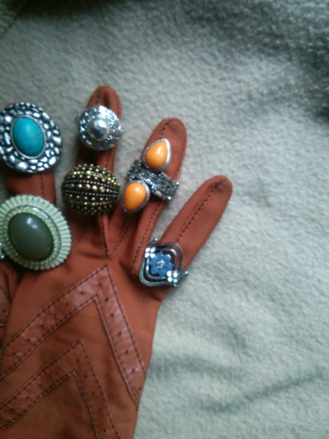 Bundle of assorted rings in silver-tone metal. Includes various designs with stones like turquoise and orange. Some feature beaded details and decorative bands.