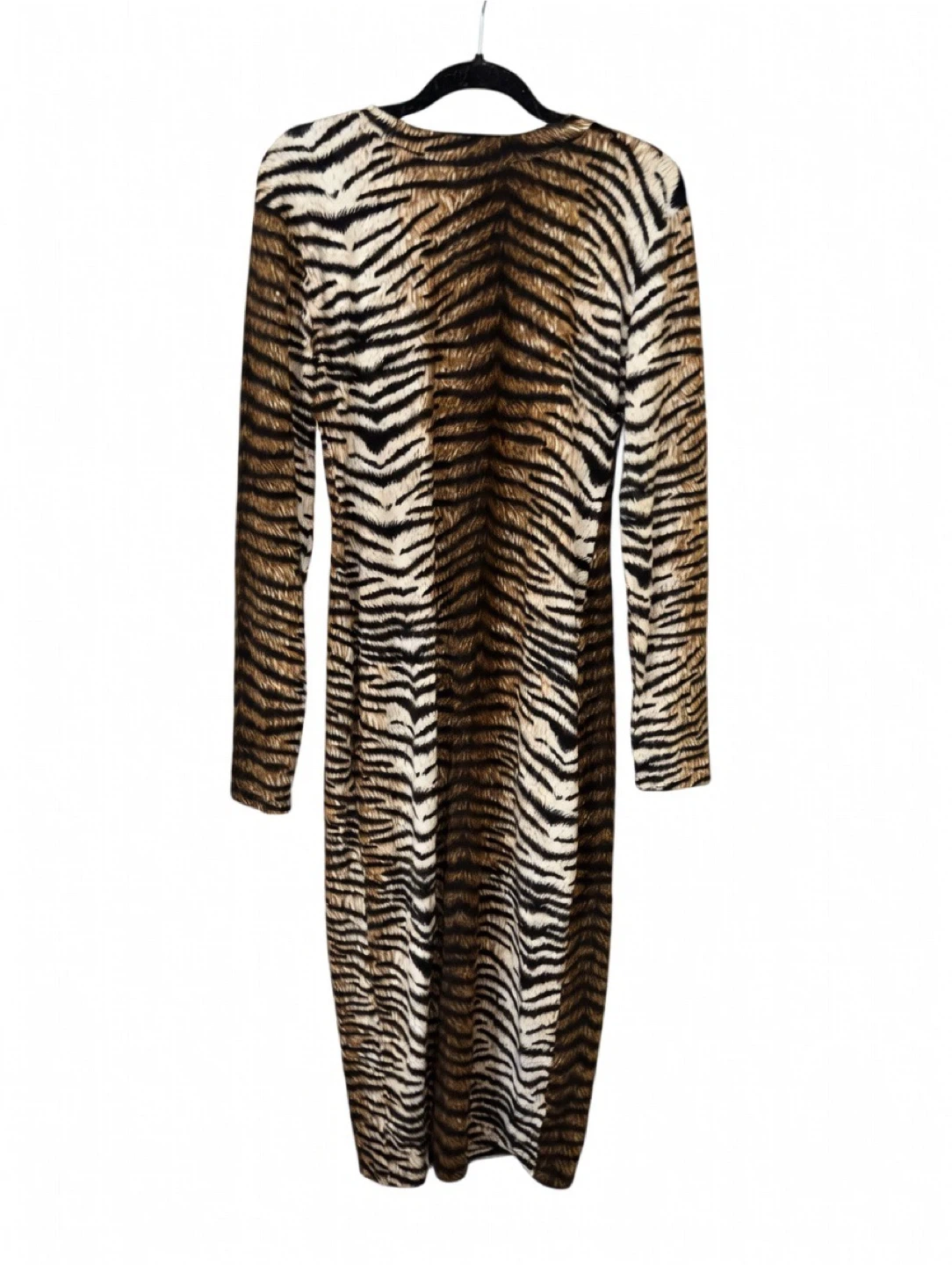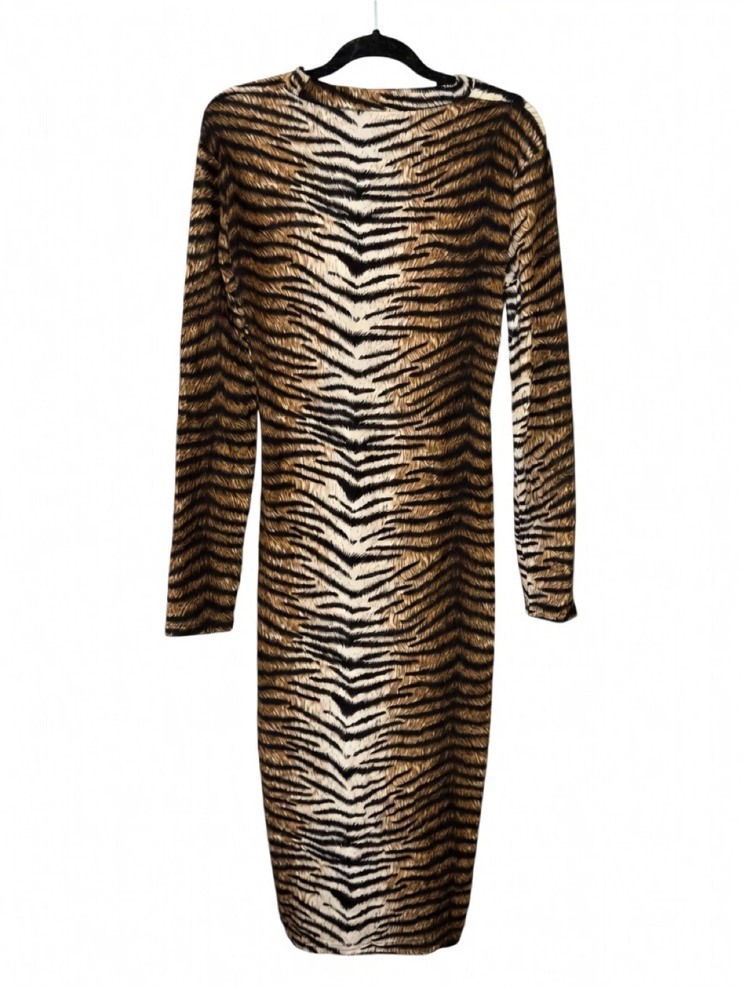 This dress features a bold tiger print with long sleeves. It's a classic sheath style. The fabric is soft and stretchy. Looks great for a night out!