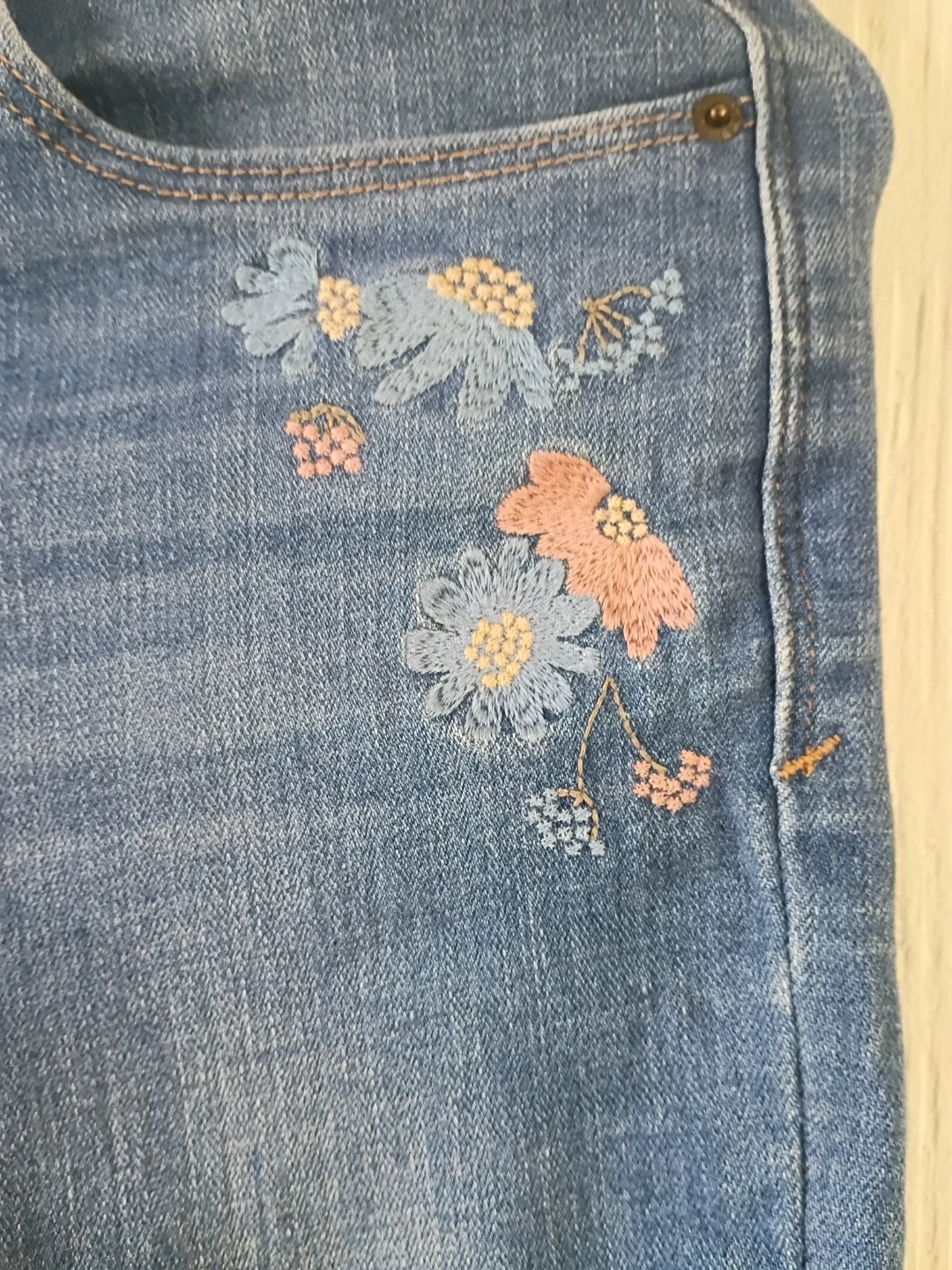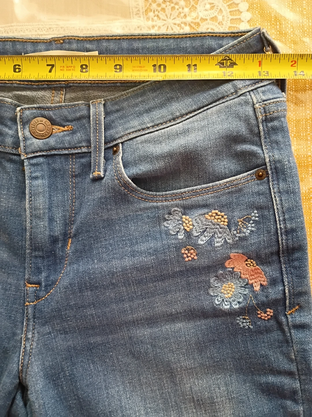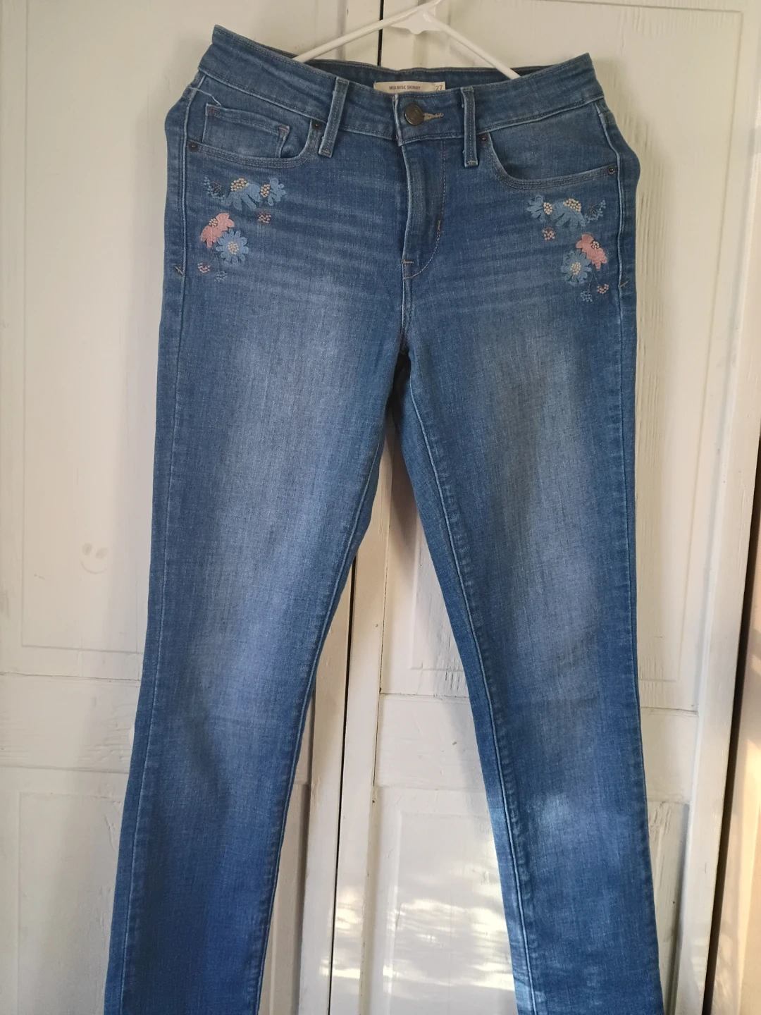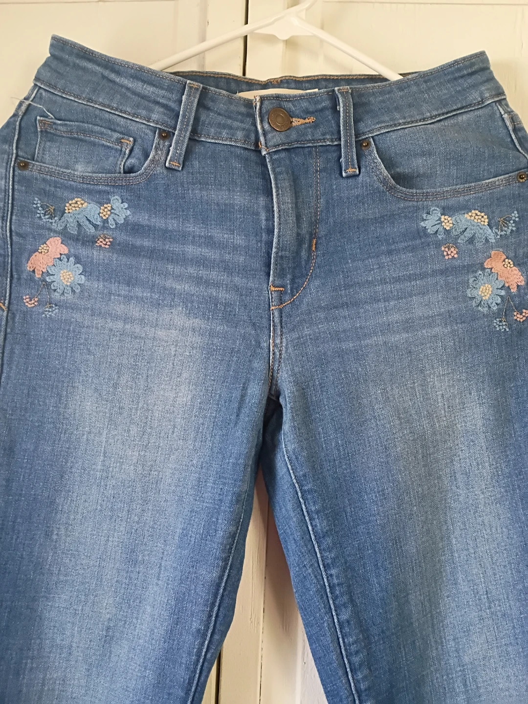 Levi's Jeans Mid Rise Skinny 27. Women's jeans with delicate floral embroidery. Soft stretch denim for comfortable all day wear. subtle pink and blue floral accents for a feminine touch.