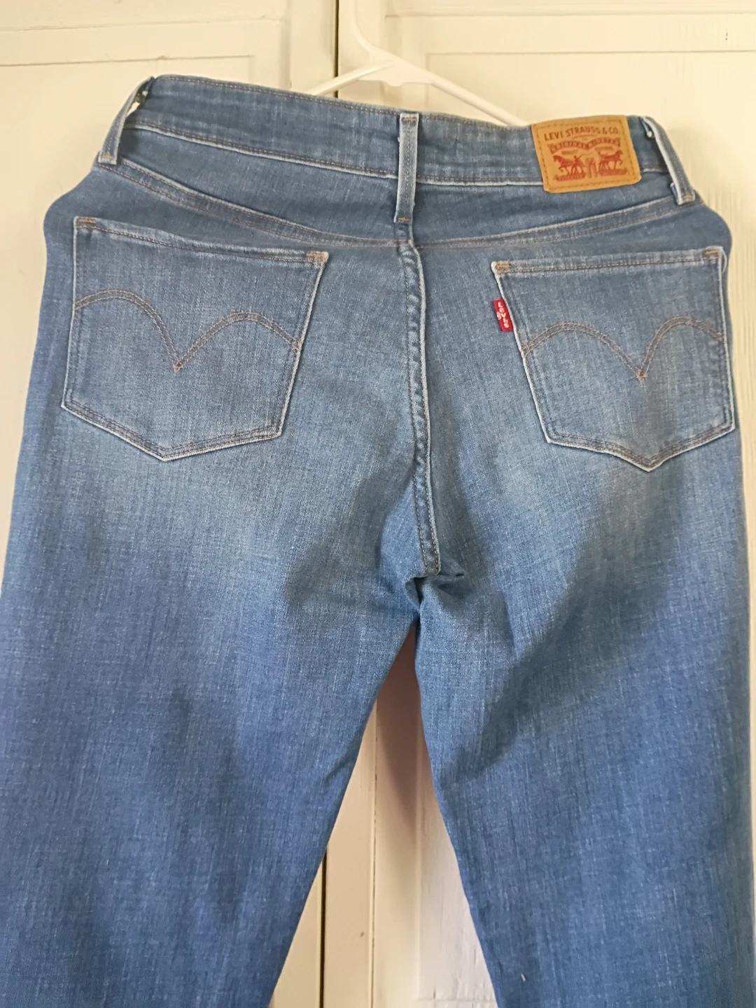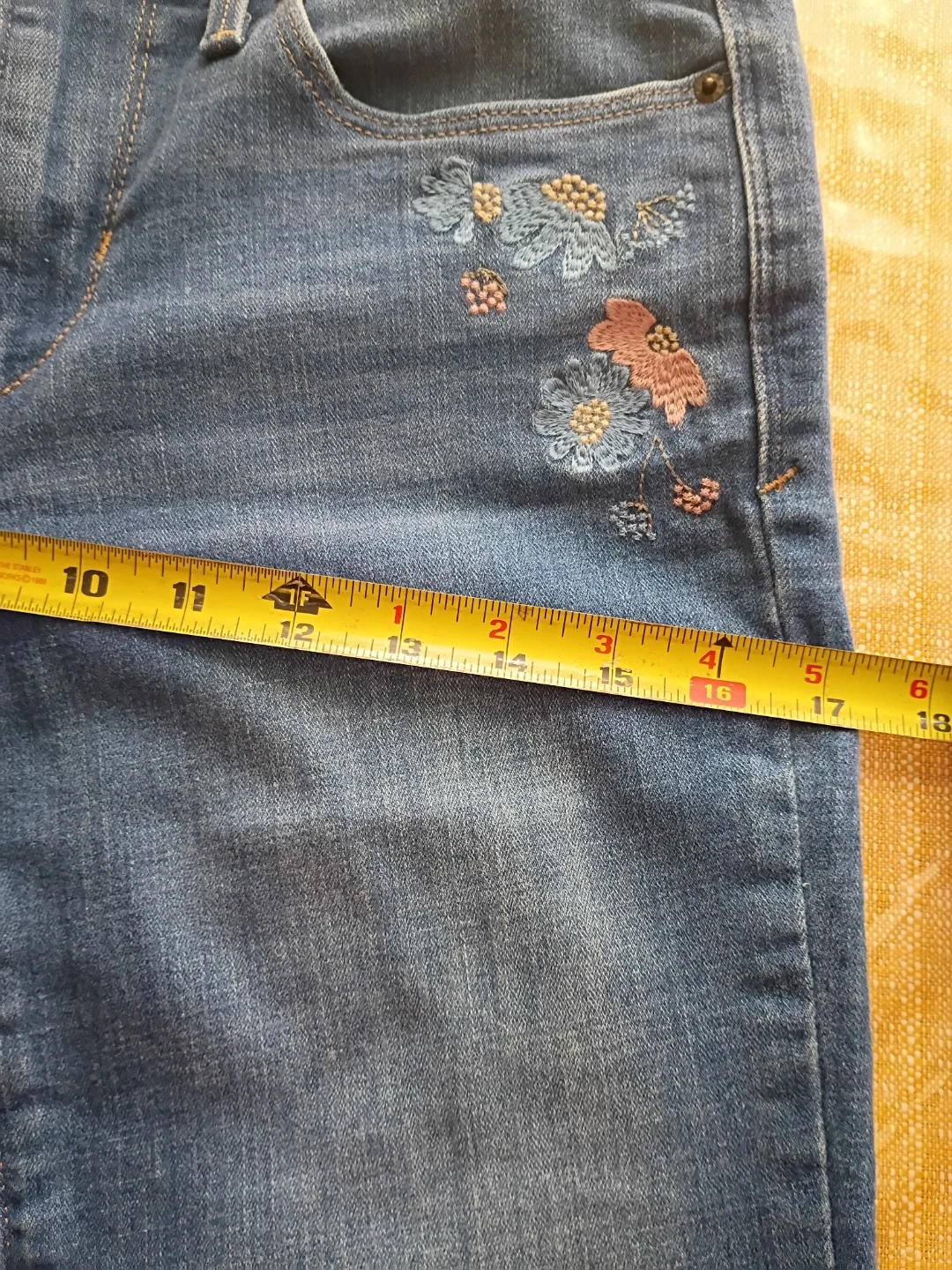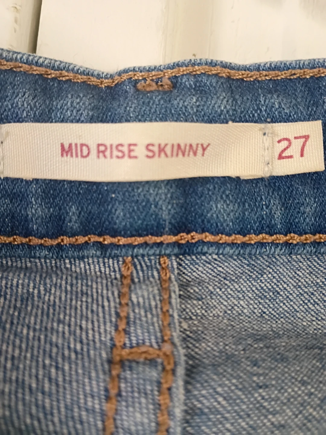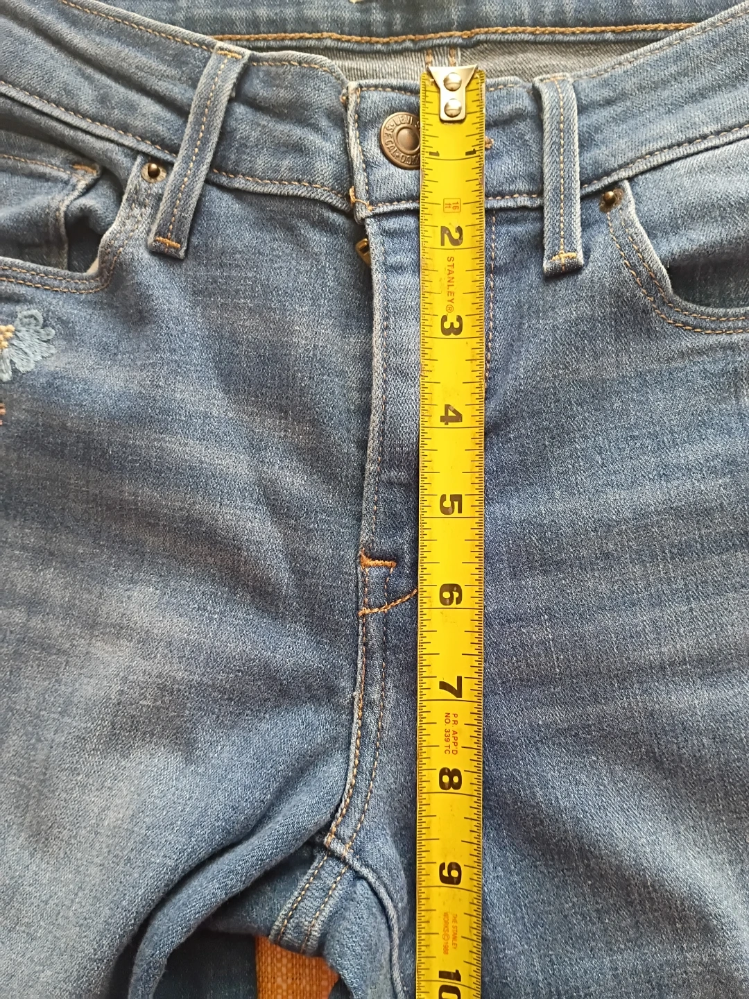 Levi's Jeans Mid Rise Skinny 27. Women's jeans with delicate floral embroidery. Soft stretch denim for comfortable all day wear. subtle pink and blue floral accents for a feminine touch.