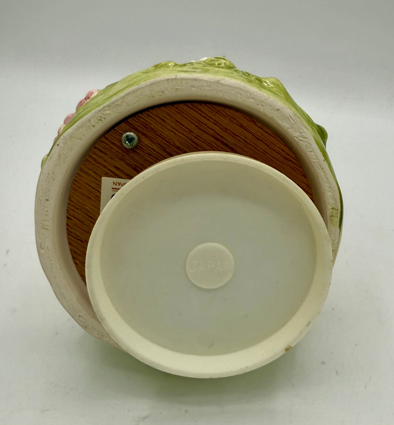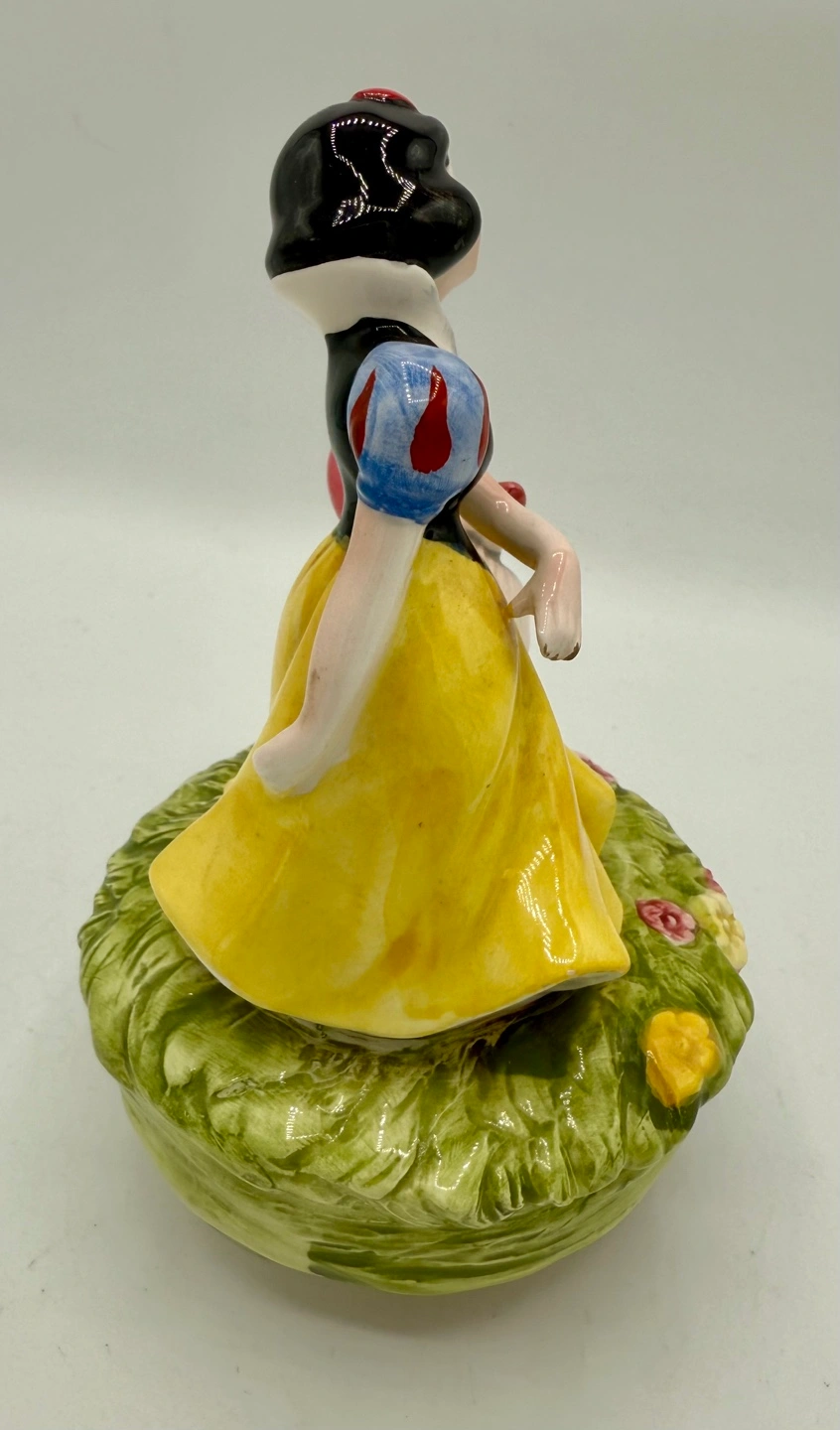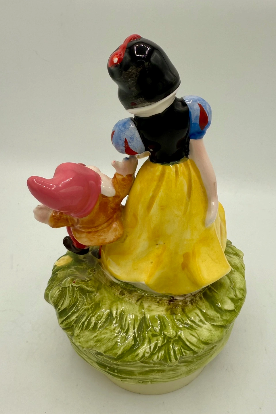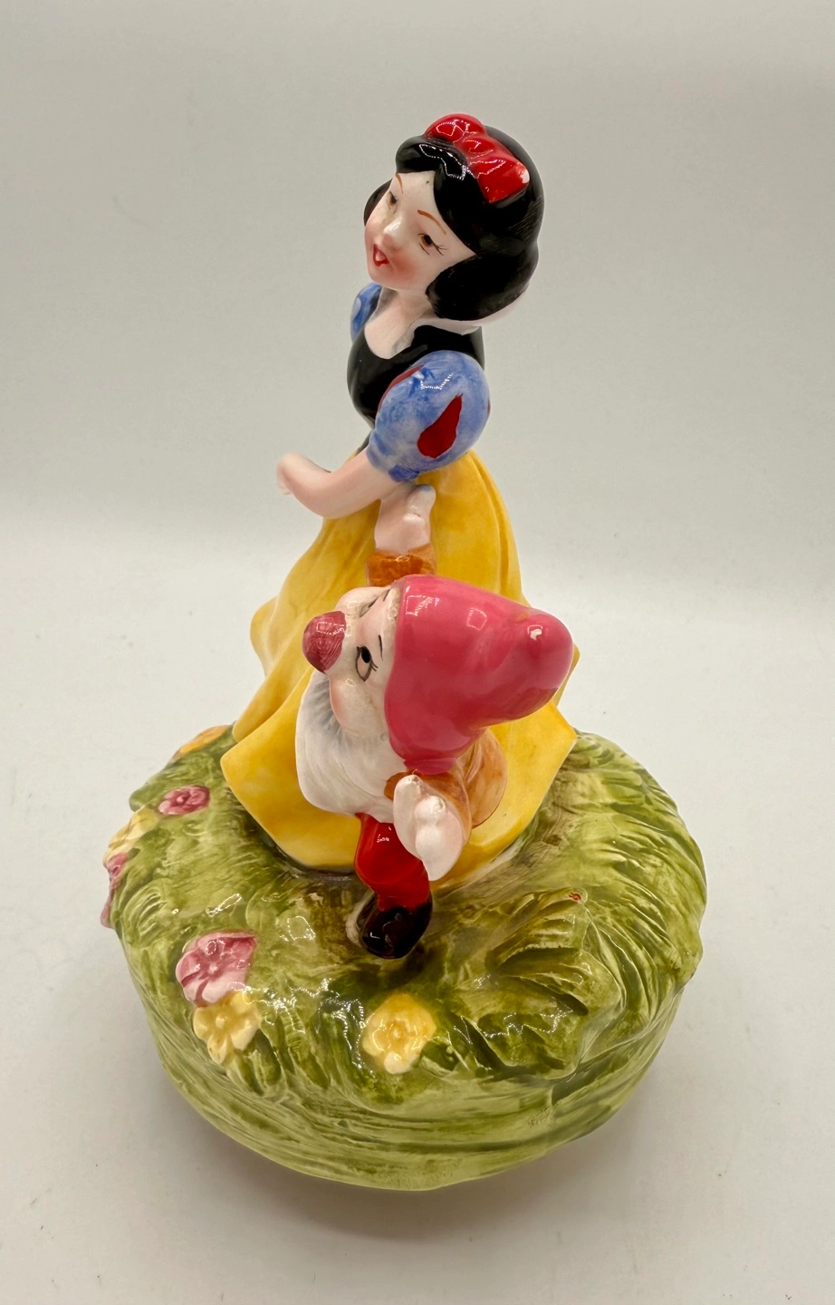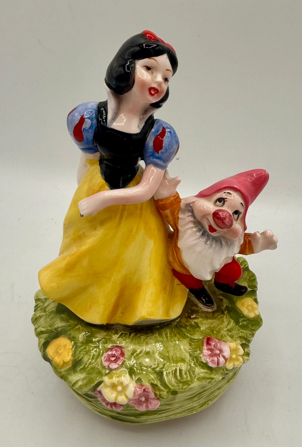 Adorable vintage musical figurine. Features Snow White and Dopey. Ceramic construction. Plays music when wound. Made in Japan.