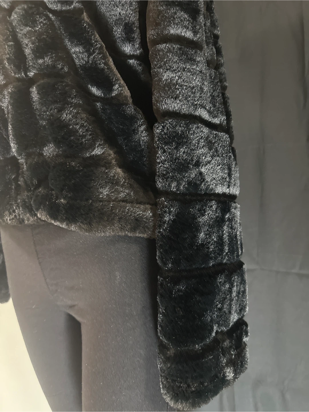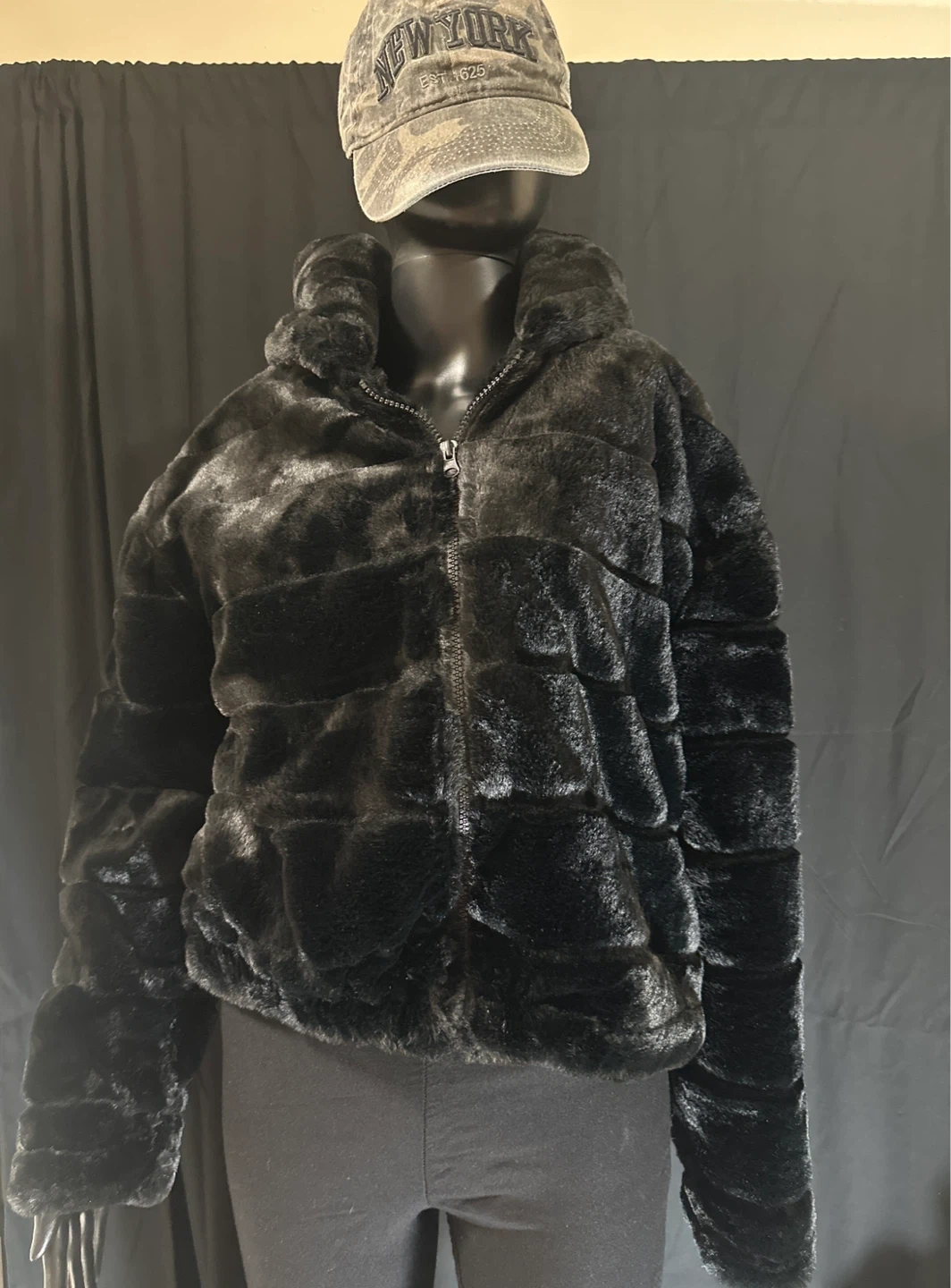 Cozy black faux fur jacket with a hood. It's fully lined and features a zipper closure. Material is polyester.