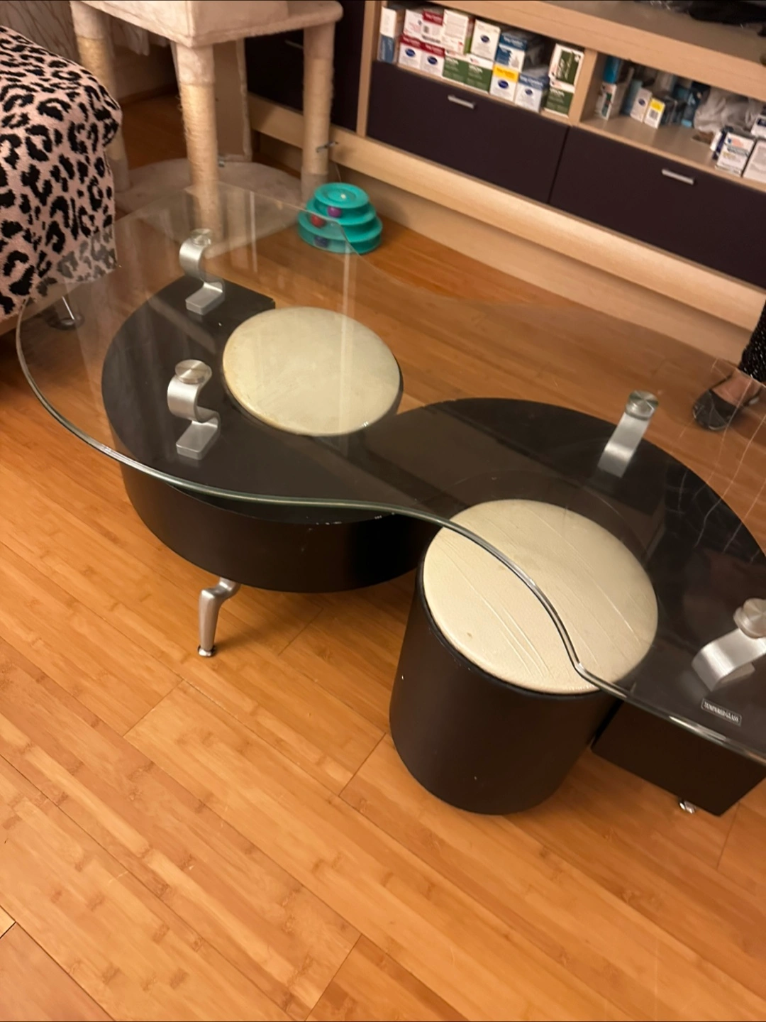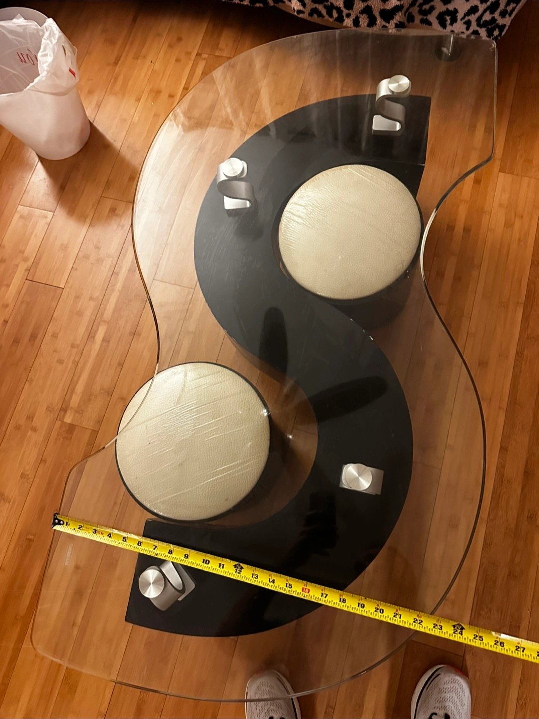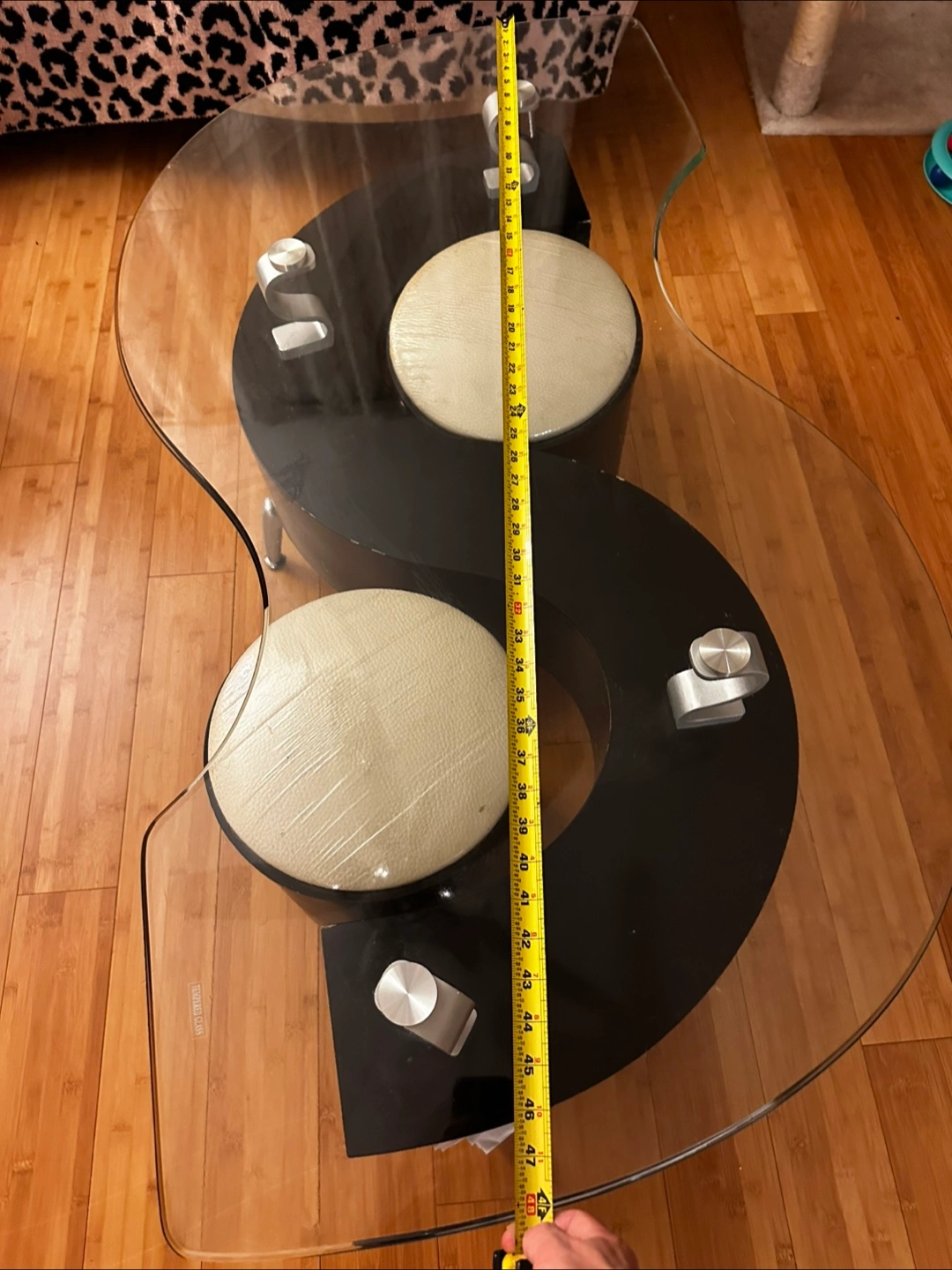 Selling a unique Yin Yang style coffee table! It features a glass top with two cushioned seats integrated into the design. It measures approximately 47 inches in length and 27 inches in width, making it a statement piece for any living room