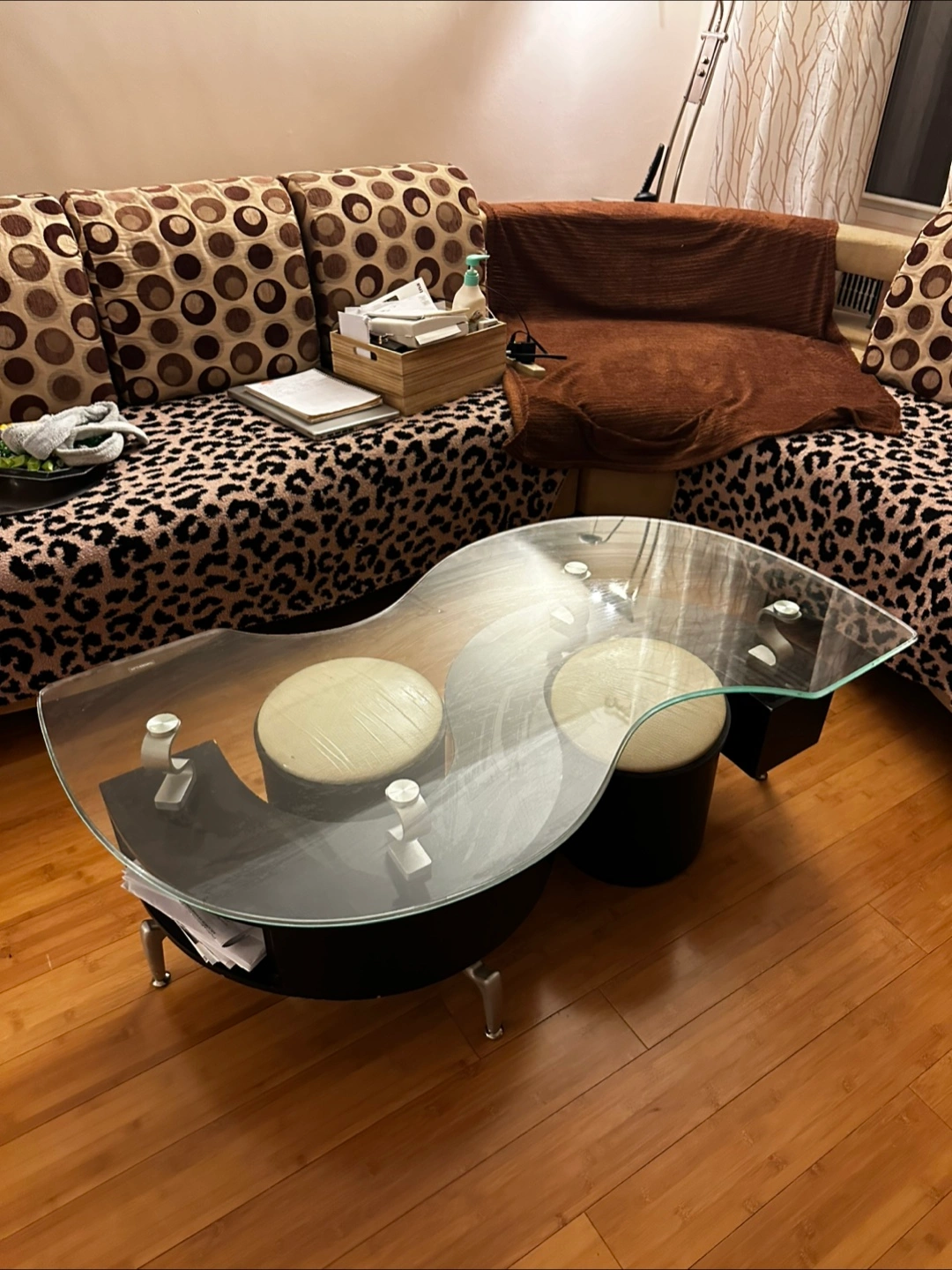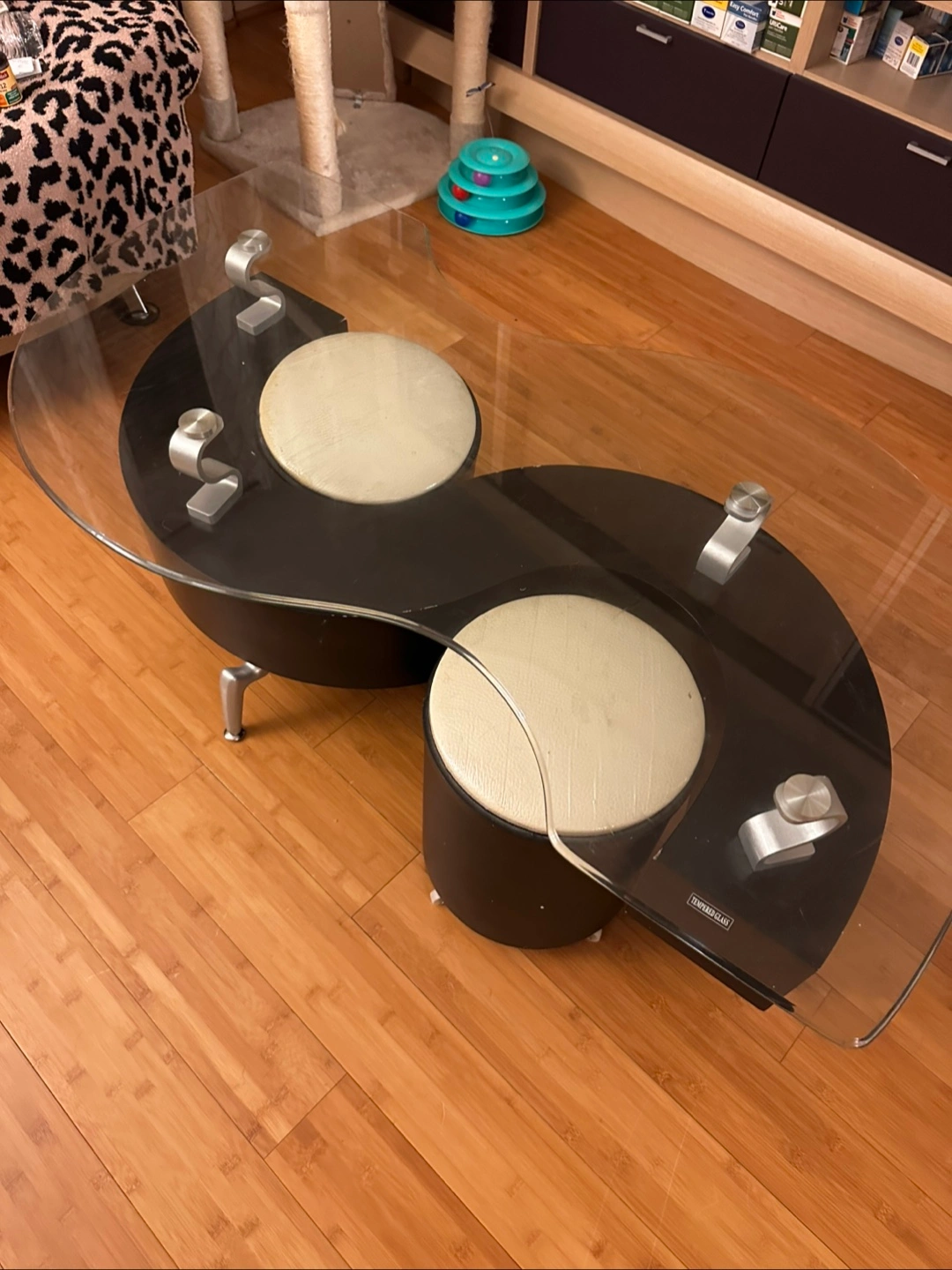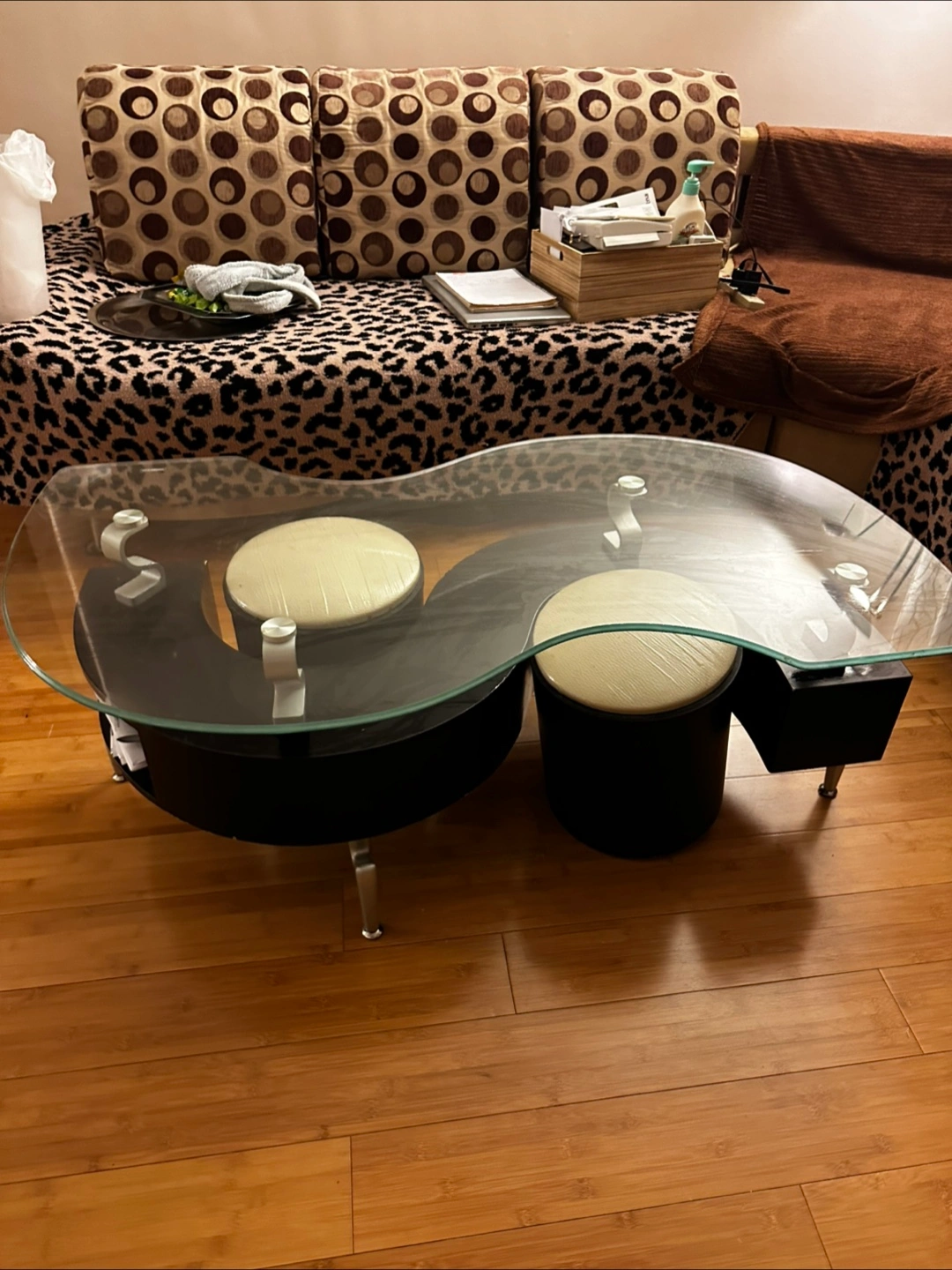 Selling a unique Yin Yang style coffee table! It features a glass top with two cushioned seats integrated into the design. It measures approximately 47 inches in length and 27 inches in width, making it a statement piece for any living room