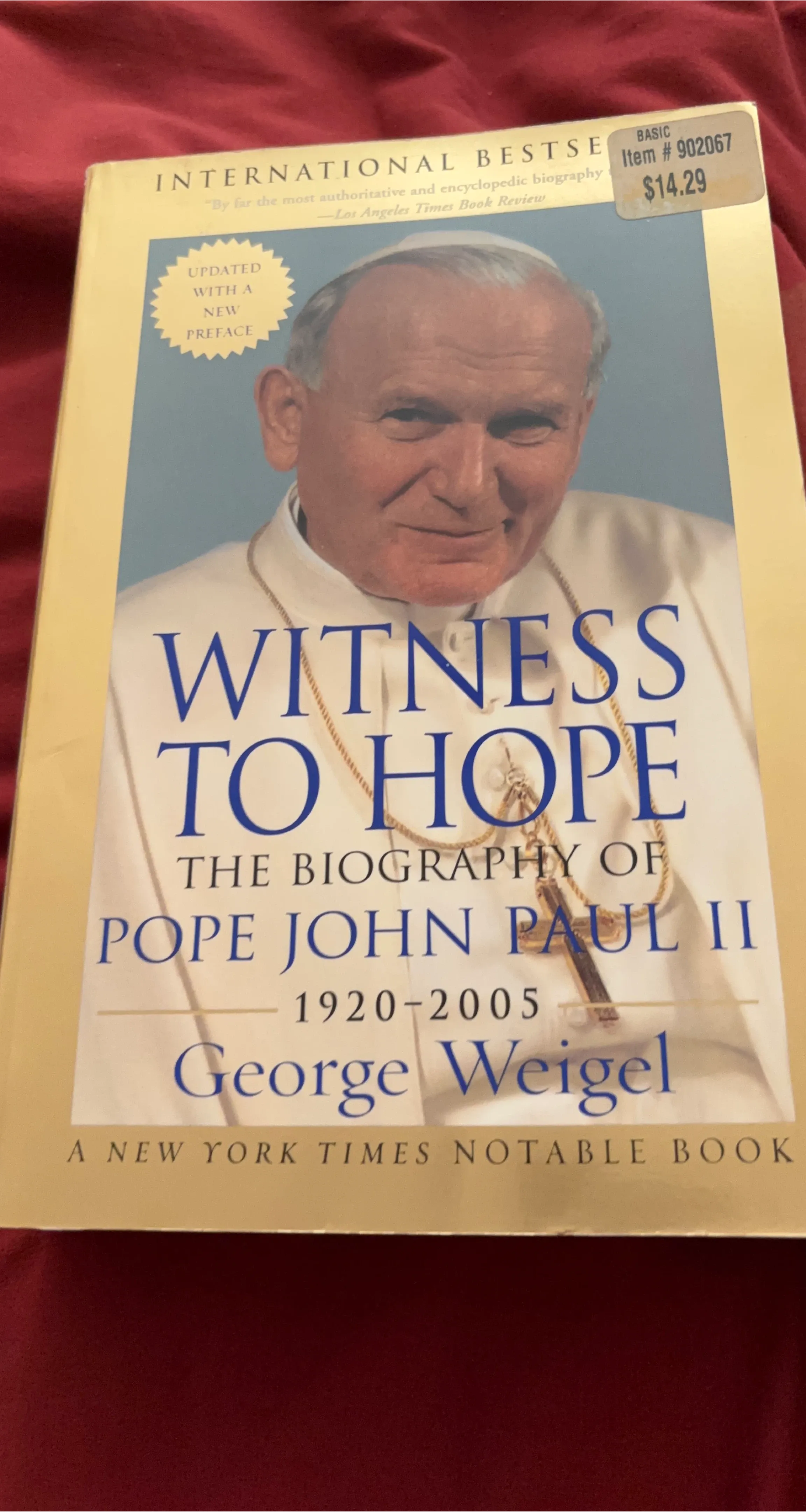This is the "Witness to Hope" biography of Pope John Paul II by George Weigel. It covers the years 1920-2005 and is updated with a new preface. It's also noted as a New York Times Notable Book.