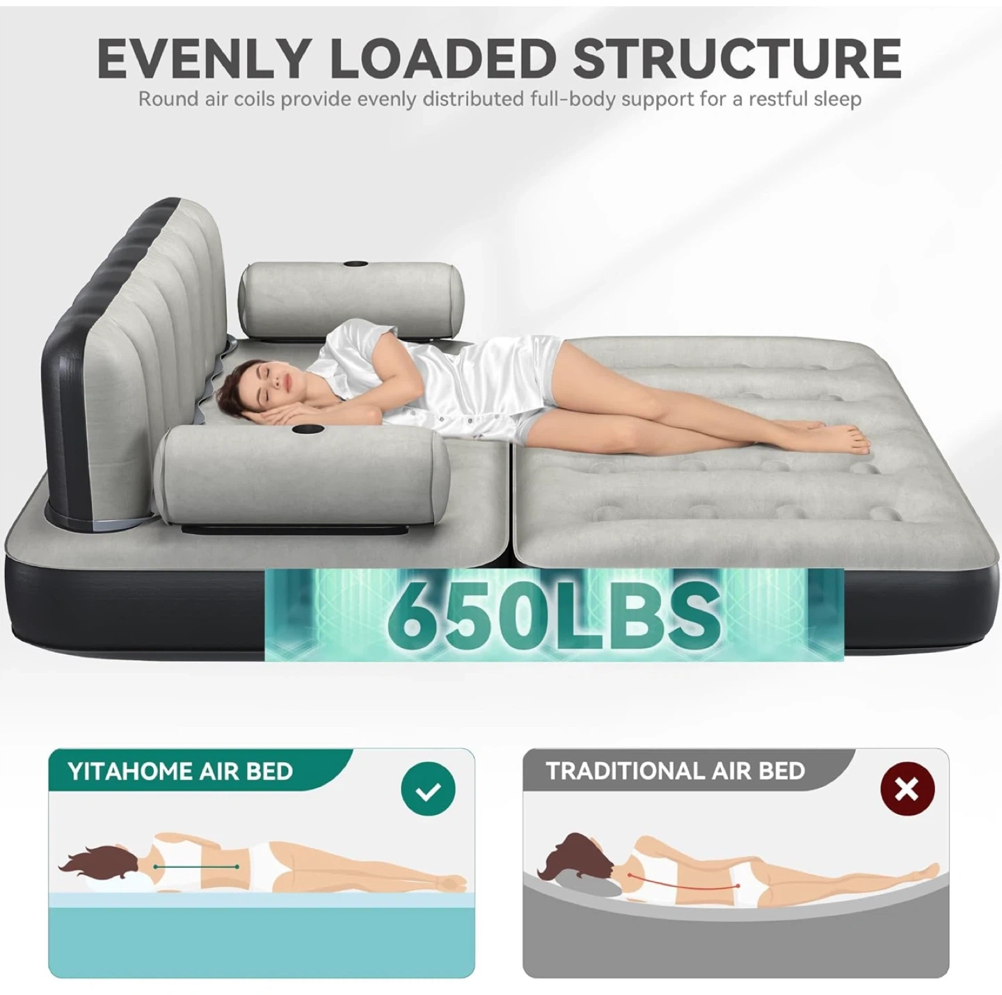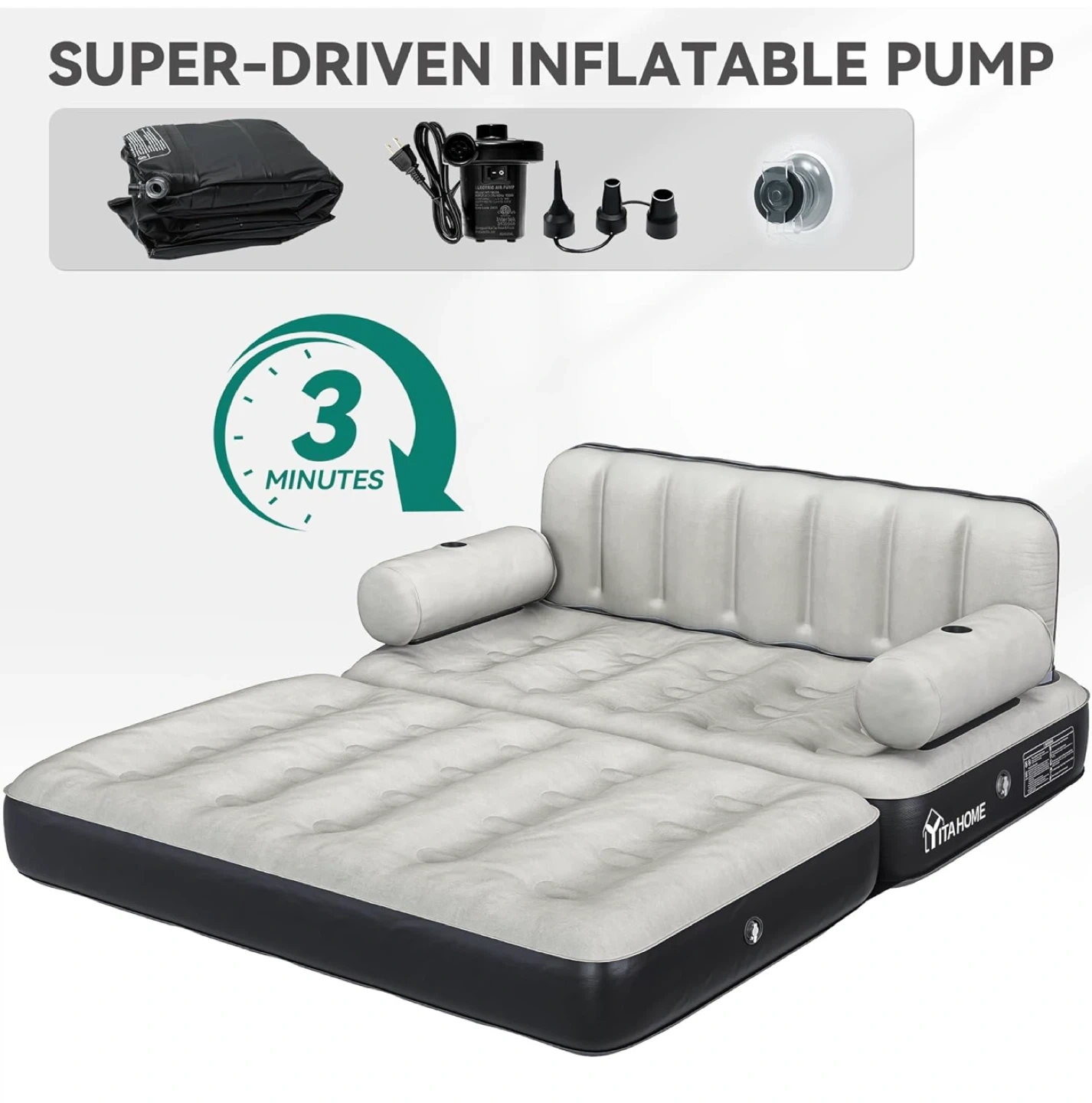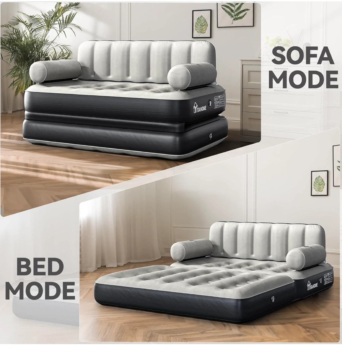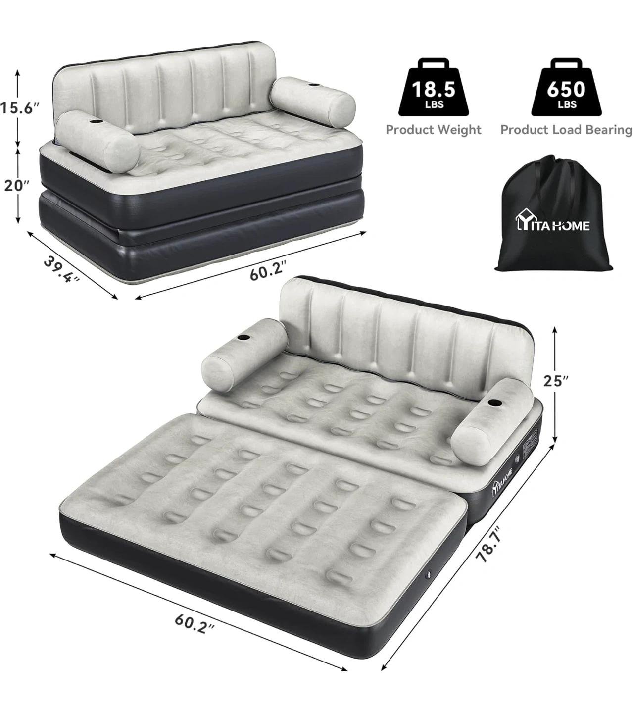 Convertible sofa bed from YItaHome, perfect for guests or small spaces! It easily transforms from a sofa to a bed, offering versatility and comfort. Key features: - Dimensions: 60.2" x 39.4" x 20" (sofa mode), 60.2" x 78.7" x 25" (bed mode) - Includes a 2-cup-holder design for convenience - Comes with a super-driven inflatable pump for quick setup in just 3 minutes - Supports up to 650 lbs - Lightweight at 18.5 lbs