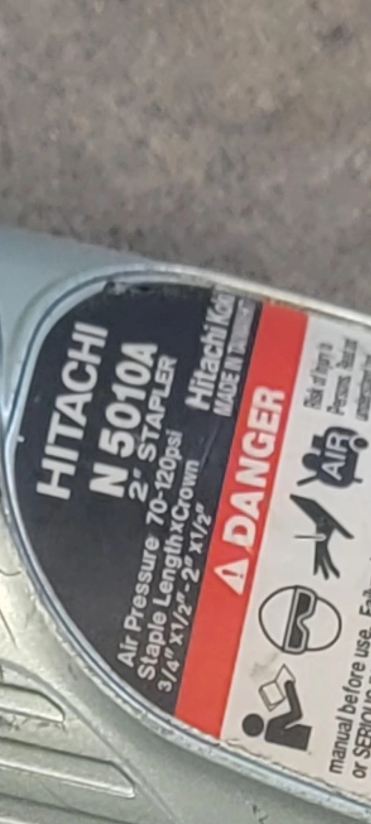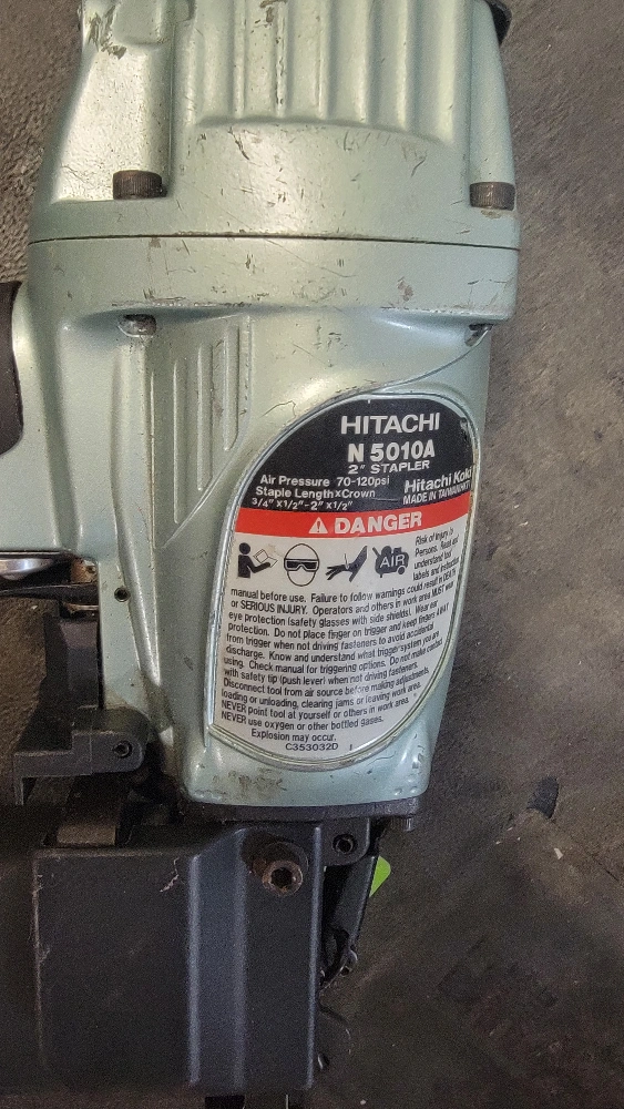 Selling a Hitachi N5010A 2" stapler. It uses air pressure between 70-120 psi. Staple Length/Crown: 3/4" x 1/2" - 2" x 1/2".