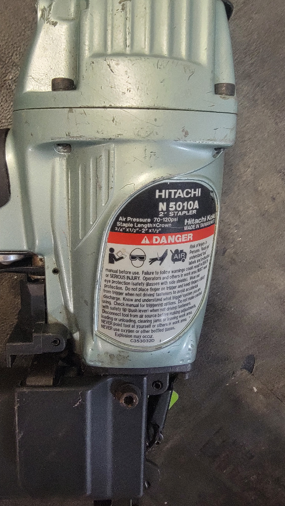 Selling a Hitachi N5010A 2" stapler. It uses air pressure between 70-120 psi. Staple Length/Crown: 3/4" x 1/2" - 2" x 1/2".